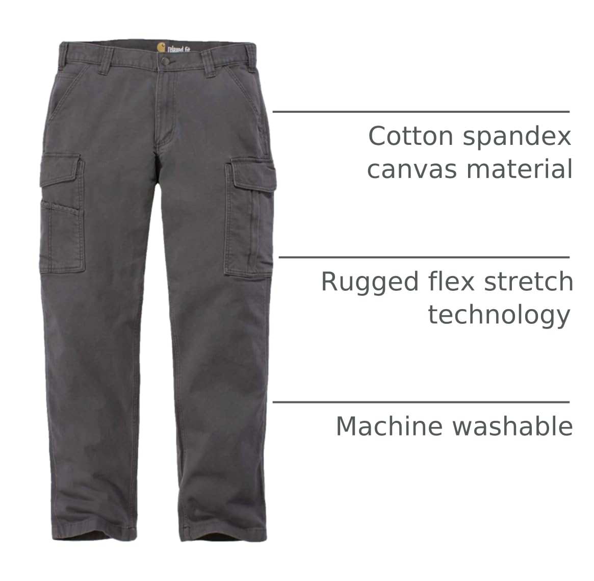 Description Built to move, these men's Carhartt pants are also rugged enough to handle the demands of your workday. Made from durable midweight canvas with a relaxed fit and straight leg opening. Includes side, back, and cargo pockets, including secure storage for your phone. 8-ounce, 98% cotton / 2% spandex canvas. Built to move with Rugged Flexยฎ stretch technology. Relaxed Fit: Comfortable fit through the seat and thigh with more room to move and a straight leg opening. Strong sewn-on-seam belt loops. Right-leg cargo pocket with secure cell phone storage. Left-leg cargo pocket with utility pocket. Hook-and-loop back pockets.
