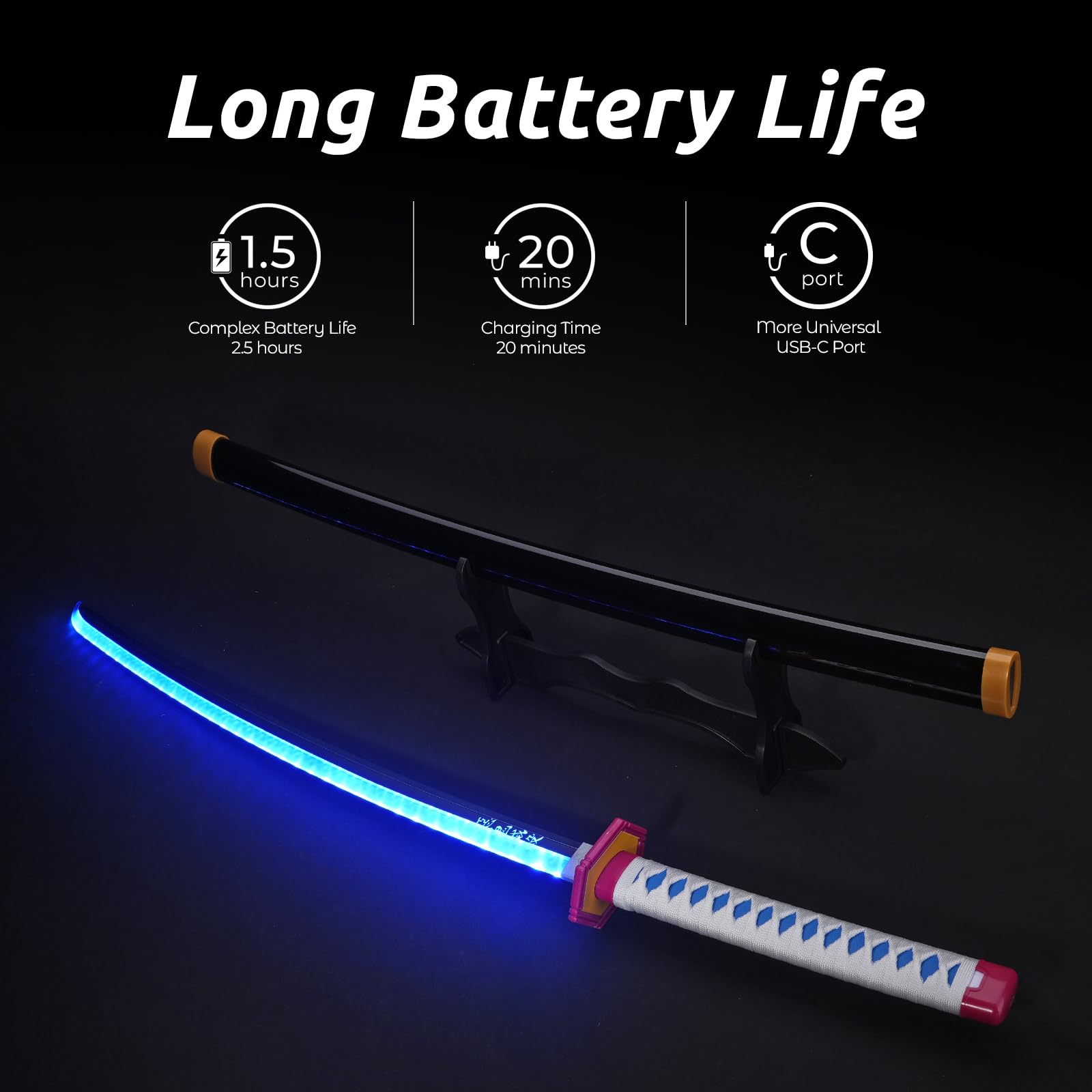 [Complete Set] The package includes: Light-Up Sword x1, Adjustable Sword Belt x1, Sword Stand x1, and USB-C Charging Cable x1, providing everything you need for an epic adventure right out of the box.