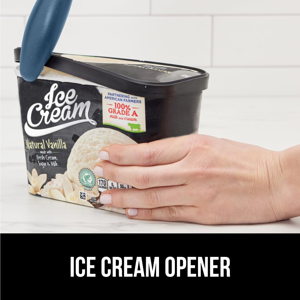 INNOVATIVE DESIGN: this ice cream scoop features flat edges to help you get more ice cream along the sides of the carton, as well as grooves that help release the ice cream easily; there is also a notch on the handle that will assist you in opening stubborn or frozen shut container lids