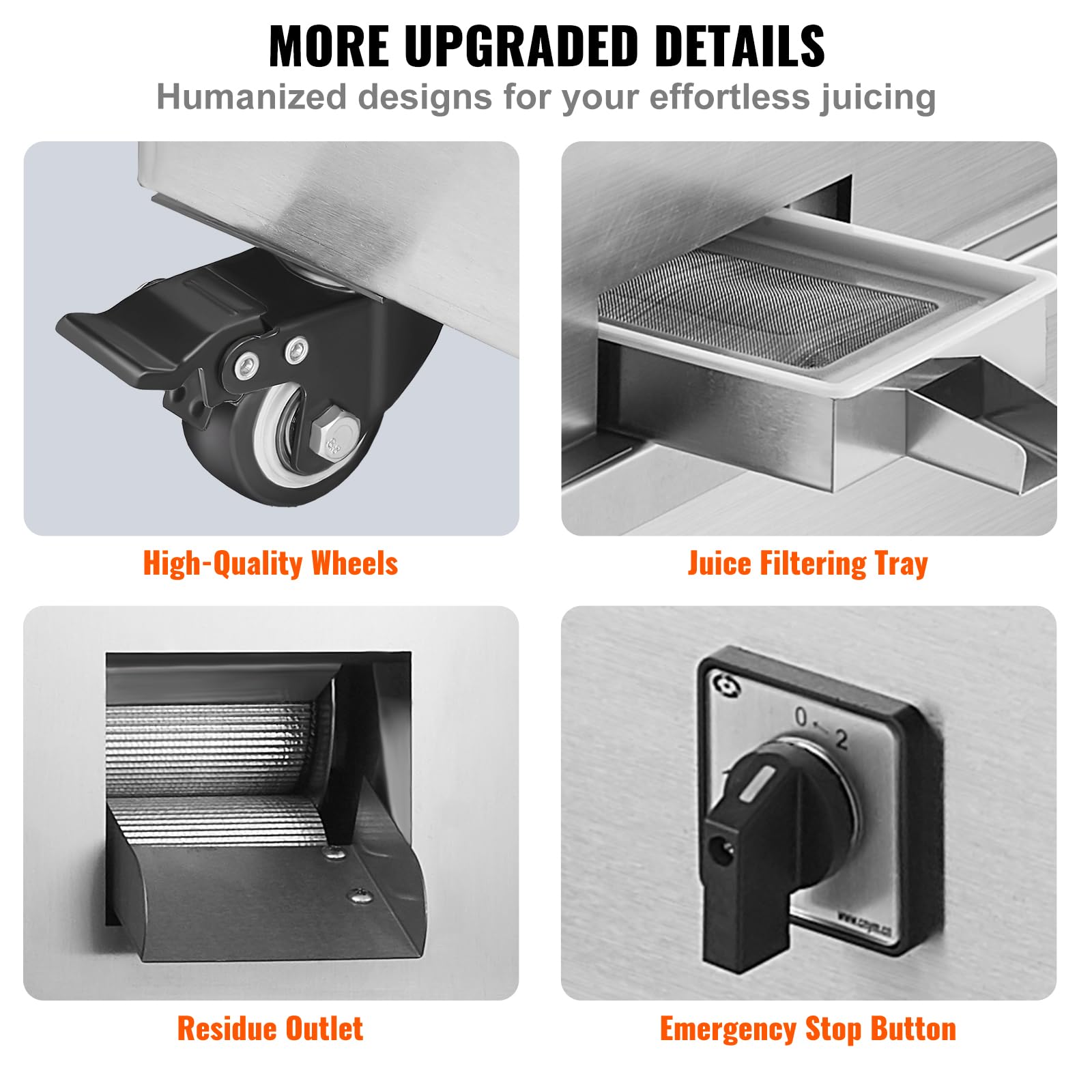 Efficient Juicing Productivity: VEVOR electric sugar cane juicer is equipped with 800W powerful motor, along with 3 solid stainless steel rollers, making sugarcane juicing more effortless and efficient. 661LBS/H high productivity maximizes juice output and efficiency.