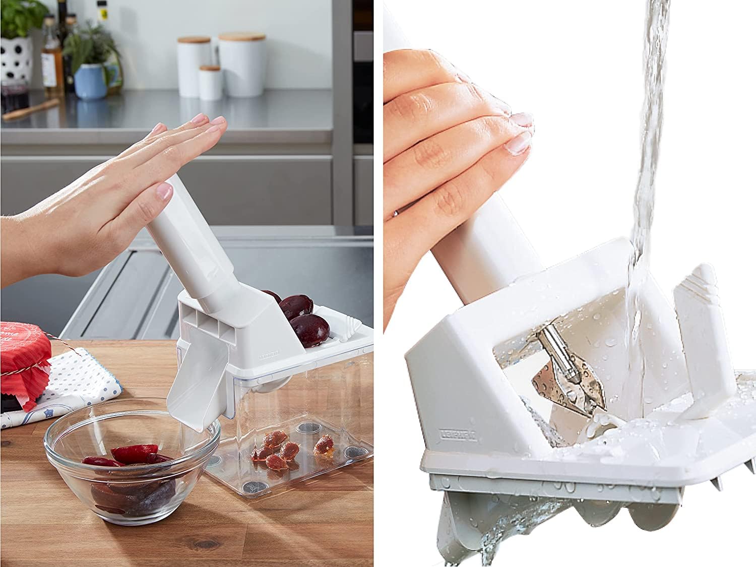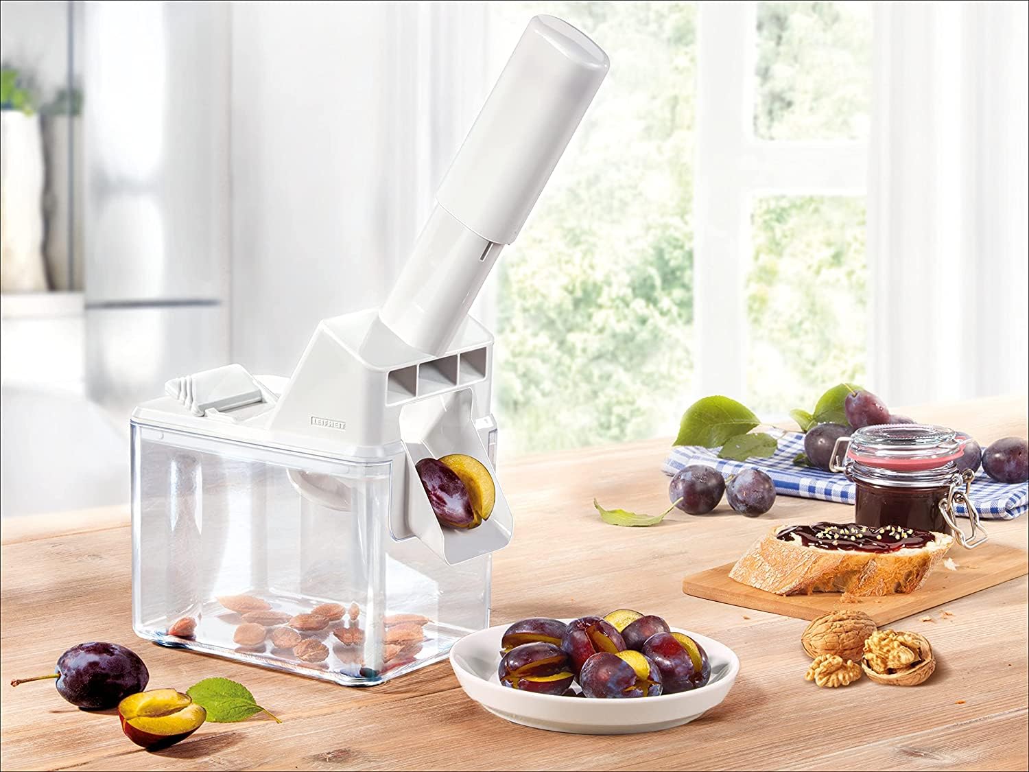 Leifheit's Plum Pitter offers the most efficient way to stone plums. The plum pitter rapidly removes pit from plum. A stainless steel plunger separate the plums into stones and fruit pulp. The stone is captured in the container and the fruit pulp into a bowl. Clean with warm water. 3 year warranty. Color: white