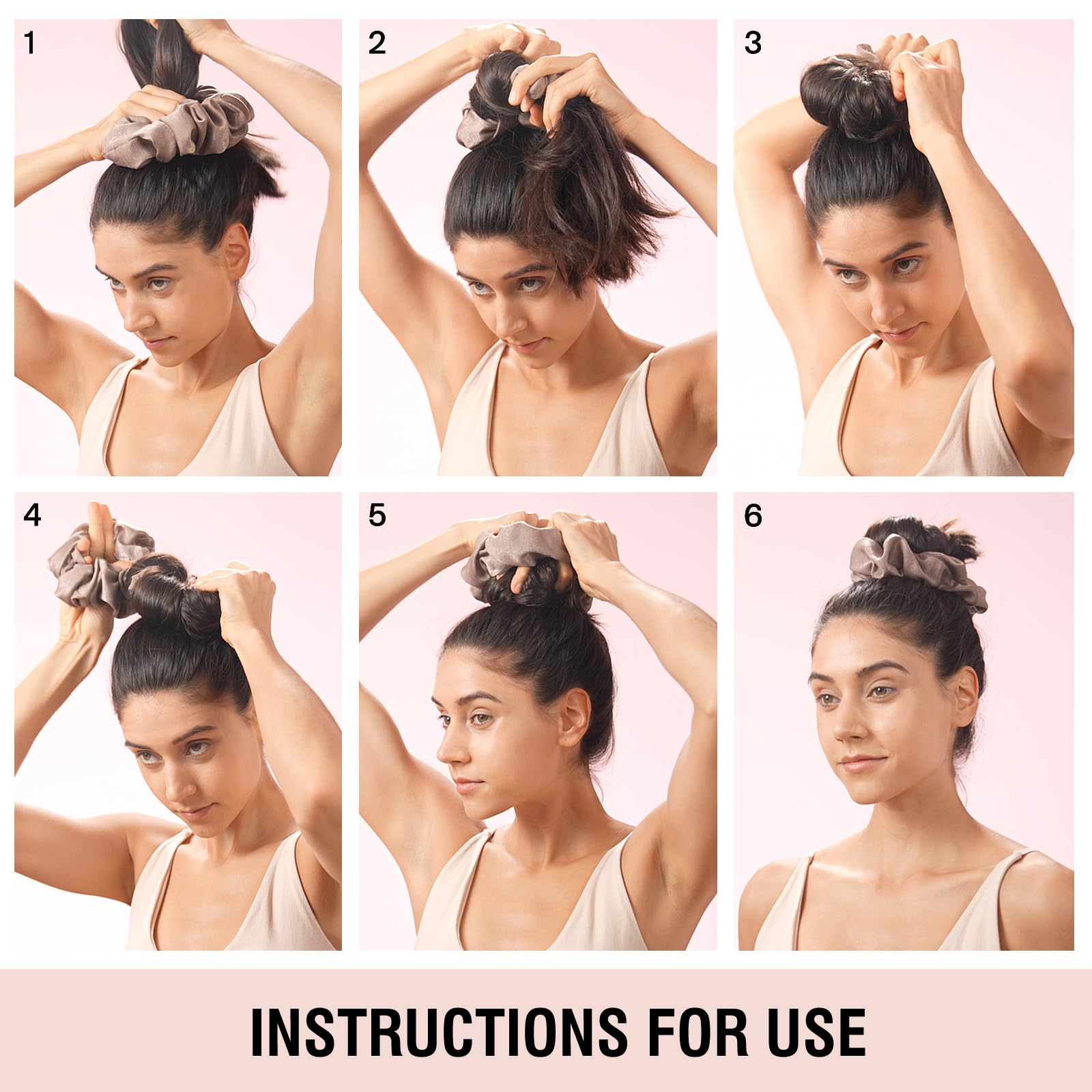 【HOW TO USE】1. Brush your hair dry; 2. Gather your hair Into a high ponytail ; 03. Place sleep hair tie around your wrist ; 4. Pull up your ponytail; 5. Loop your ponytail around the arch ; 6. Pull tightly for optimal results and continue wrapping; 7. Twist The scrunchie in a figure eight to secure your wrapped hair; 8. Go to sleep and wake up with a perfect hair.
