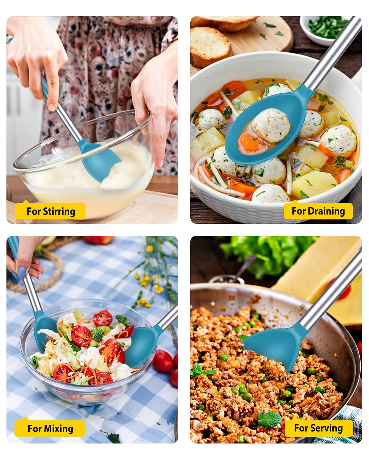 Just Want To Provide The Ideas For You : Large cooking spoon used to hold food more convenient; Slotted Spoon can quickly drain the water; Whether it is used for draining or serving food, our large silicone cooking spoon will add more fun to your kitchen