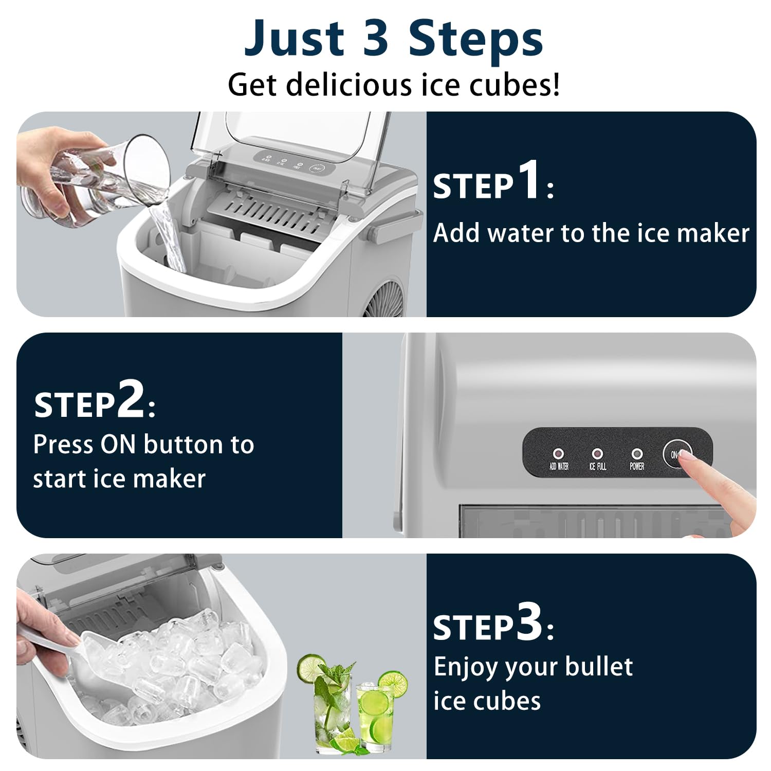 Easy to Use: This machine has a simplified design that makes it easy to operate. Just fill the 1.2-liter water tank and press "on" to start making ice. When the water is insufficient, the indicator light will automatically light up.