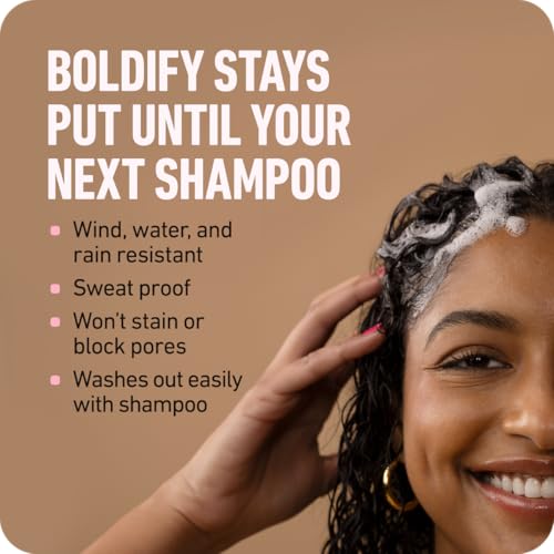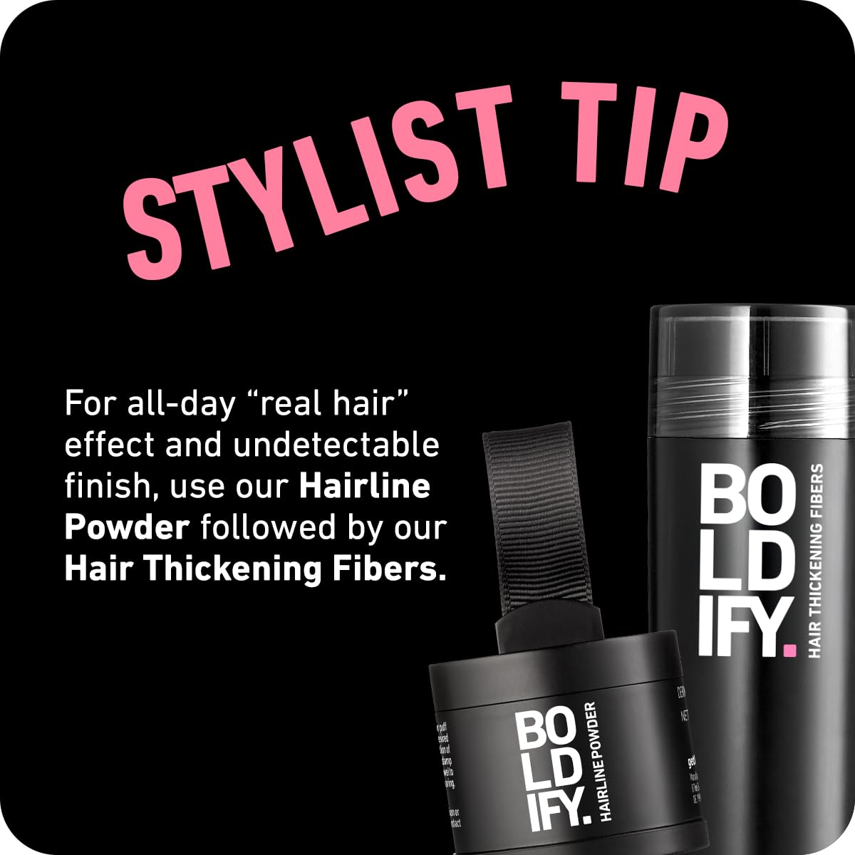 INSTANTLY FILL IN THINNING HAIR WITH UNDETECTABLE FINISH: Formulated with skin safe ingredients and mineral colorants, Boldify Hair Thickening Fibers bond seamlessly to existing hair for a real hair effect that's invisible to the eye. Perfect for enhancing the crown and partline, our fibers are designed with follicle-mimicking molecules for the most natural blend. Use Boldify Hairline Powder for areas with less hair.