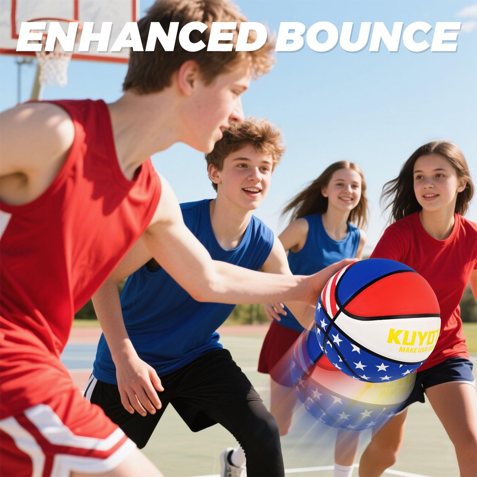 🏀𝗔𝗺𝗲𝗿𝗶𝗰𝗮𝗻 𝗙𝗹𝗮𝗴 - 𝗜𝗻𝘀𝗽𝗶𝗿𝗲𝗱 𝗗𝗲𝘀𝗶𝗴𝗻🏀 : This rubber basketball is designed with the classic American flag pattern, adding a unique and eye - catching style to your game.