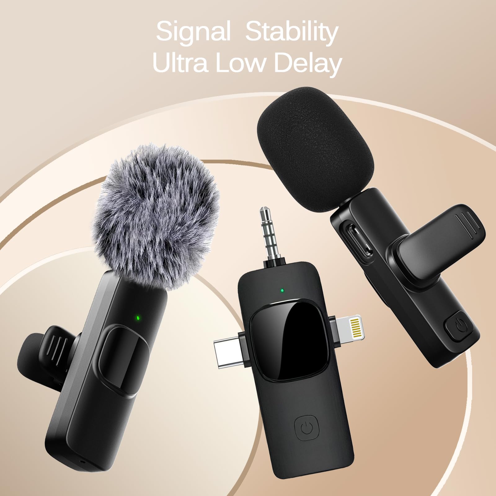 Dual Wireless Microphones for iPhone This dual wireless lavalier microphone set built-in noise reduction chip, real-time auto-sync technology, and 2.4G signal transmission with super low latency(0.008s), the sound picking-up follows the picture in real-time. Lapel microphone wireless can easily cope with various noisy environments and truly restore human voices.