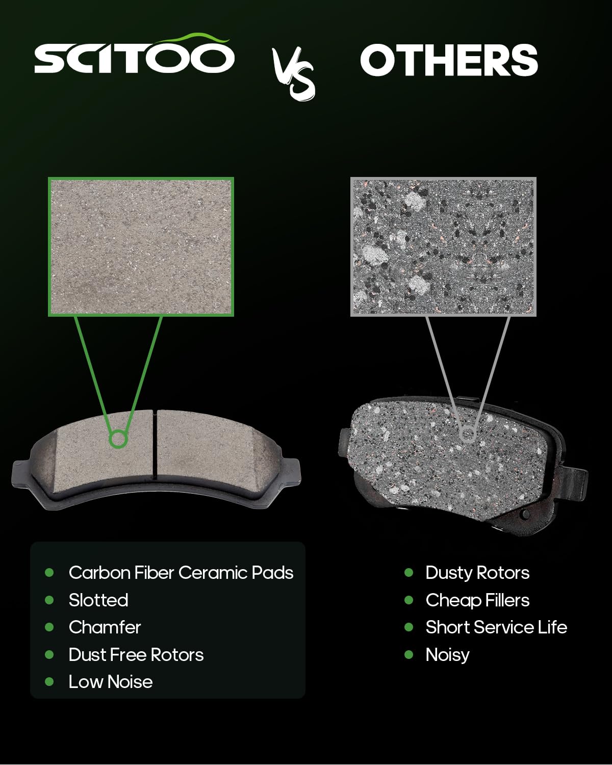 Brake Pads Feature - The pads with slotting design increases friction, heated evenly, heat faster,better ventilation, improves drainage.Ensure exceptional stopping power and quiet operation