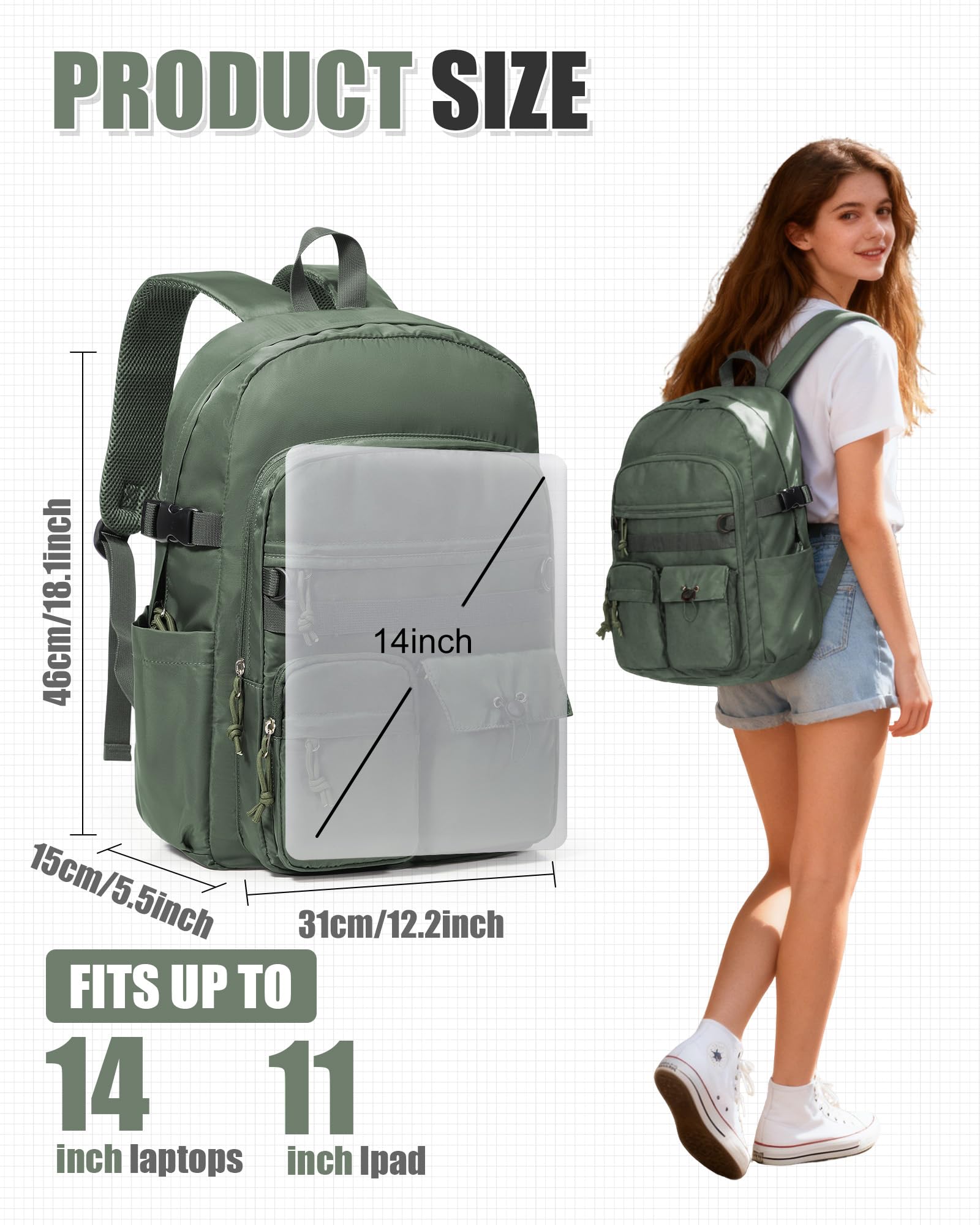 【Size】 The size of this daily backpack is 46cm*31cm*14cm=18.11in*12.20in*5.51in, golden ratio, capacity of about 21.5 liters, suitable for travel"