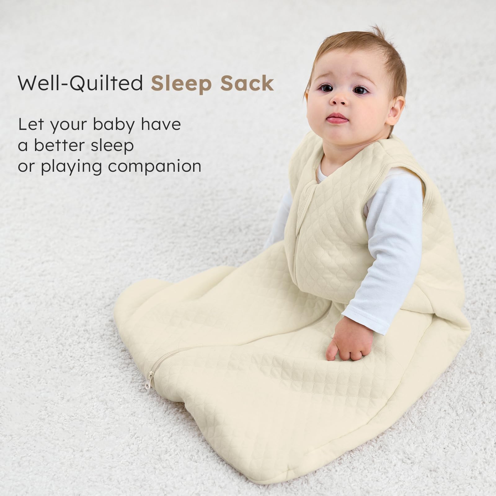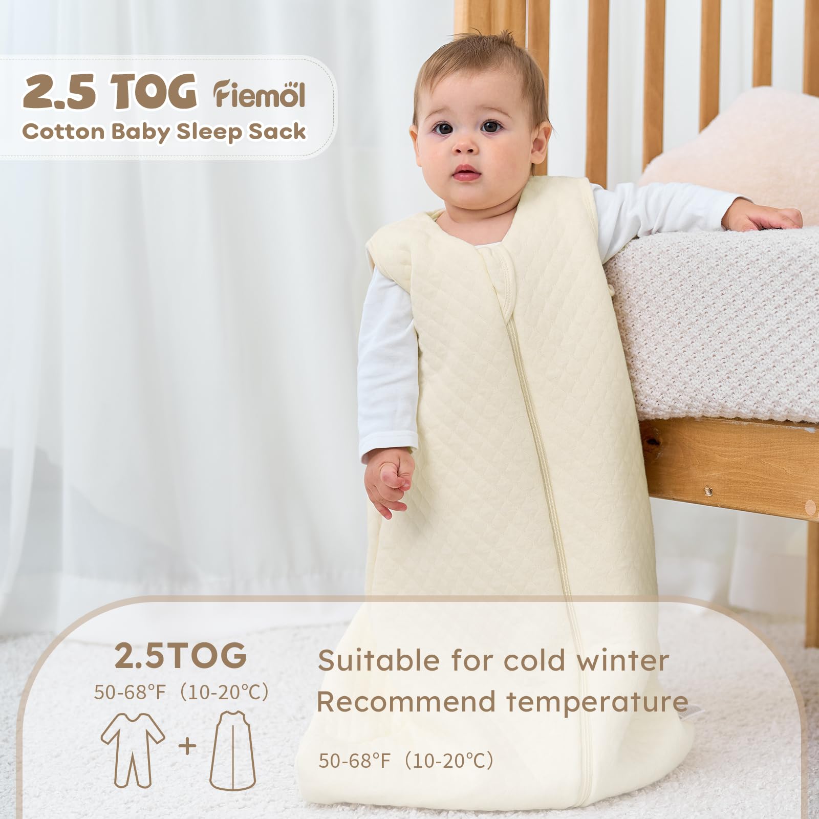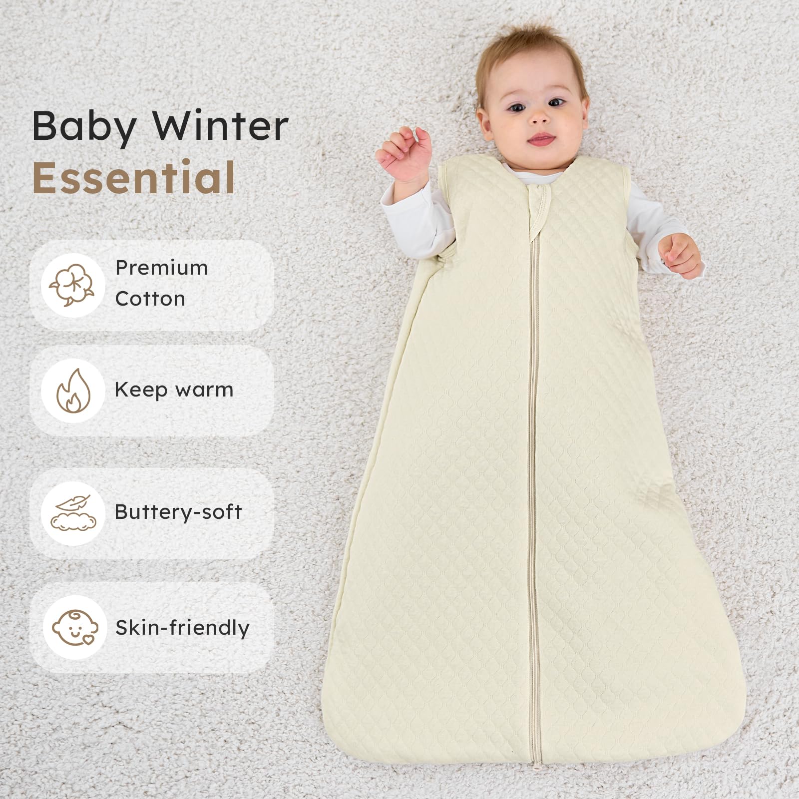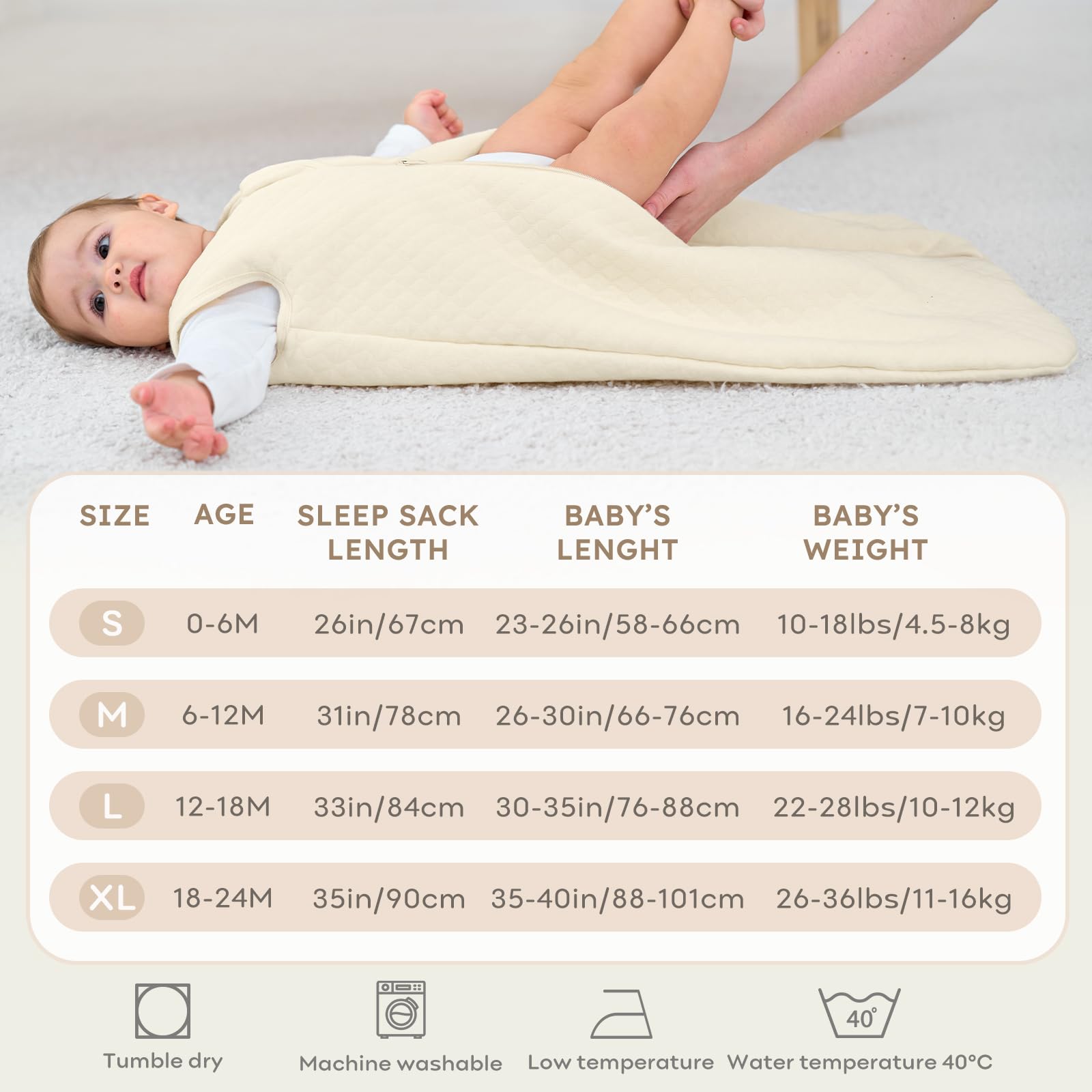 【Warm&Breathable】The 2.5 tog baby sleep sack is delicately made of 100% cotton at outer layer, which could quite well fit for air flow at every winter night. With its premium cotton inner layer and microfiber filling, your baby would be prioritized by a sleep in mom's arms. A sound sleep for your baby is indispensible for a family.