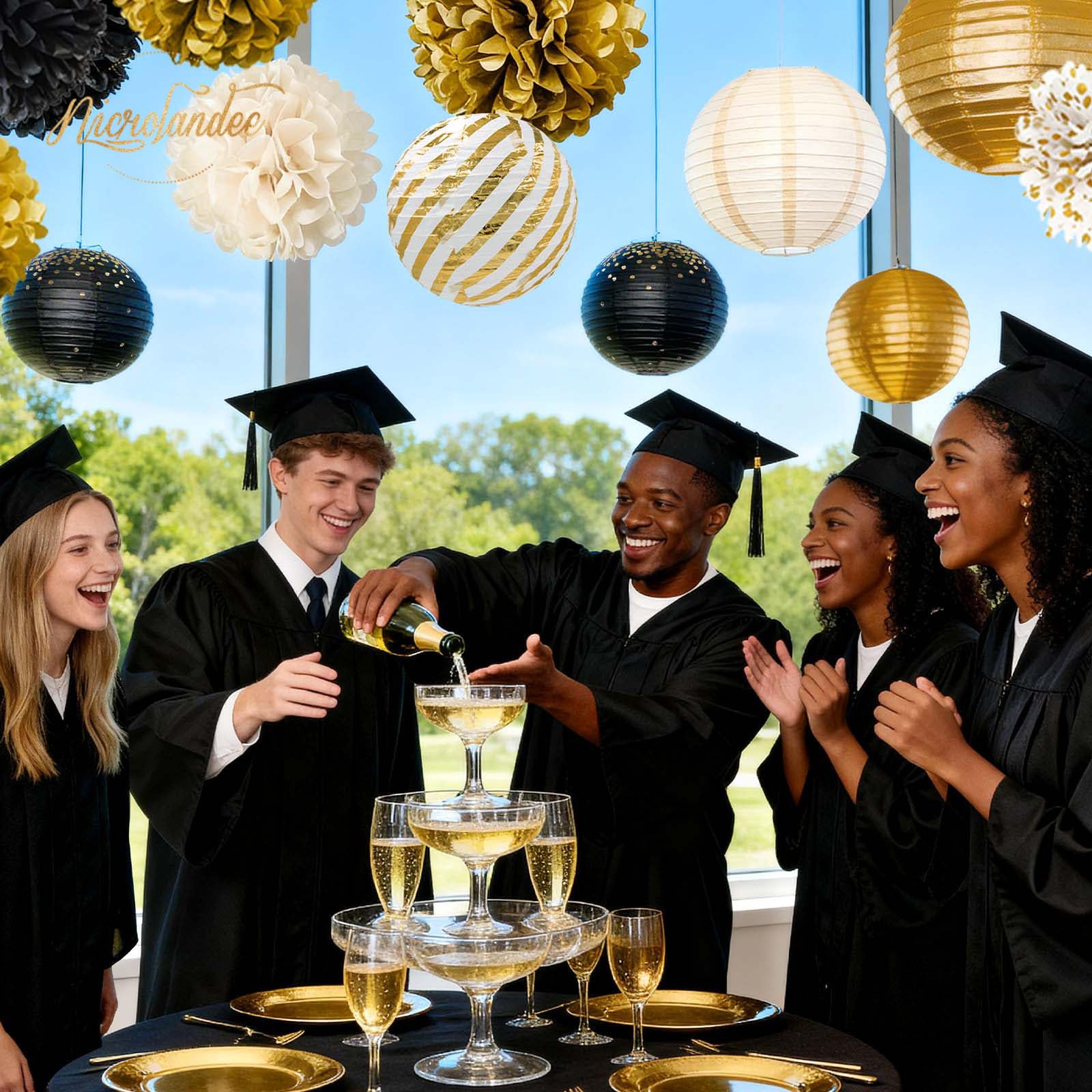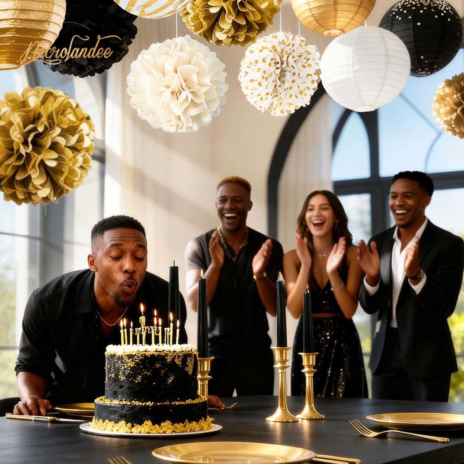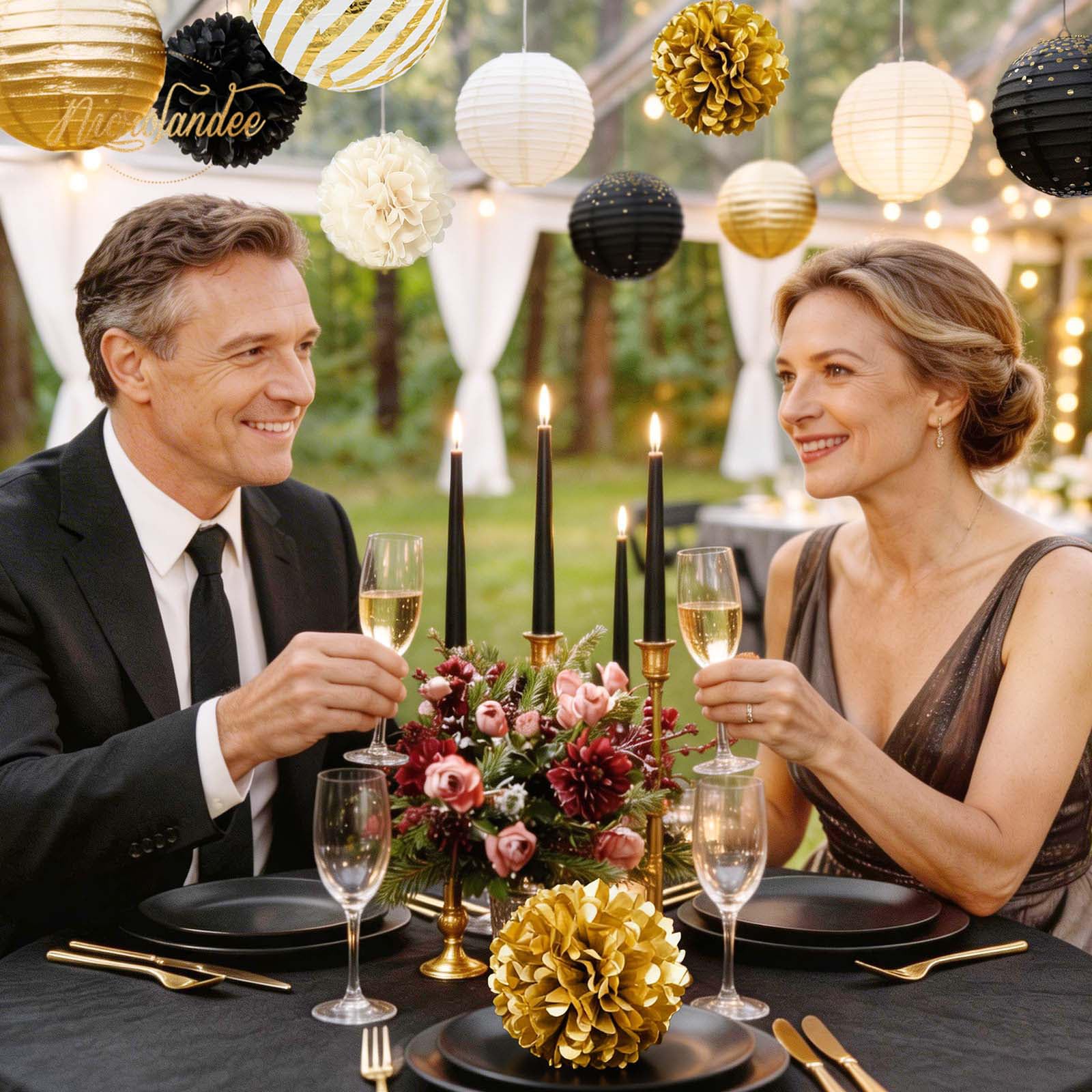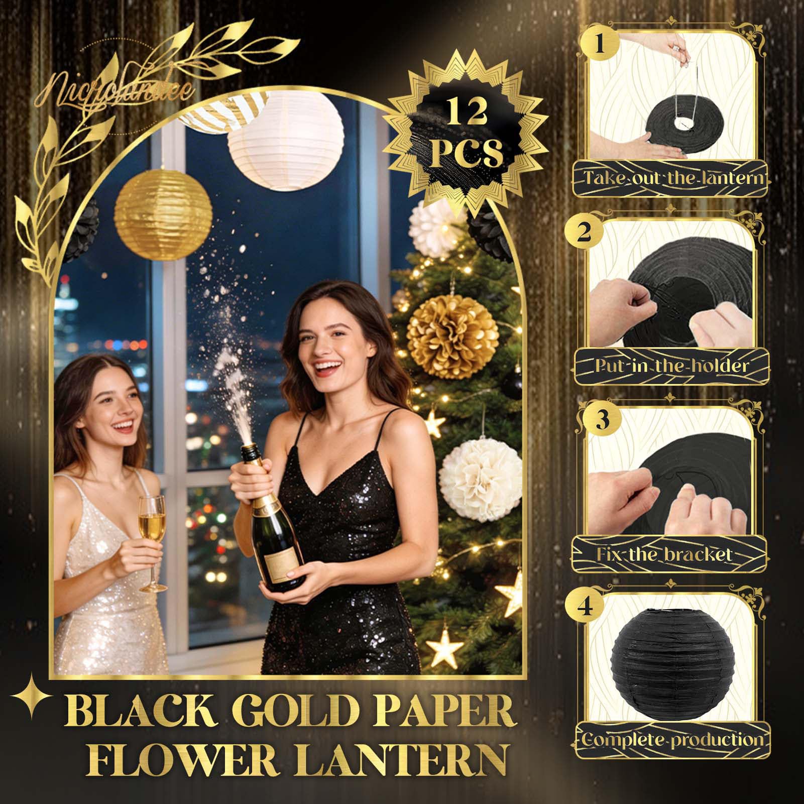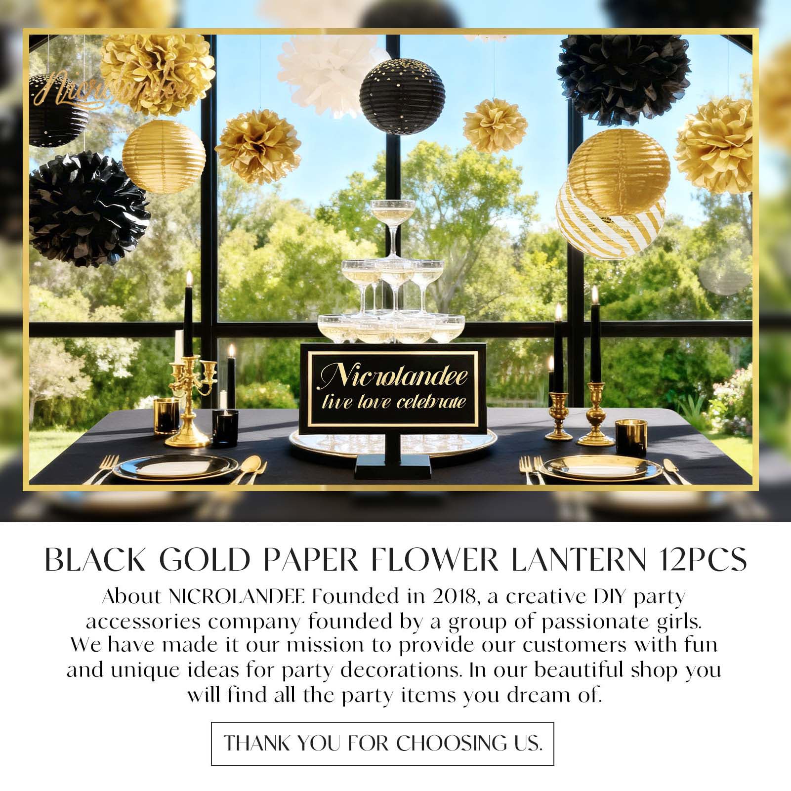 Package Includes: Black gold decoration sets come with 5 PCS tissue paper pom poms and 7 PCS paper lanterns. Total 12 PCS party decorations kits for black gold Theme Party