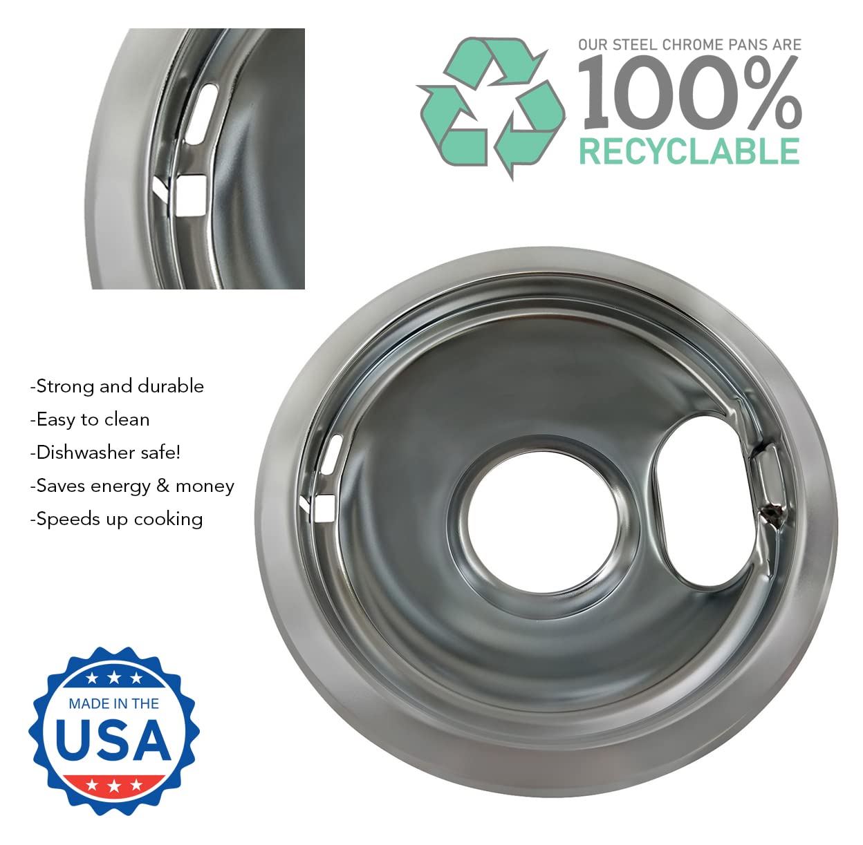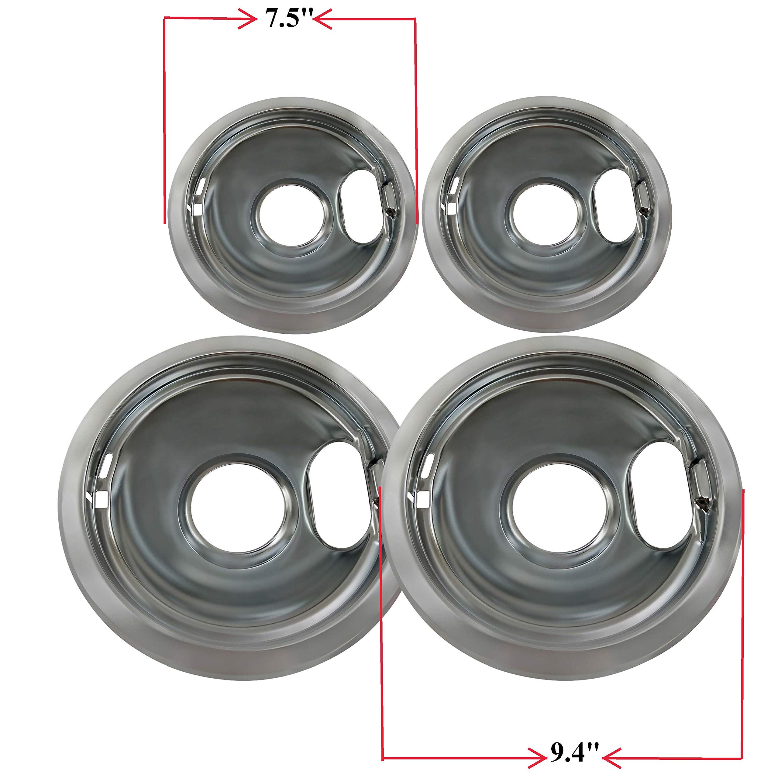 Premium USA-manufactured chrome drip pans featuring eco-friendly plating process - Set includes (2) 6-inch pans measuring 7.5 inches and (2) 8-inch pans measuring 9.4 inches for perfect fit on your electric range. Compatibility with major brands including Whirlpool, Maytag, Kenmore, Sears, KitchenAid, and Crosley electric stove models - Perfect replacement parts for your kitchen appliance. [Package includes] (2) 6" W10196406 and (2) 8" W10196405 chrome pans