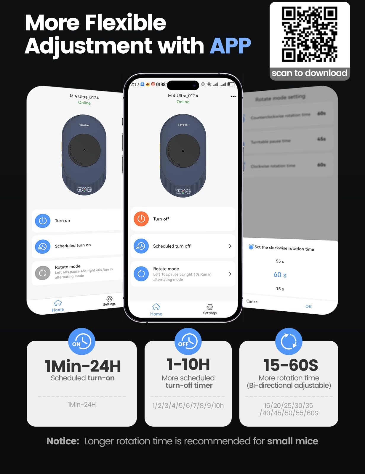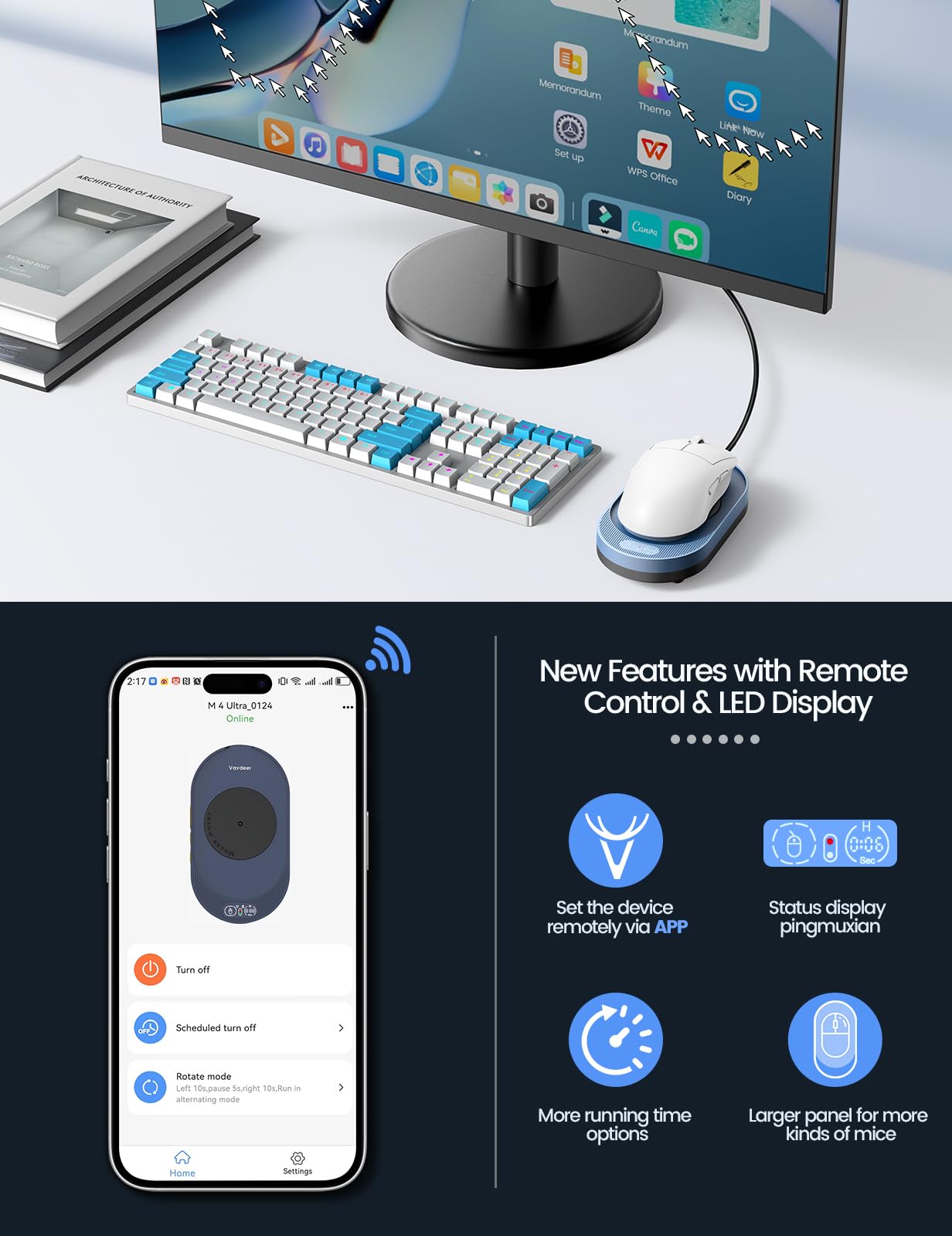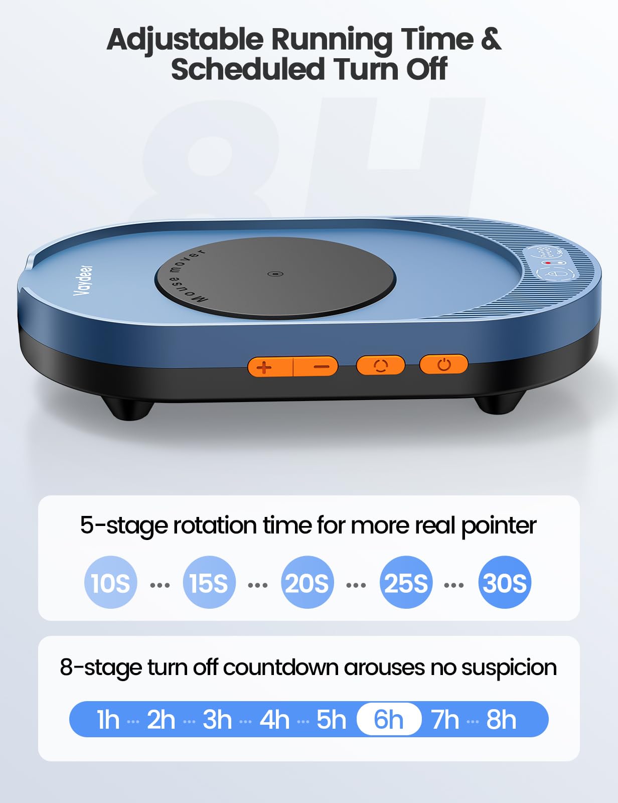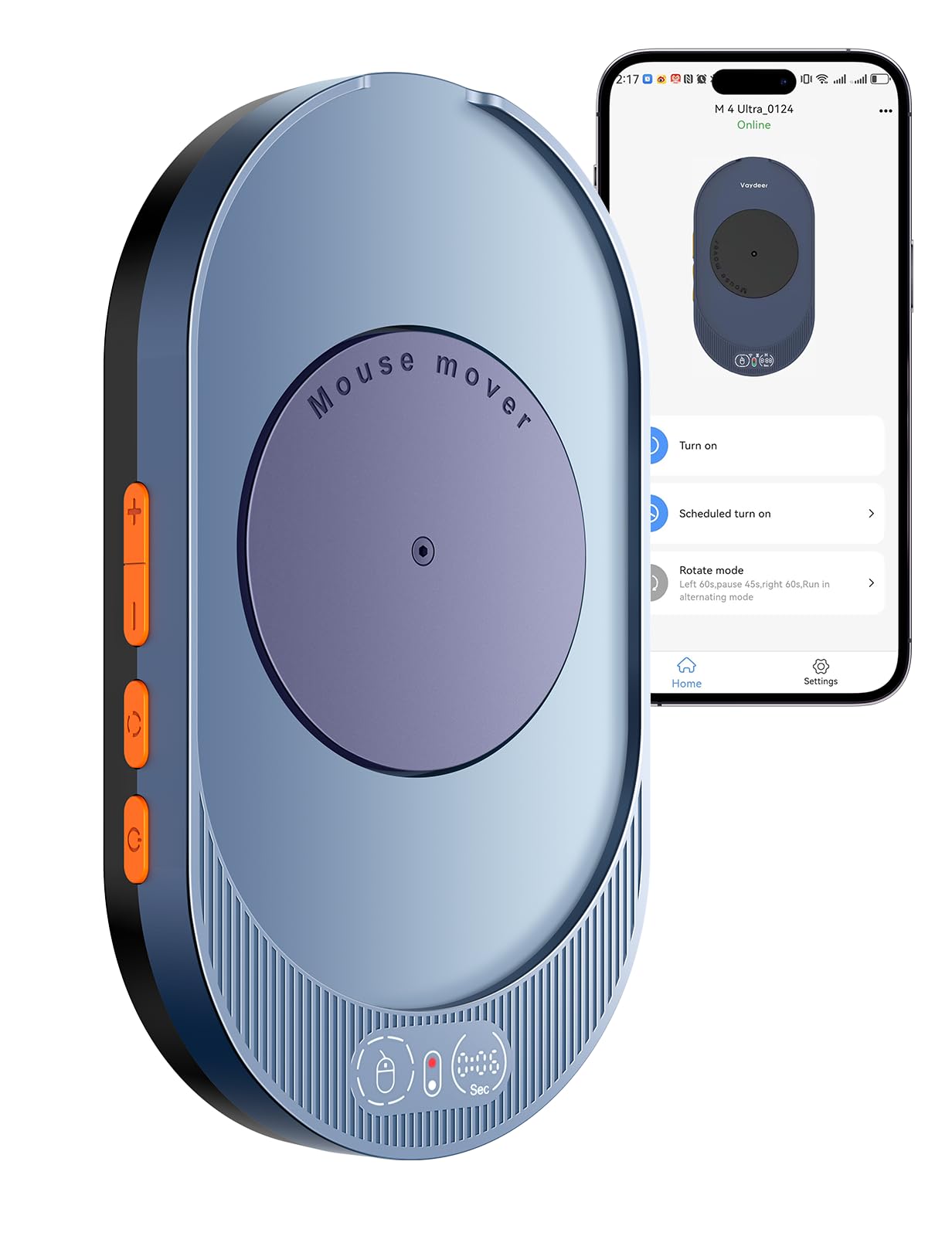 【Remote App Control Upgraded】Vaydeer mouse mover now features mobile app control for remote adjustments of movement intervals and runtime. Customize auto-shutdown schedules (1-8 hours) or enable uninterrupted operation. The enhanced app lets you program device schedules and manage settings remotely, delivering flexible automation for both home and office environments. With cross-scenario accessibility and smart timing functions, this upgrade ensures effortless device control wherever you work.