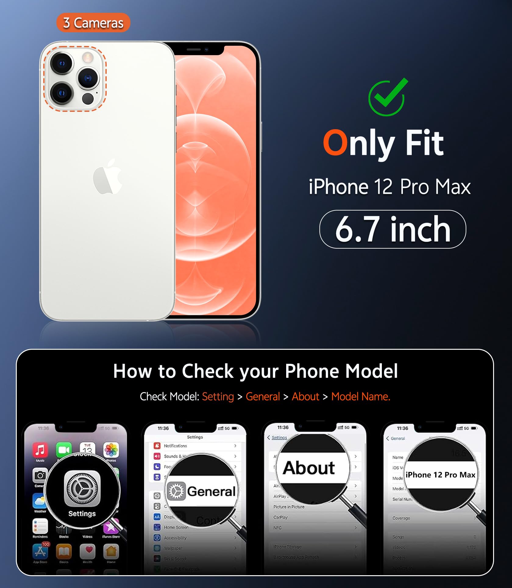 10FT Military Grade Protection: Passed Military Drop Tested up to 10FT. This iPhone 12 Pro Max case backplane is made with rigid polycarbonate and flexible shockproof TPU bumpers around the edge and features 4 built-in corner Airbags to absorb impact, which can prevent your Phone from accidental drops, bumps, and scratches
