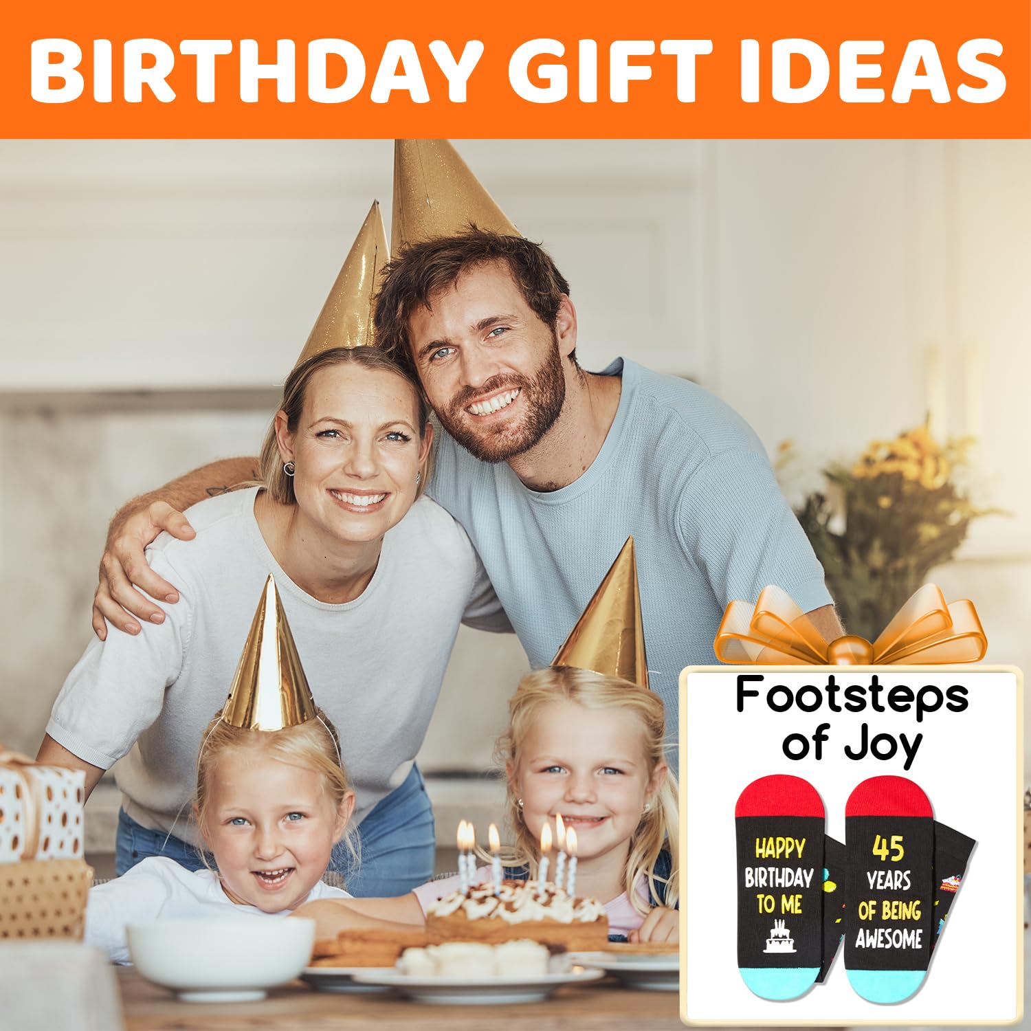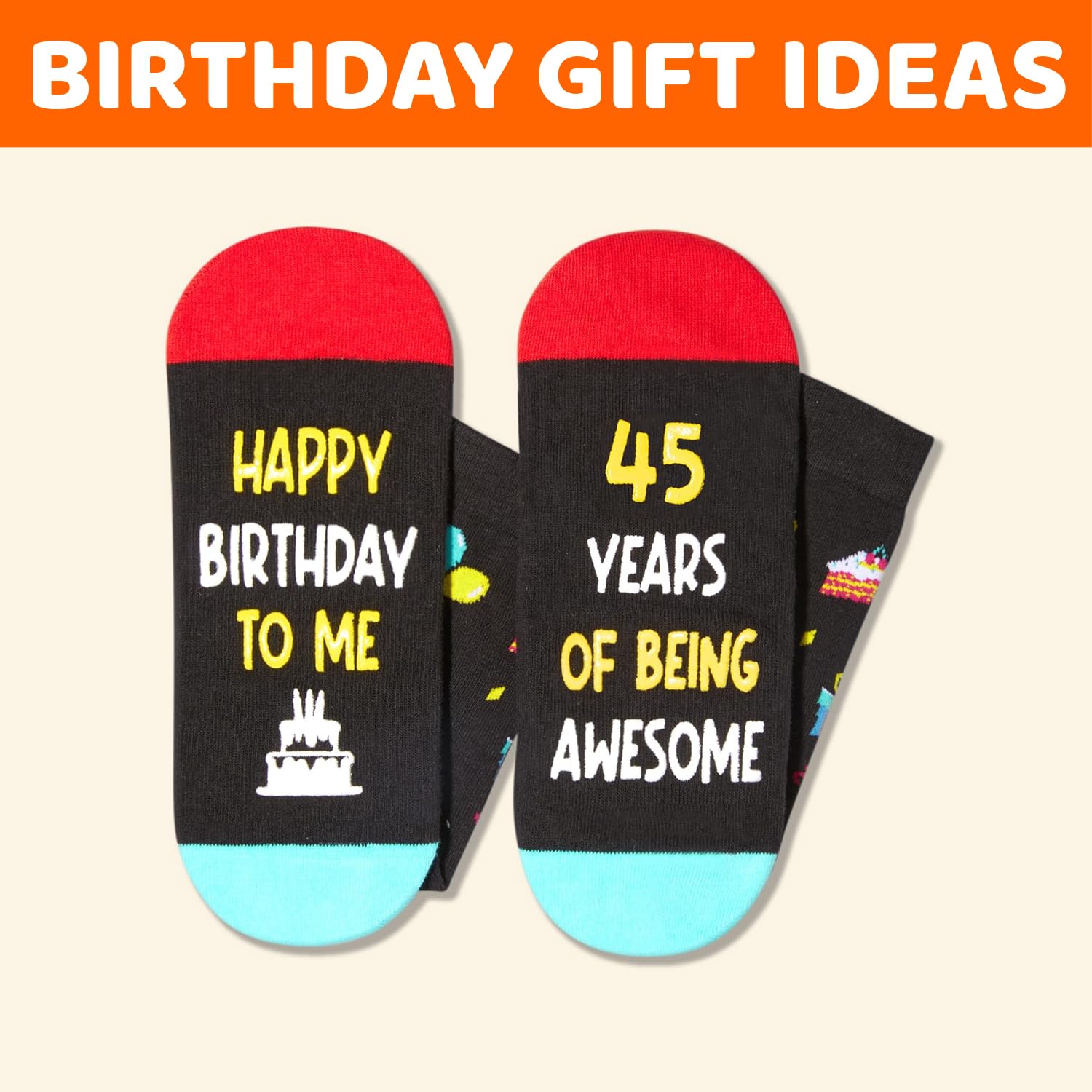 45TH BIRTHDAY GIFTS: These socks feature birthday gifts, balloons, cakes, and other elements on the top, while the bottom features a hilarious secret message written in non-slip ink: "HAPPY BIRTHDAY TO ME, 45 YEARS OF BEING AWESOME".