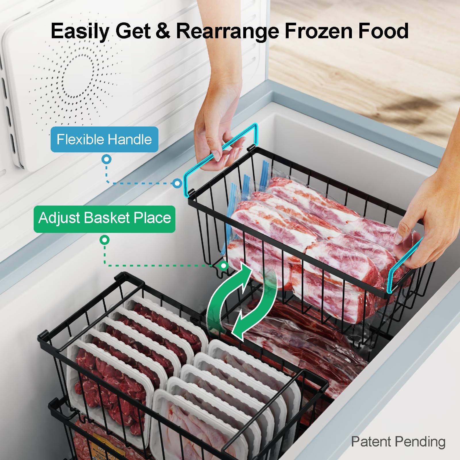 [Easy to Access & Rearrange] Fold down the handles to stack the basket efficiently using the vertical space to store more food; Freezer organizer easy to lift and rearrange whole freezer bins rather than take a ton of individual packages out, making restocking a breeze