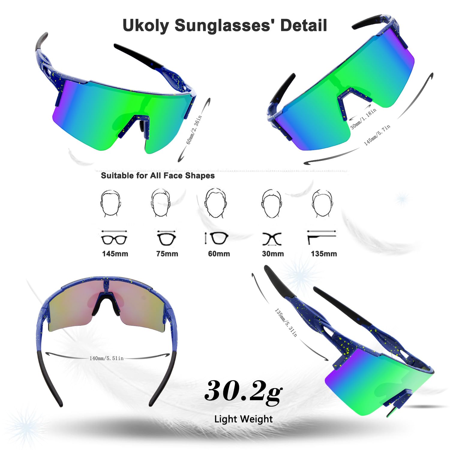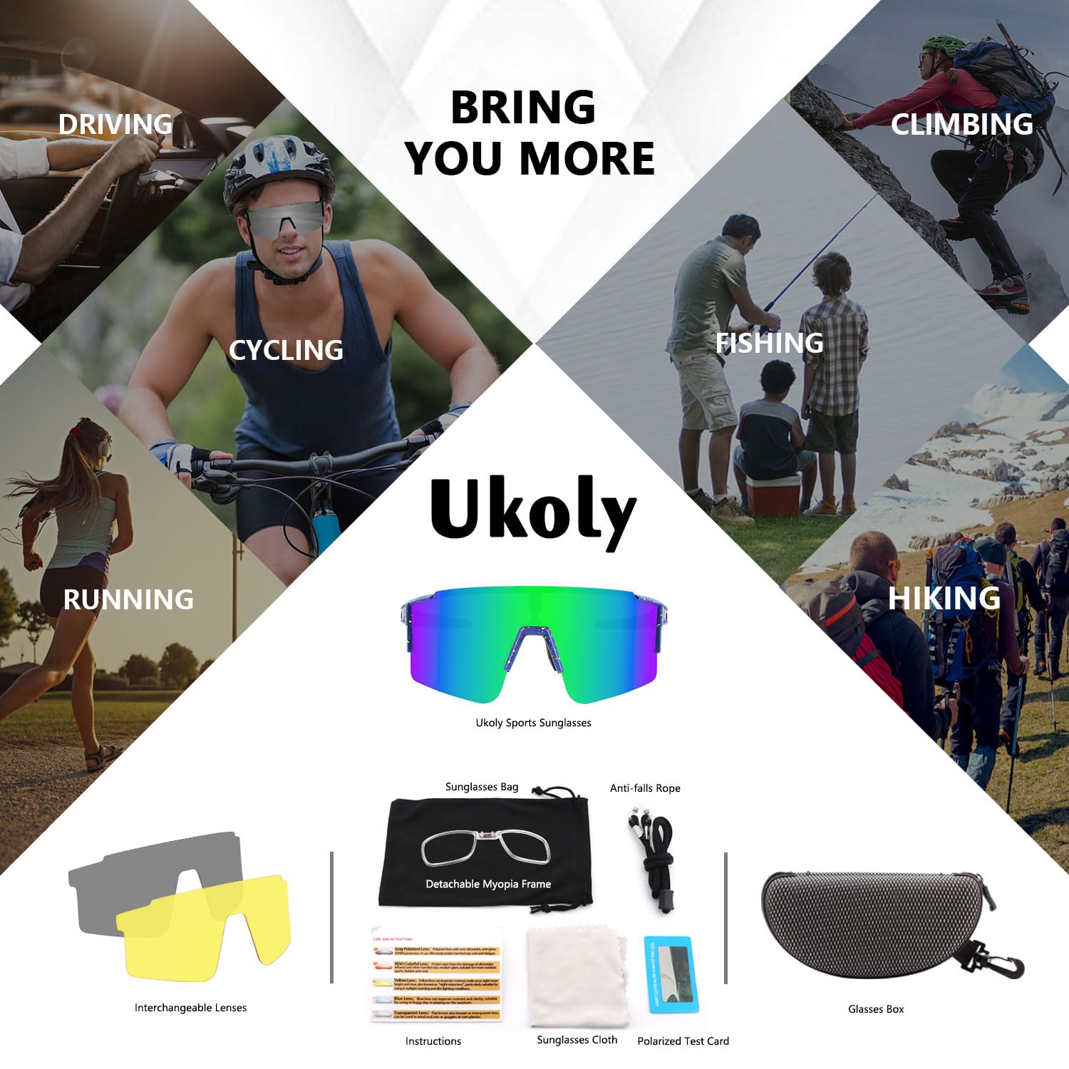 Three Interchangeable Lenses - Ukoly Sports sunglasses has three replaceable lenses for different uses, the yellow one is for night/dark environment, the gray one is polarized suitable for driving, the colorful one is for outdoor activities under the sun.