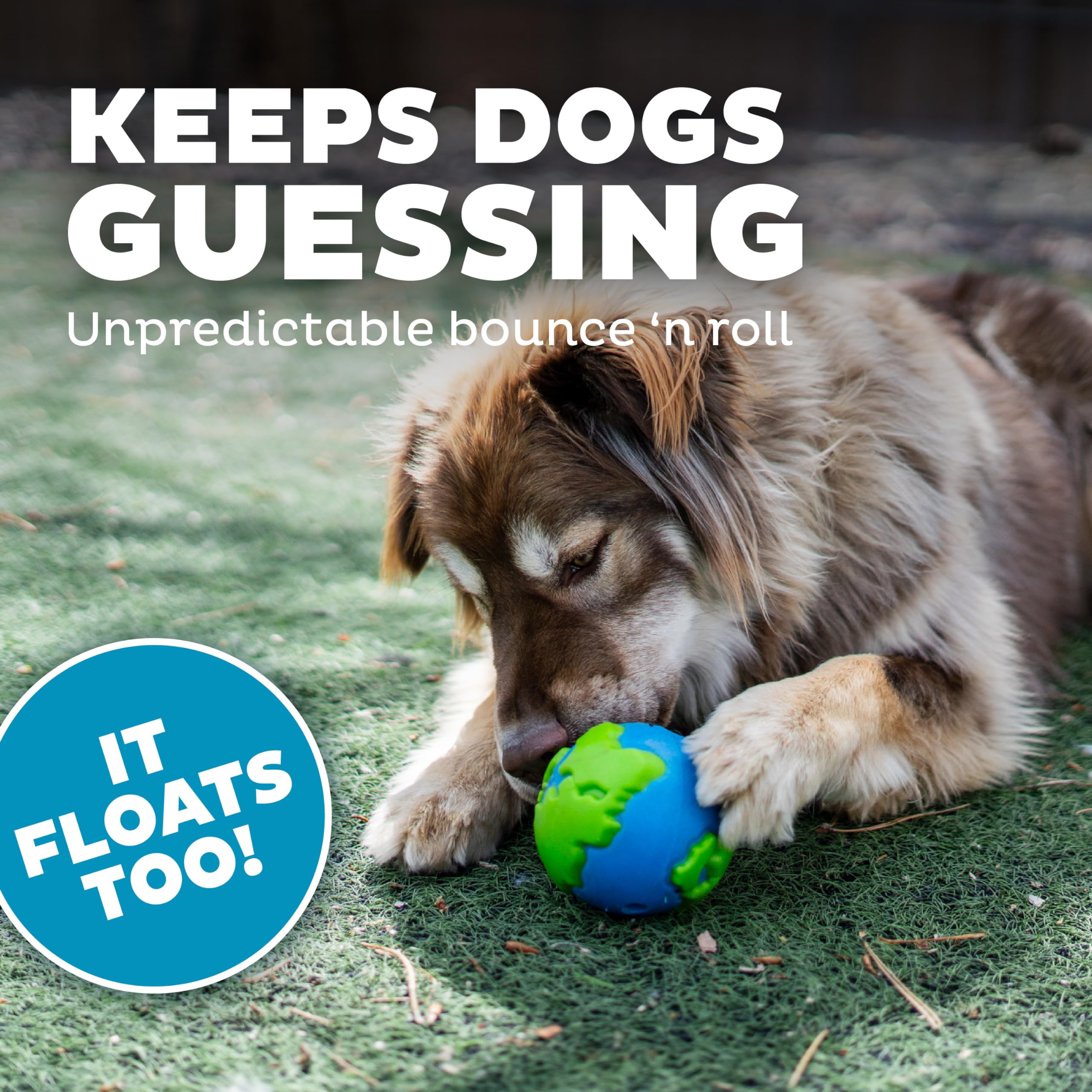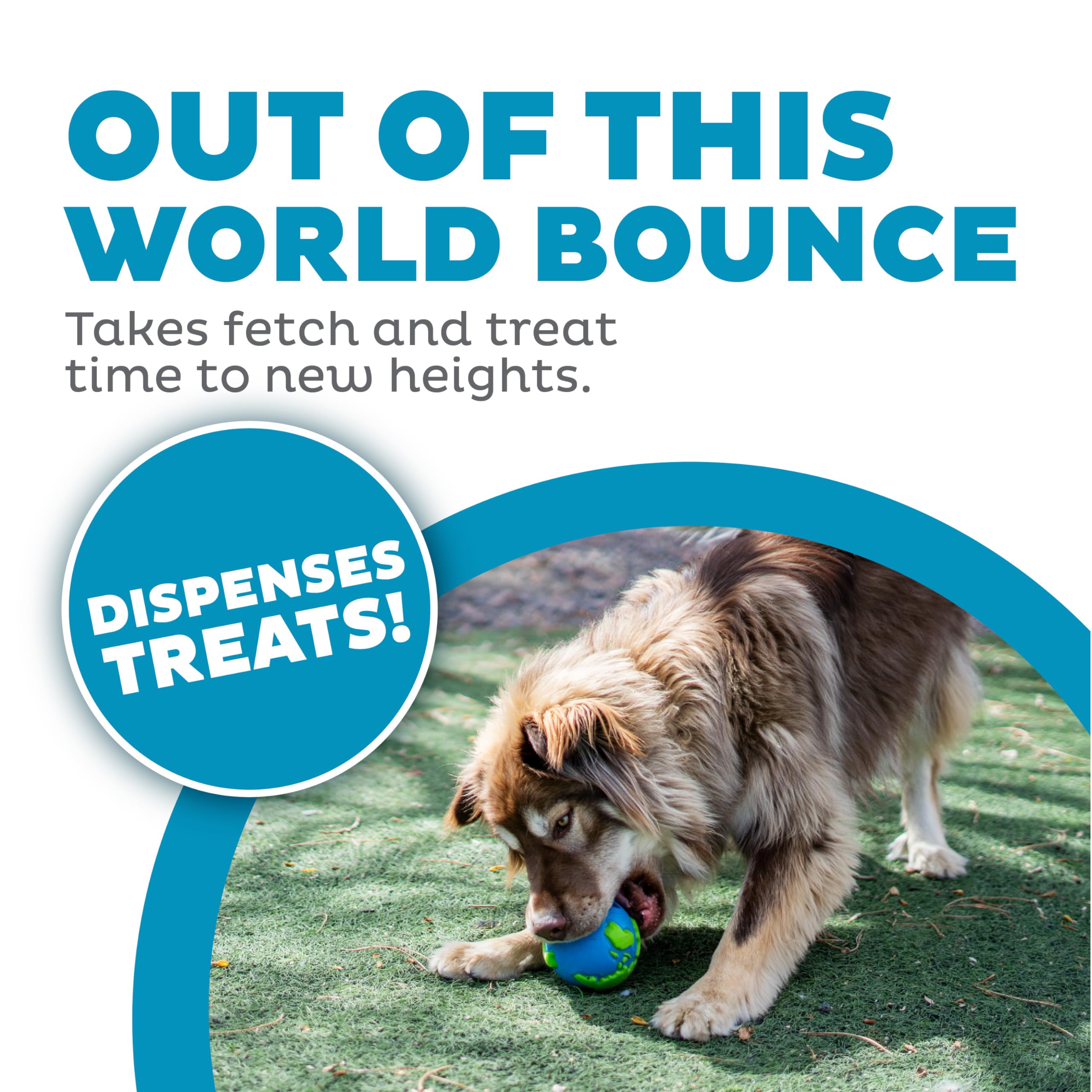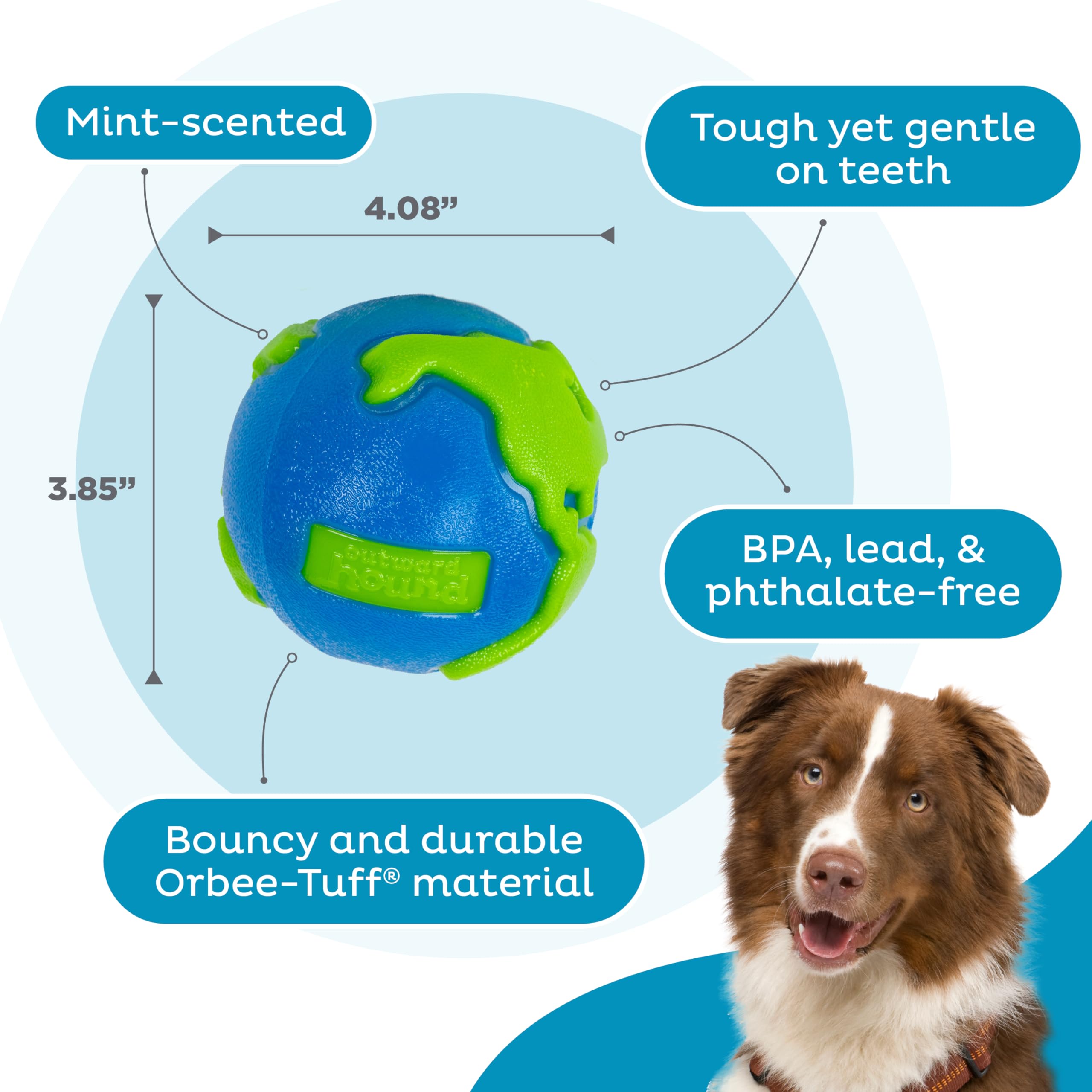 Outward Hound's Planet Ball takes bounce, fetch, and treat games to new heights! This durable and bouncy dog toy is made from BPA, lead, and phthalate-free Orbee-Tuff material known for being durable and bouncy yet gentle on teeth – the perfect ball toy texture! In addition to being an ideal fetch and chew toy, the Planet Balls can be stuffed with your dog's favorite treats to keep them occupied and reward them for problem-solving. Dogs bounce, roll, paw, and fetch the interactive dog toy to release the tasty rewards. The added challenge provides long-lasting entertainment whether indoors or out, busting boredom with mentally stimulating and enriching fun. Plus, the ball floats in water to take pool time to the next level! These bouncy balls are mint-scented to help freshen your dog's breath as they chew and play. Available in multiple sizes, dogs big, medium, and small and of all ages can enjoy the unpredictable, out-of-this world bounce the Planet Ball has to offer. Clean using warm water and mild soap. Rinse well. SAFETY & CARE: No toy is indestructible. Choose toy based on pet size and playing habits. Toys should be inspected regularly and not left with any dog unattended. If damage occurs, replace toy immediately. Intended for dogs only. Keep out of reach of children.