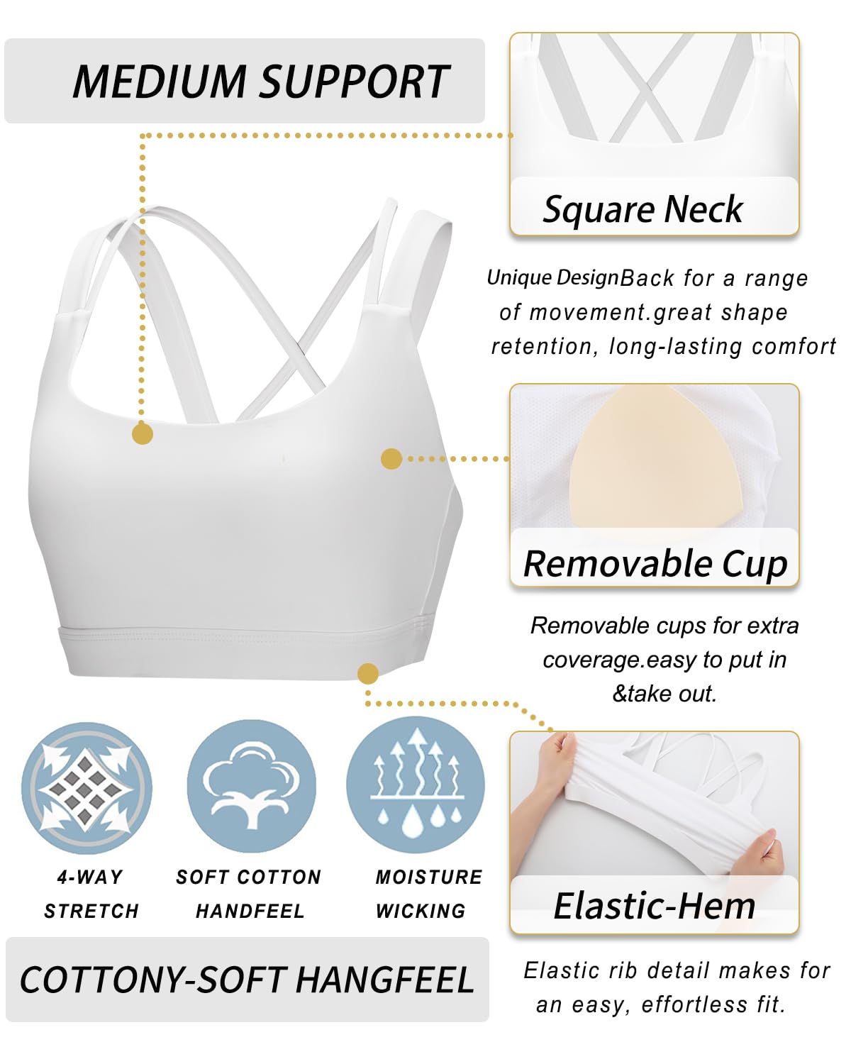 CRISS-CROSS BACK FULL COVERAGE DESIGN:Sexy back bringing more attention to the crisscross double strap back feature.Elastic Double Strap Bra features a sultry full coverage and double layer fabric for enough added support.Stretch Fit Sports Yoga Gym Bra Push up & Padded with removable pads for convenient adjustment, with a cotton-like meterial, soft and comfortable to wear.