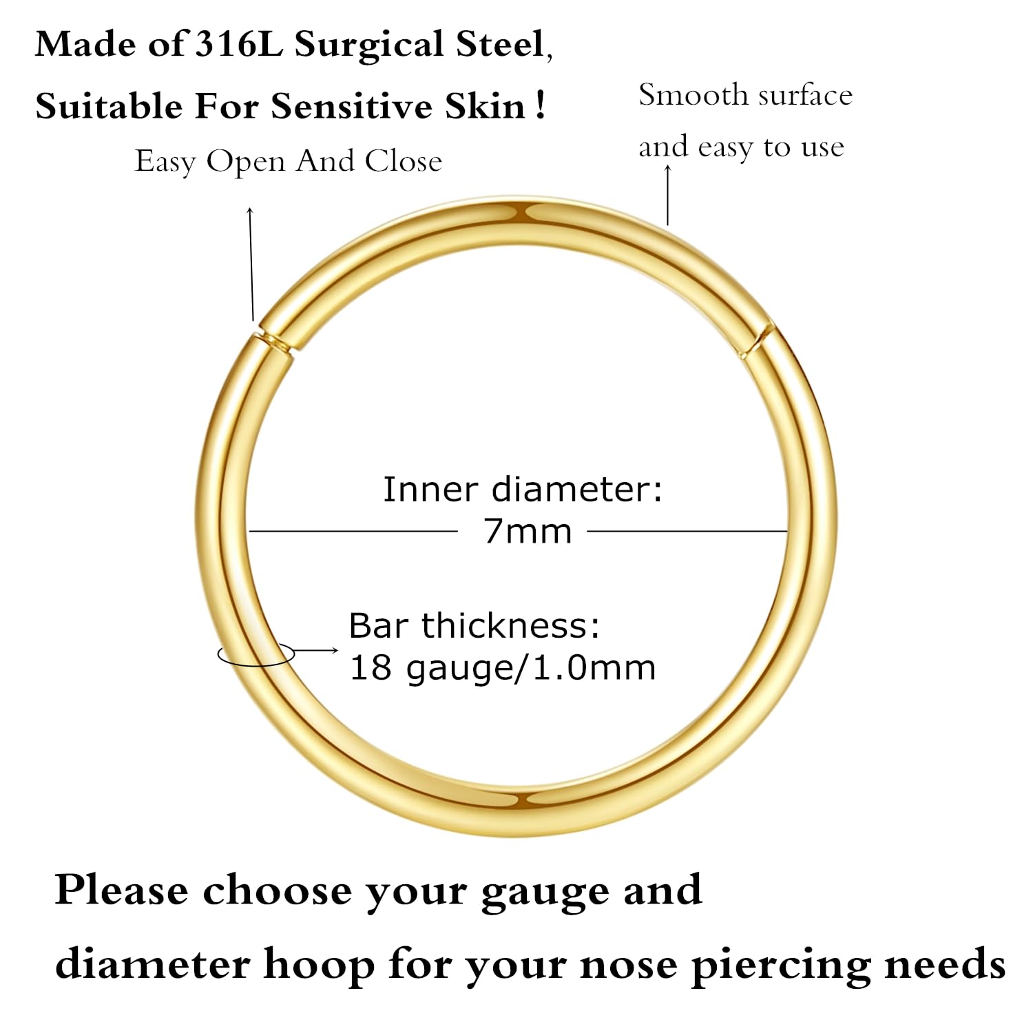 Sold individually Nose Hoop Ring/Earring Hoop Size: 18 gauge (thickness: 1.0mm), inner diameter 9/32 inches(7mm),This 18 gauge 7mm nose ring is small! For SMALL nose of women ONLY,We don't suggest male customers and the persons who have big nose or ears to pick this size. If your nose is big or your nose piercing is higher, don't choose 7mm.please try to pick larger inner diameter.Please choose your gauge and diameter hoop for your nose piercing needs.