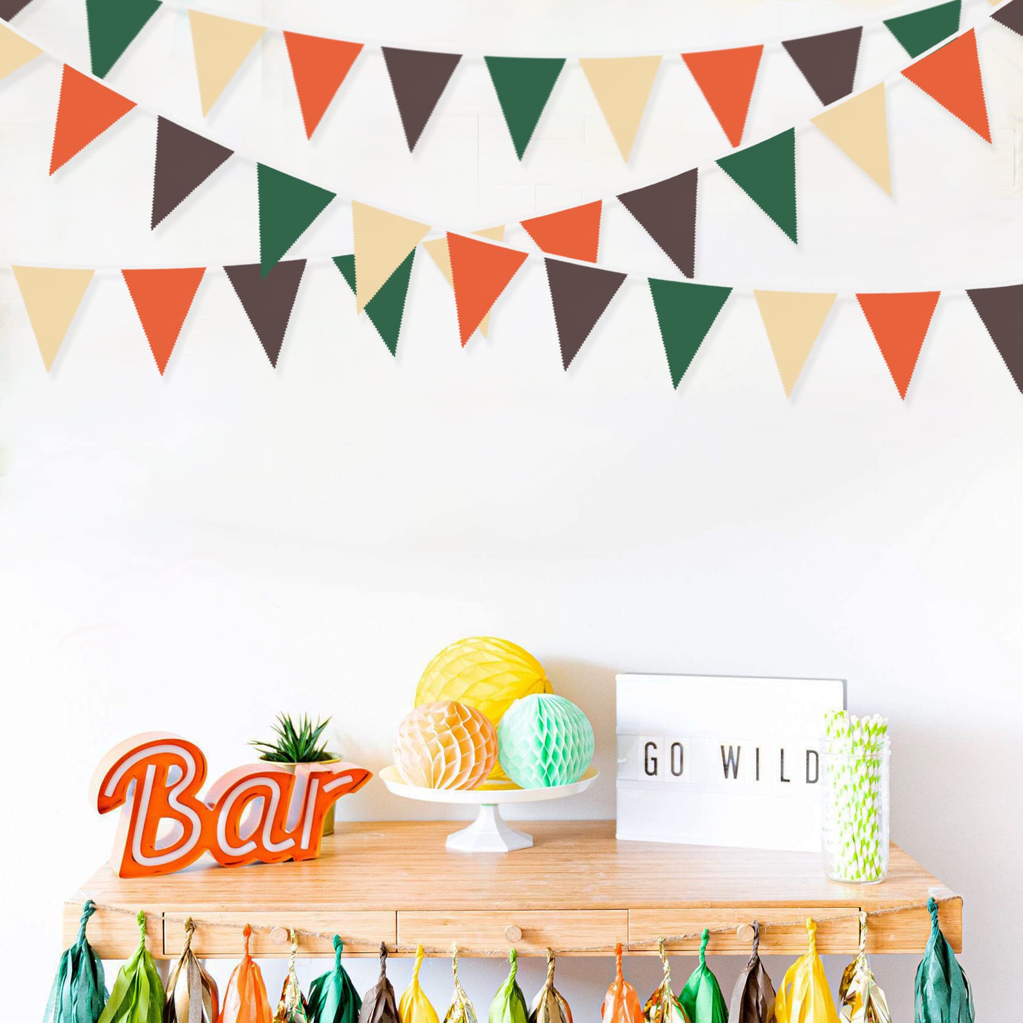【Camping Party Supplies】The green orange bunting triangle flags banner are perfect for decorating any parties.Like wedding, birthday,baby shower,jungle party, woodland party,fall party,family gatherings,outdoor activities, picnics,BBQs,tea party,spring,summer party,bridal shower,nursery, christening,anniversary,hawaiian,luau party,safari,wild one party, beach,jungle leaf,animal party,forest party,tropical theme party, or hung them with tape from the ceiling.