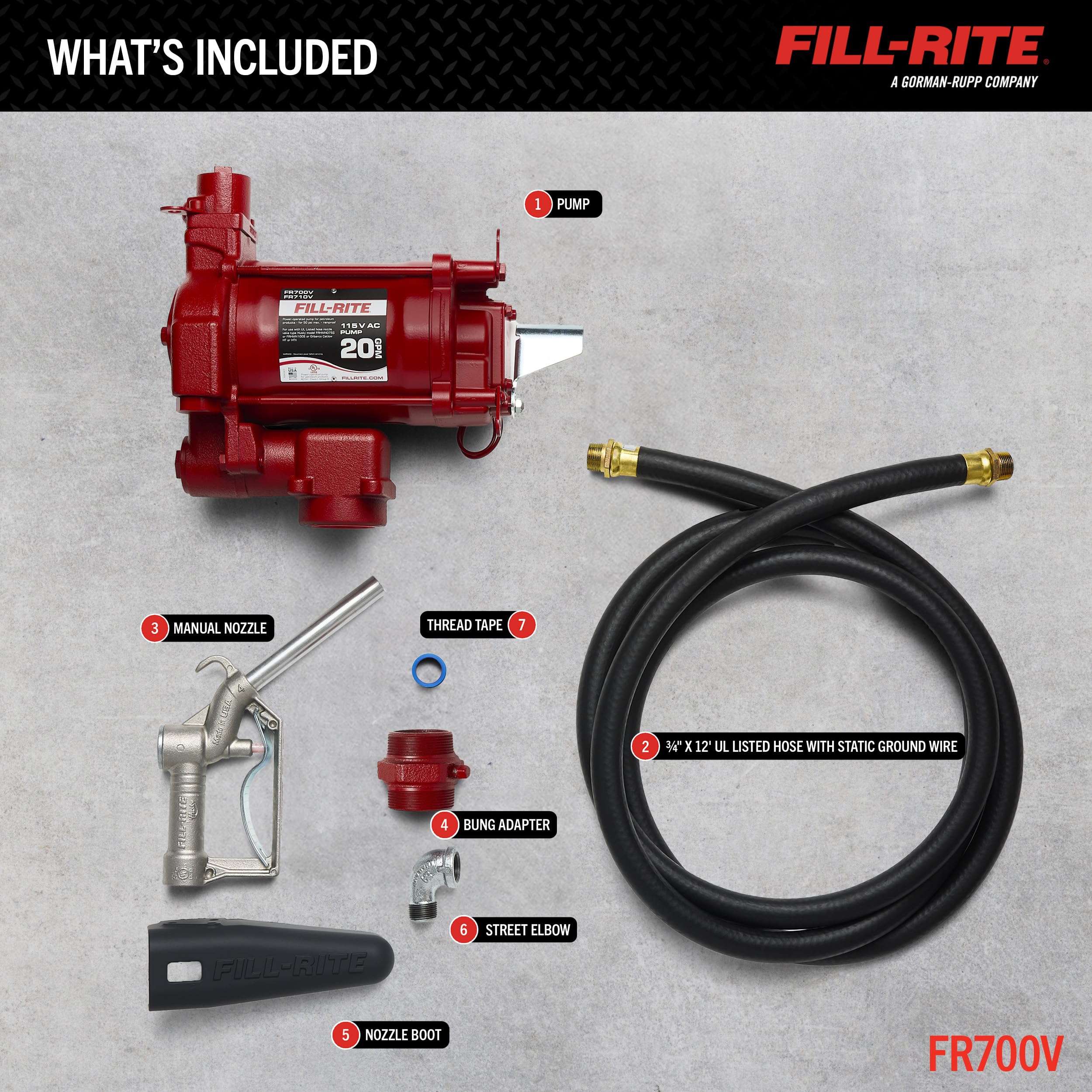 The FR700V is a 115V 20 GPM fuel transfer pump that comes with a 3/4" x 12' discharge hose, 3/4" manual nozzle, 3/4" street elbow, and a roll of PTFE tape. It can be used to pump gasoline, diesel, kerosene, ethanol blends up to 15%, methanol blends up to 15%, and biodiesel up to B20. Each fuel transfer pump utilizes Rotary Vane Technology that helps maintain consistent flow performance over the life of the pump. Built to last, with durable cast-iron construction this product will stand the test of time in the toughest environments. This is an authentic product from the trusted Fill-Rite® brand. It's made in the USA with globally sourced materials and built for quality, reliability, and safety.