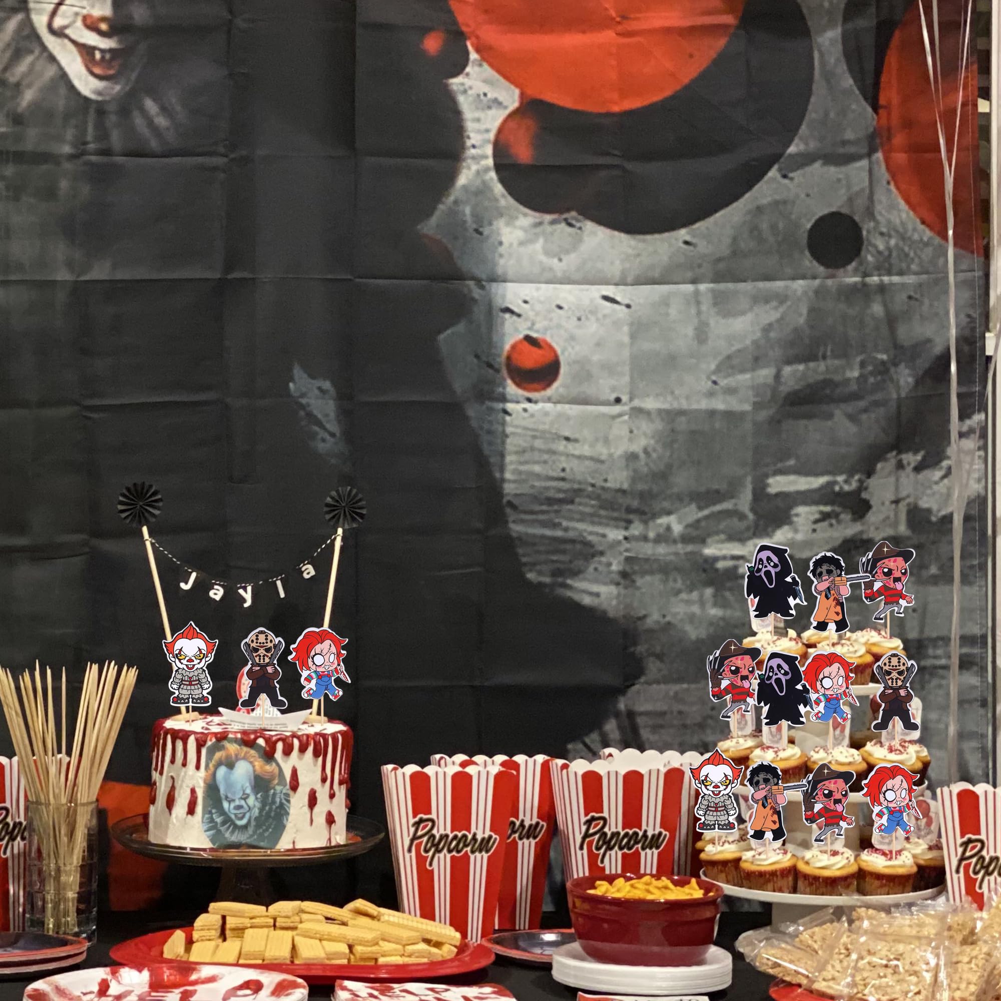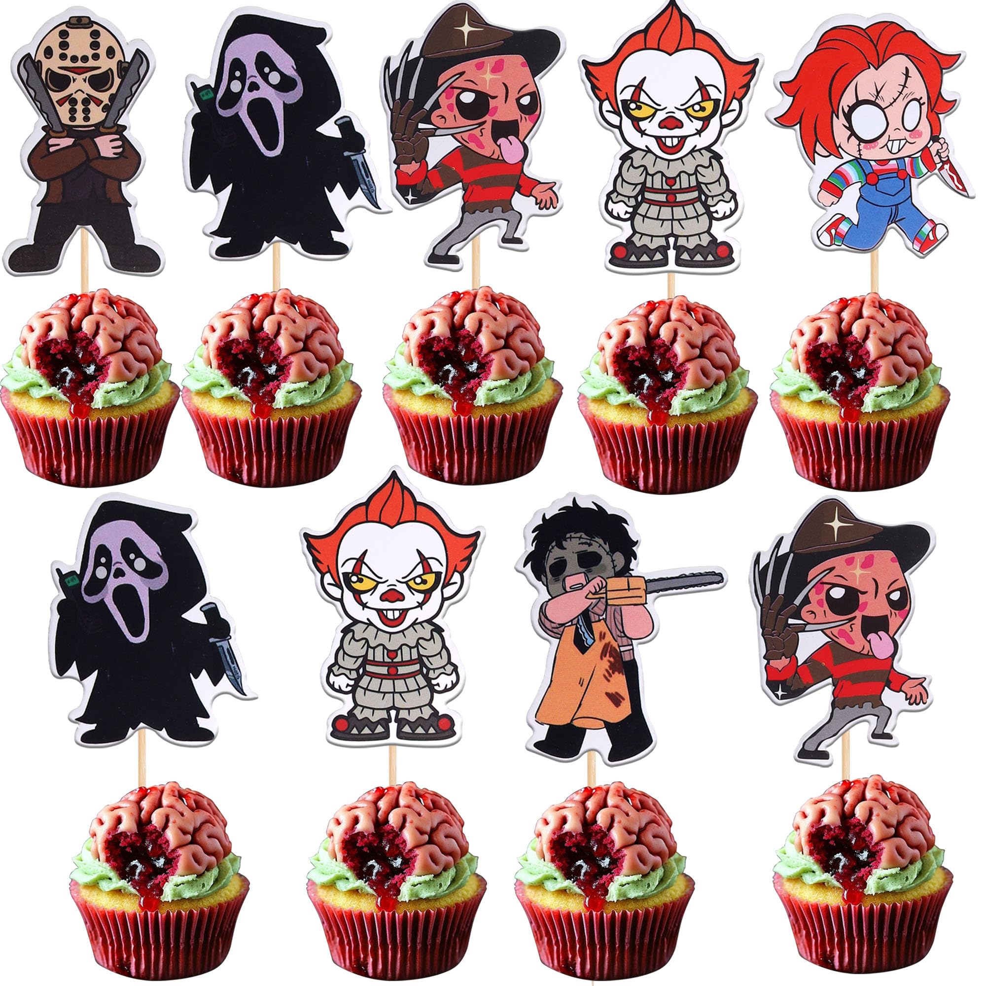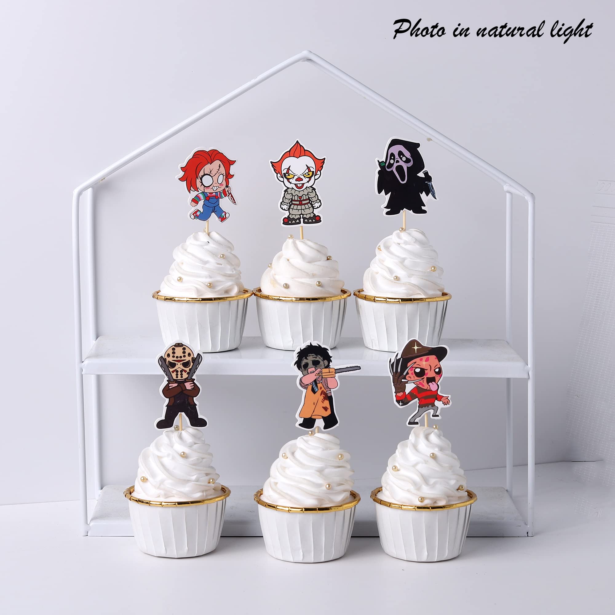 Horror Classic Movie Cupcake Toppers Movie Characters Cupcake Picks for Halloween Horror Movie Theme Birthday Party Cake Decorations Supplies Perfect for horror movie theme party, telephone scam theme party, have a killer birthday theme party, halloween theme party cupcake decorations supplies. Pack of 36 pcs,6 pcs of each pattern. The size is 1.9*4.7 inch/1.7*4.3 inch/1.9*4.7 inch/1.4*4.3 inch/2.0*5.1 inch/1.8*4.3 inch ( with stick ) Made of high quality paper card stock ,thick and thick and sturdy. These cupcake toppers are double-sided printing, and they are intended for decoration only, please do not put them in oven or microwave. If the item you received has any defects, please contact us immediately.we will deal with it within 24 hours.