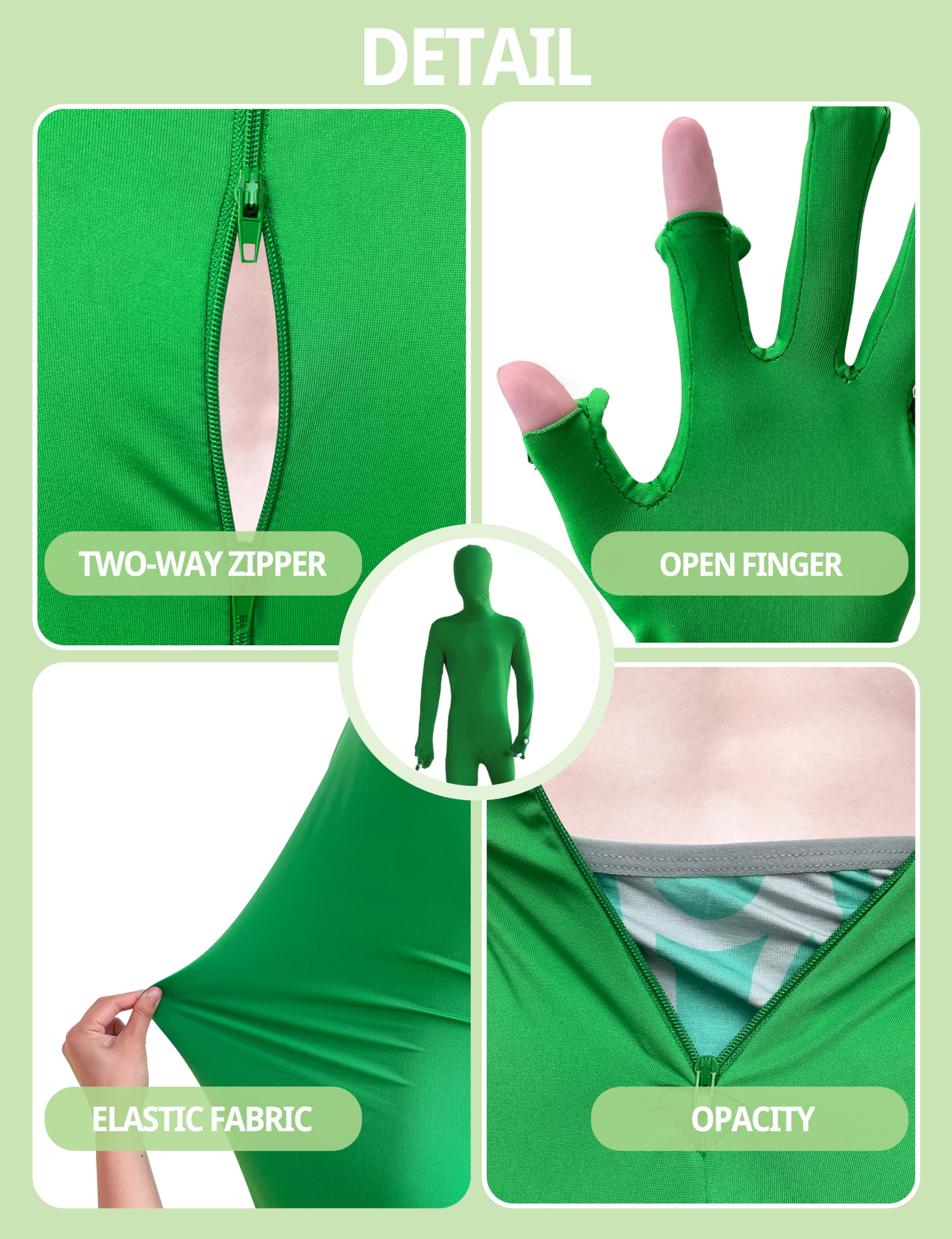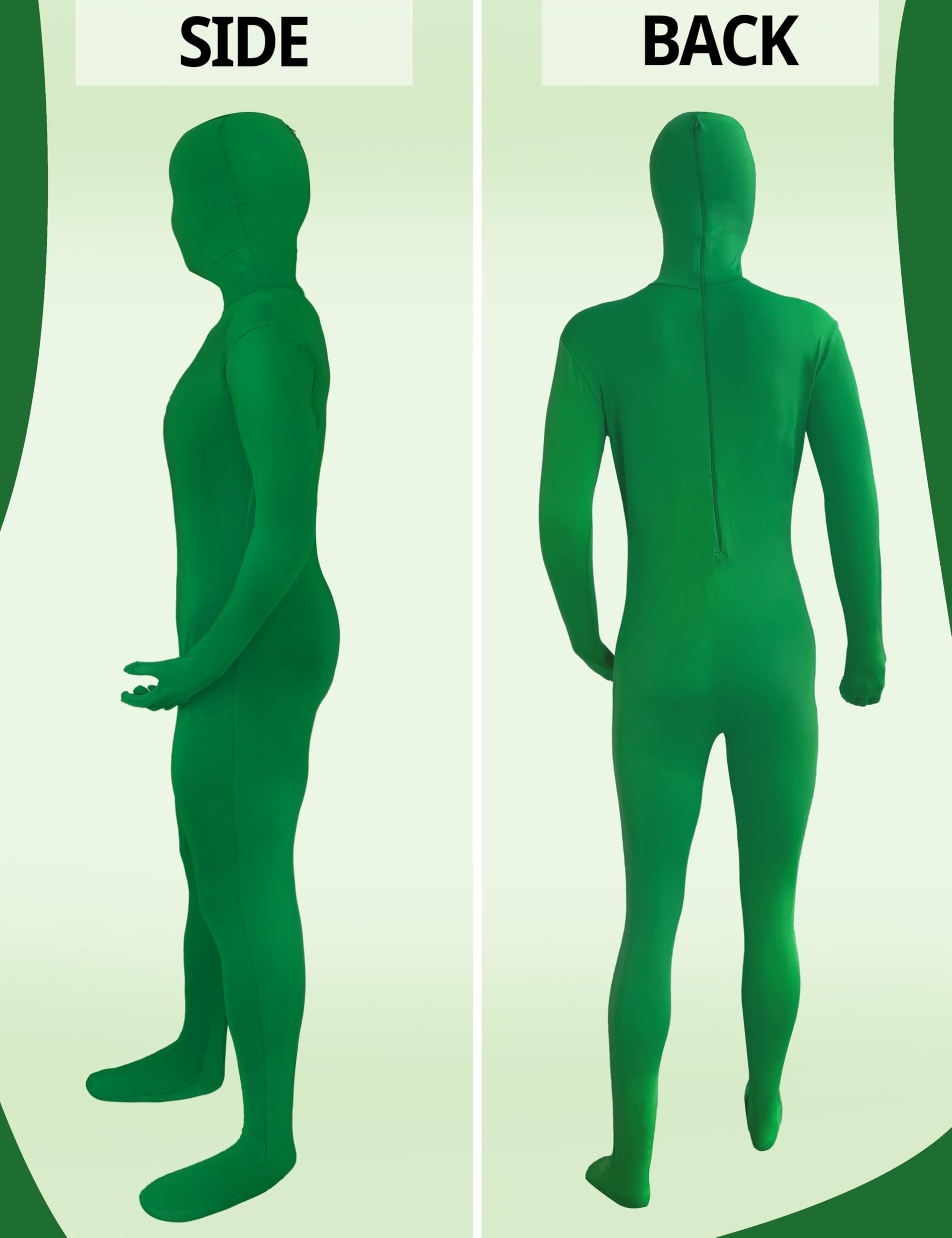 Green Screen Suit: Suitable for a wide range of occasions, for Halloween, cosplay, and dressing parties, suitably as the green backdrop to making photo or video special effects. You can cut or DIY other accessories for more styles.