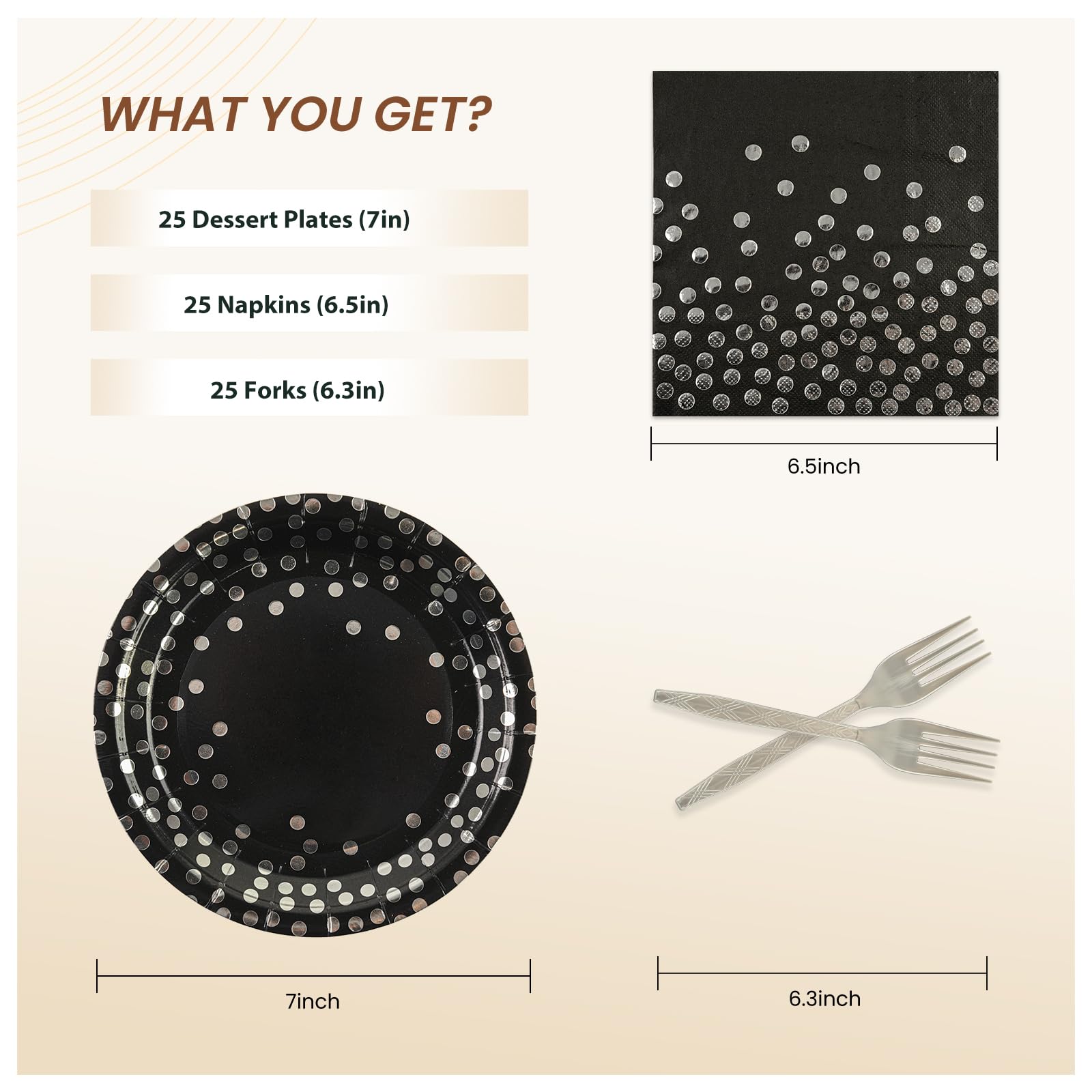 【25 Guests Party Tableware Set】: In this black and sliver tableware set, you will get 25*7 inches dinner plates and 25*6.5 inches napkins and 25 sets of gold forks. Perfect for serving salads, desserts, cakes, appetizers and more. Enough to meet your party needs, it's a great choice for your party tableware!