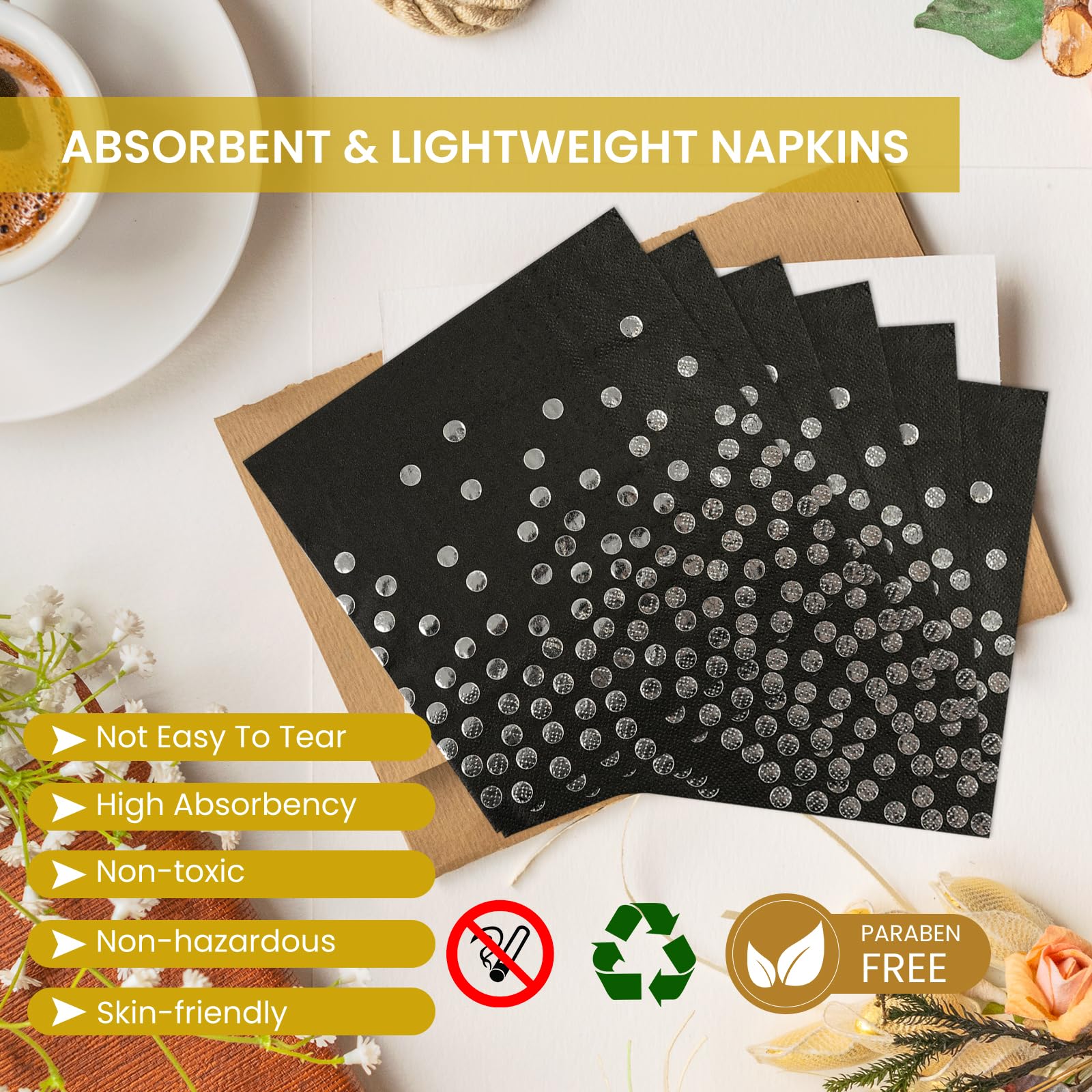 【HIGH QUALITY MATERIALS】: Our black and sliver dot paper plates are made of 350gsm thickened eco-friendly paper, not easy to break or tear, durable, safe and non-toxic, BPA free biodegradable, convenient and environmentally friendly, no need to worry about harming the environment. The napkins are made of food grade water-based ink, highly absorbent and very skin-friendly.Please do not microwave the paper plates!