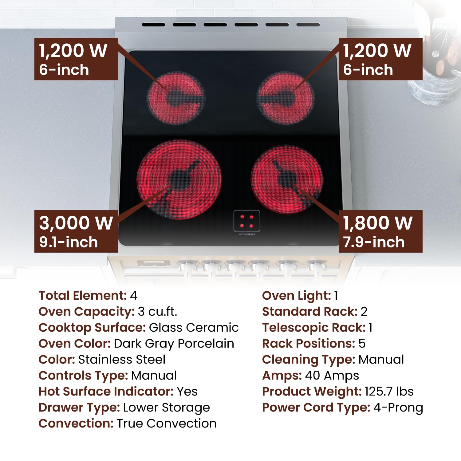 SMOOTH GLASS SURFACE: Our electric ranges feature a smooth ceramic glass surface that is easy to clean and maintain, making it perfect for busy home chefs who want to spend less time cleaning and more time cooking delicious meals.