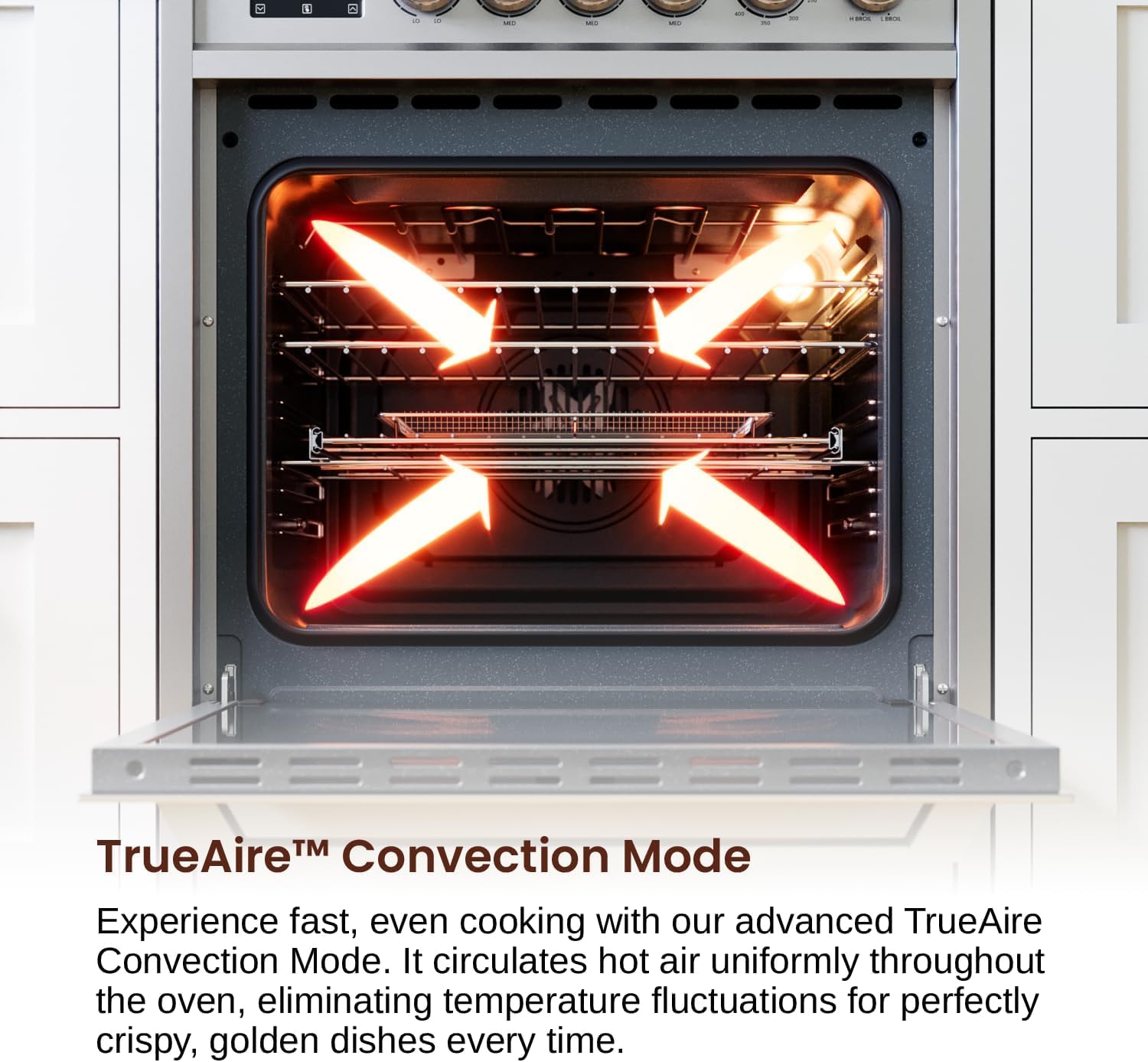 TRUEAIRE CONVECTION OVEN: Our advanced TrueAire Convection Oven ensures that hot air is evenly distributed throughout the oven, with a dedicated convection heating element and fan that allows food to cook more quickly and evenly. This results in perfectly cooked dishes with crispy crusts and juicy centers, every time. Plus, with faster cooking times, you'll save energy and have more time to enjoy your delicious meals.