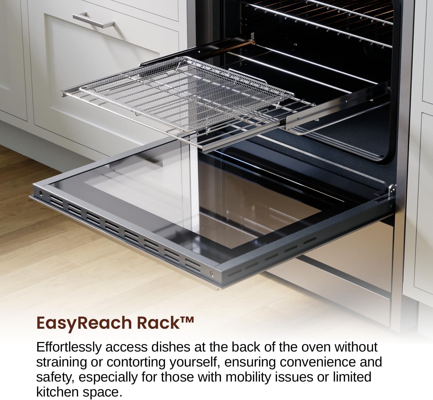 EASYREACH RACK: EasyReach Rack - With our telescopic oven racks, you can easily reach dishes at the back of the oven without having to strain or contort yourself. This makes it easier and safer to access your food, especially if you have mobility issues or limited space in your kitchen.