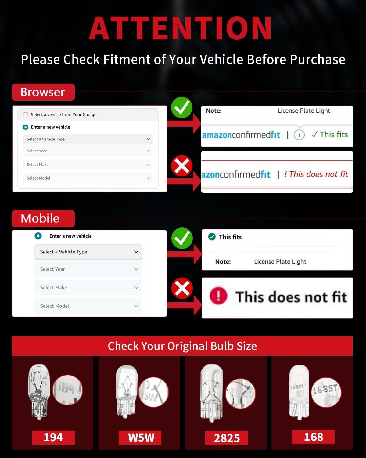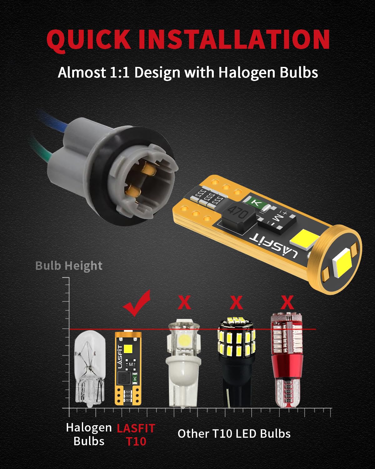 【5 Mins Installation】1:1 Design with halogens, Non-polarity, Plug and Play, no need for modification or flip. The led bulb is fit for socket T10, 147, 152, 158, 159, 161, 168, 175, 184, 192, 193, 194 2825 W5W, 549, 12961. The bulb size is 0.35"*1.0". Installation Tips: If you encounter difficulty inserting the bulb into the socket during installation, please try to push it a little harder to get it in.