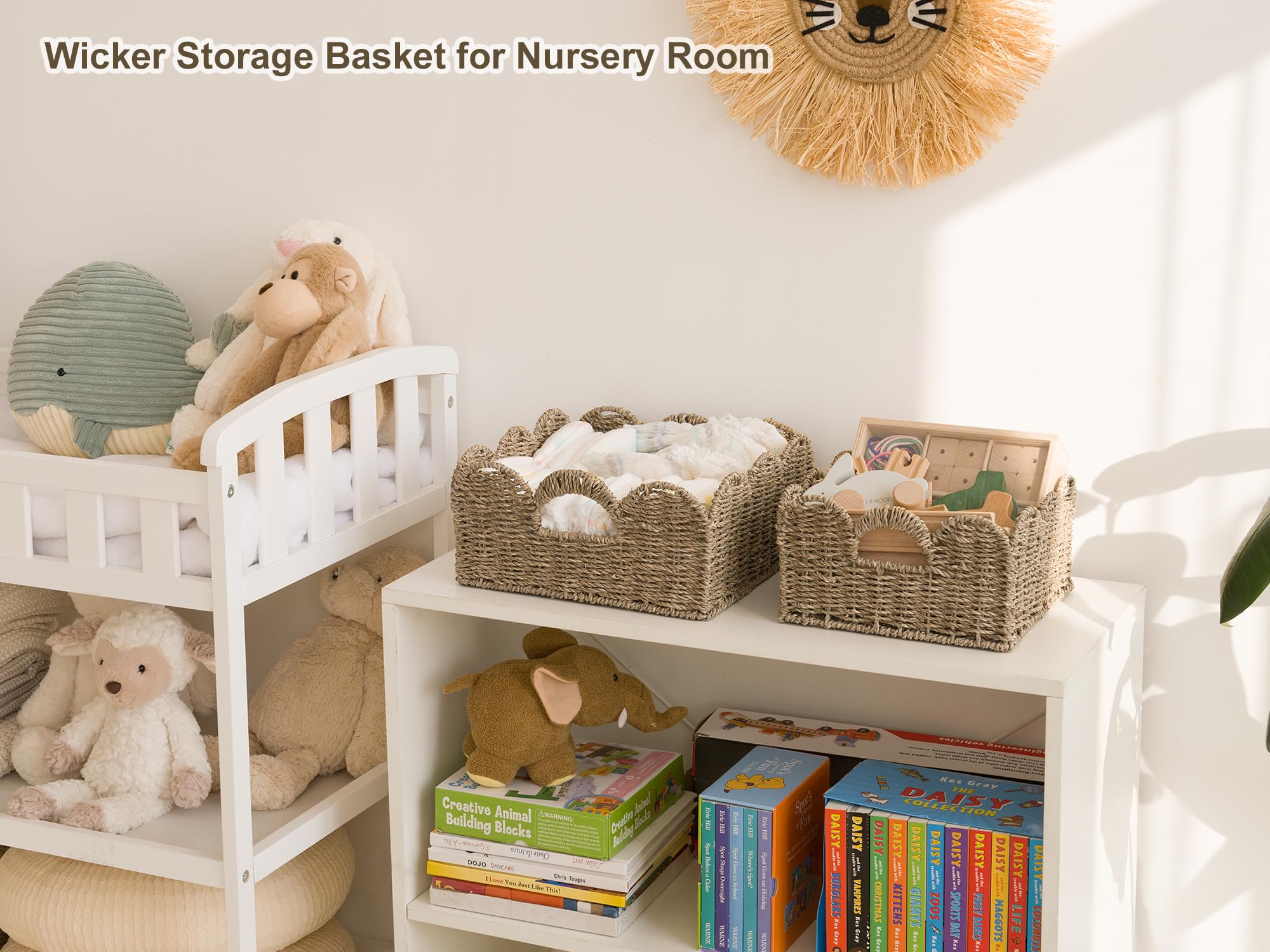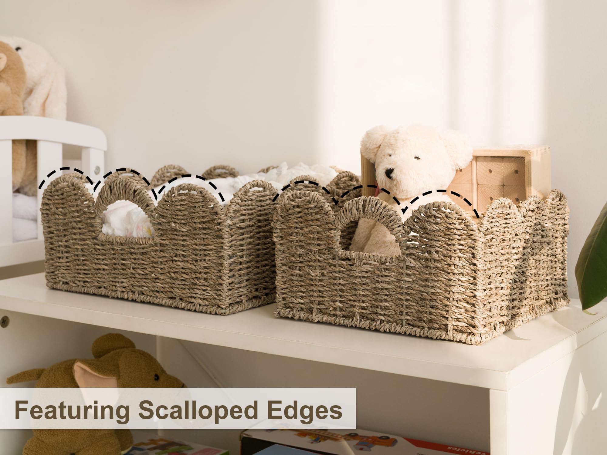 This set of scalloped baskets comes in two size, measuring 9 Β½" L x 9 Β½" W x 5" H (Small) and 11 Β½" L x 11 Β½" W x 5 ΒΎ" H (Medium). The color of this storage basket may differ slightly from the image because it is made from natural materials.