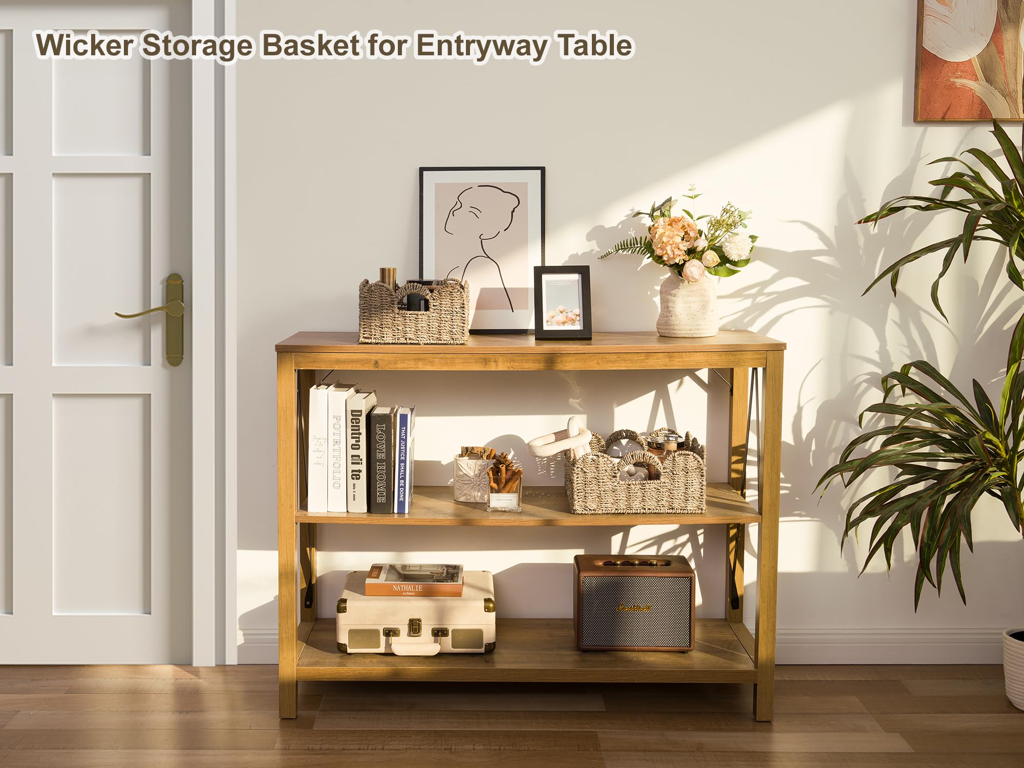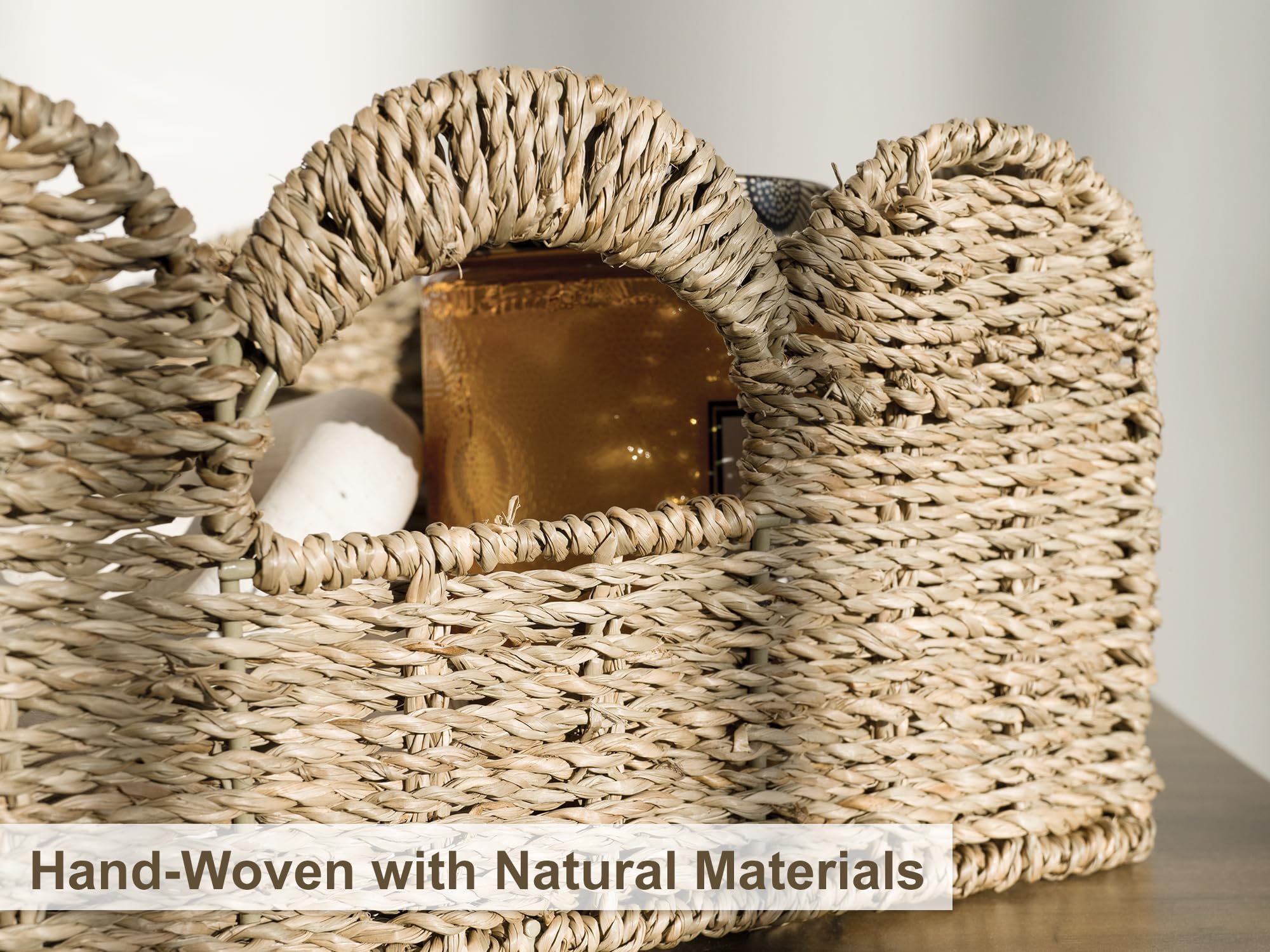 The handwoven storage basket is crafted from natural seagrass over a sturdy iron frame by skilled artisans.