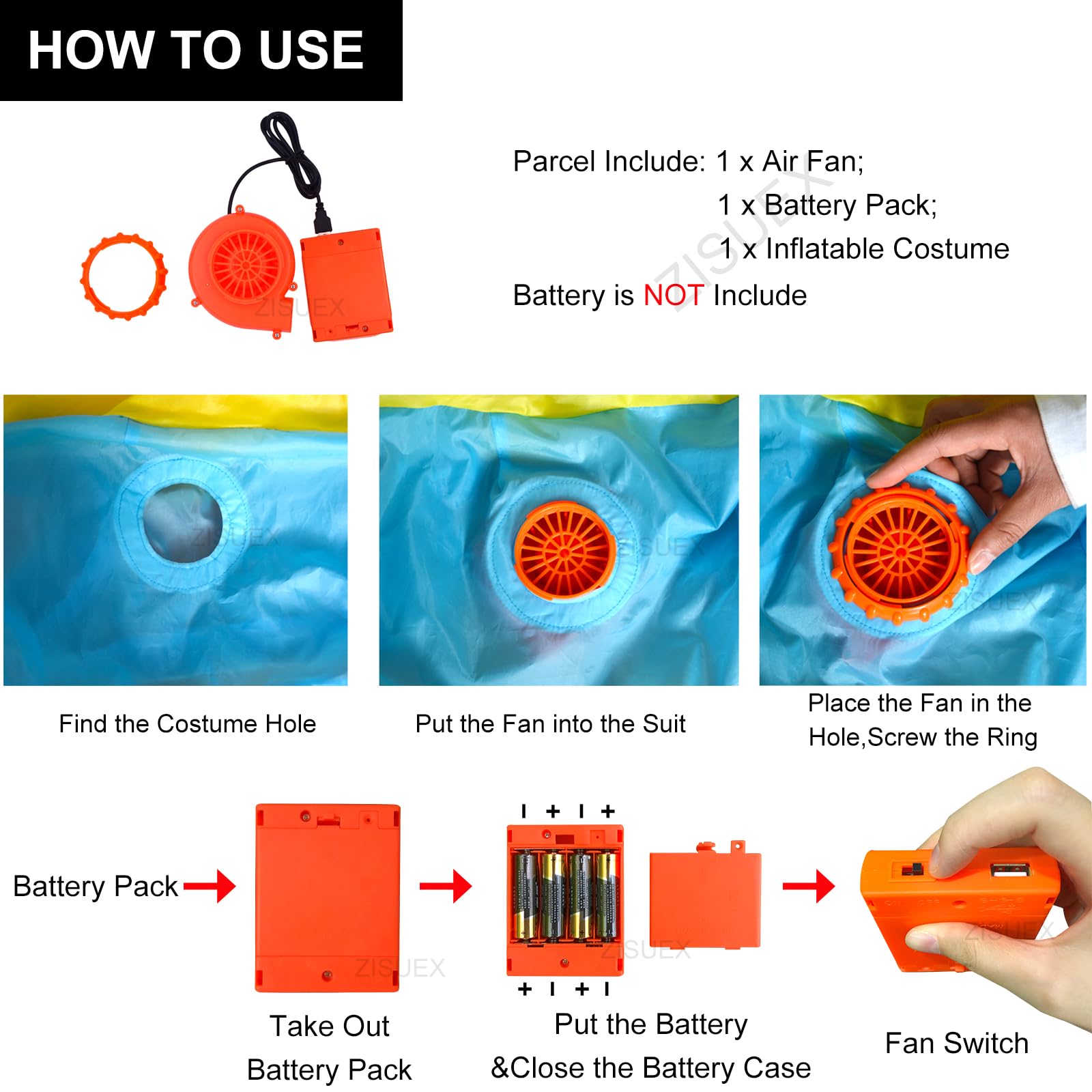 Description ZISUEX Inflatable Costume Blow Up Suit Sports Party Game Fat Cosplay Animal Fancy Dress Halloween Costume Jumpsuit Christmas Costume Gift Fancy Dress Cosplay Outfit Gift FEATURE: MATERIAL:100% Polyester SIZE:suitable for the people between 4.9ft (1.5M) to 6.2ft (1.9M) . USB fan design:requires 4 AA batteries and USB connected mobile power,faster and more convenience to use. PACKAGE INCLUDE: 1 X Inflatable Costume 1 X USB Mini Fan Blower (not include battery) you can walk, run, jump, ride when wear the inflatable costume,will have a pleasant weekend, holiday or party fun with your friend,parents