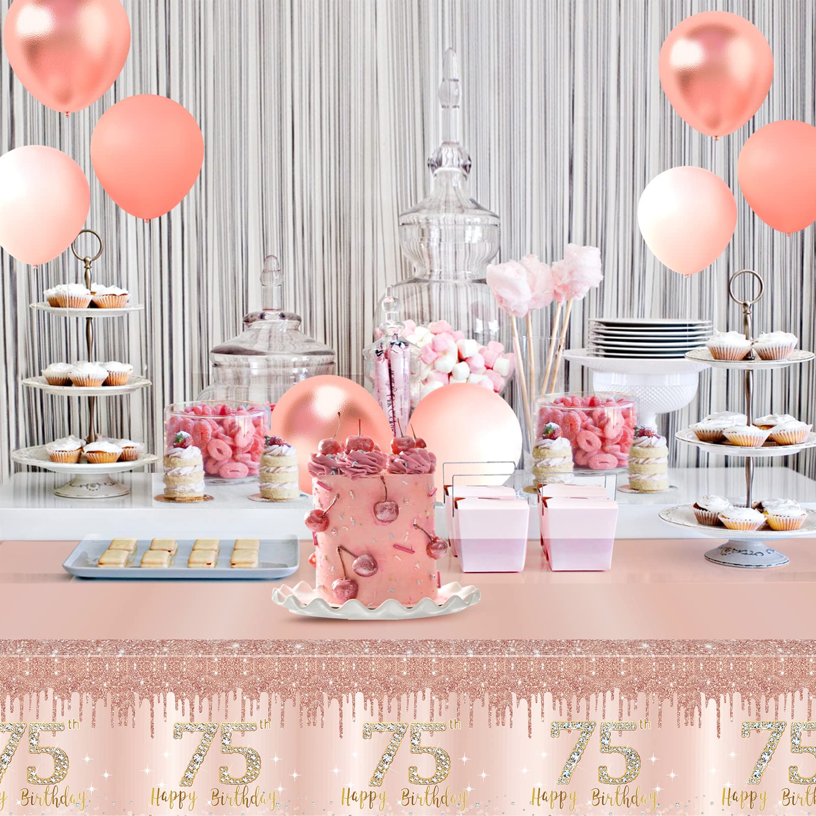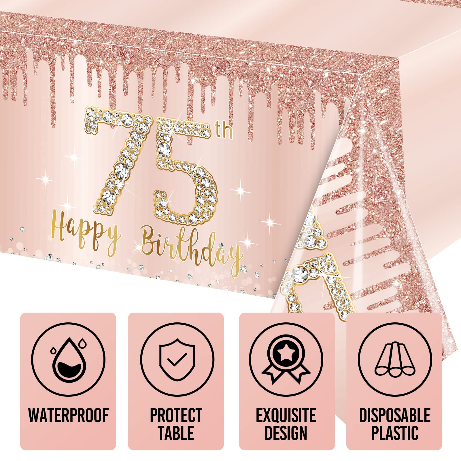[Unique Design] - A birthday rectangular tablecloth designed specifically for 75 year old women, with an elegant rose pink background and a striking "Happy 75th Birthday" paired with sparkling stars and rose gold pink diamond party elements. The design is very beautiful and innovative, and can add gorgeous decoration to your birthday party.