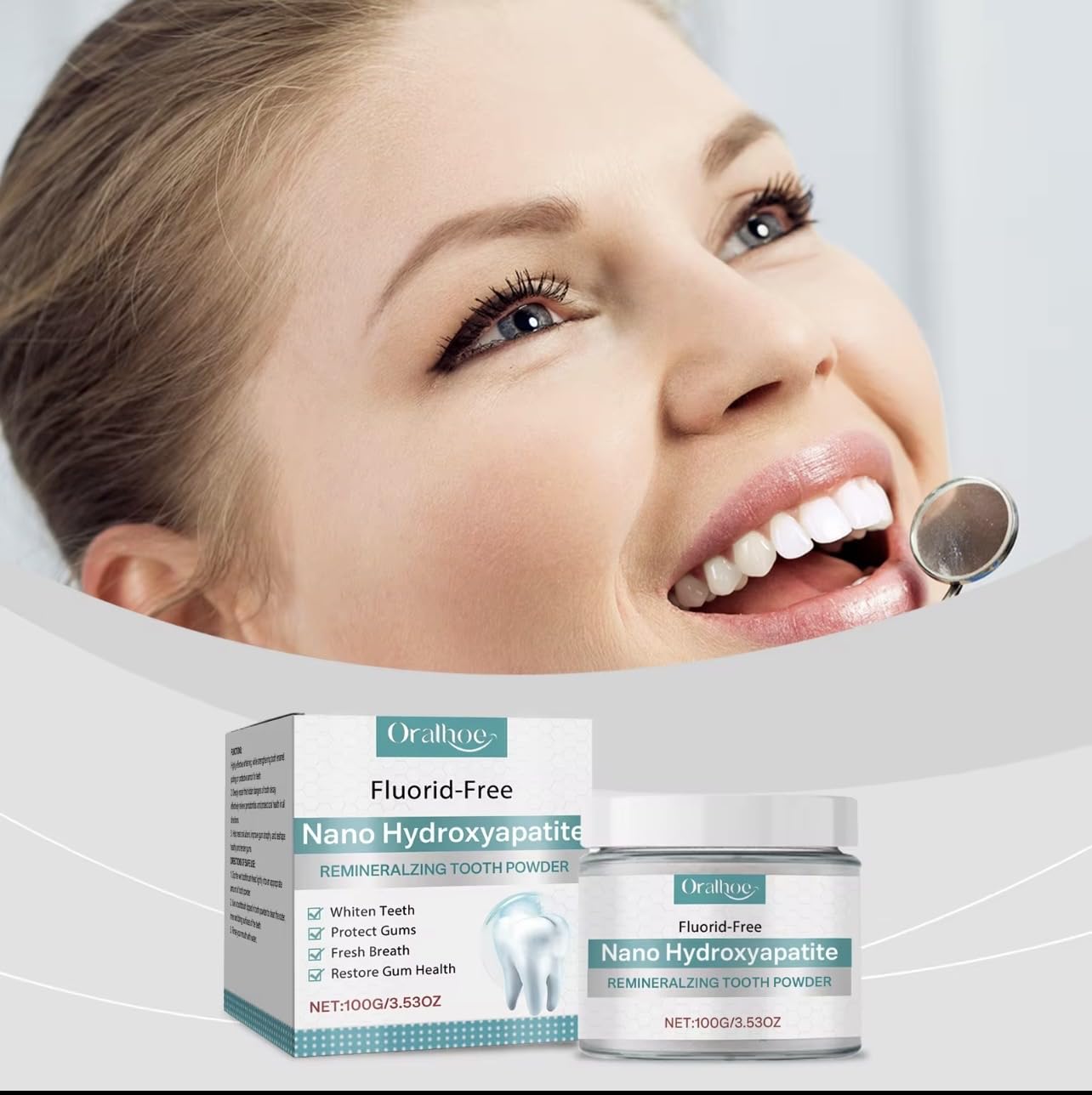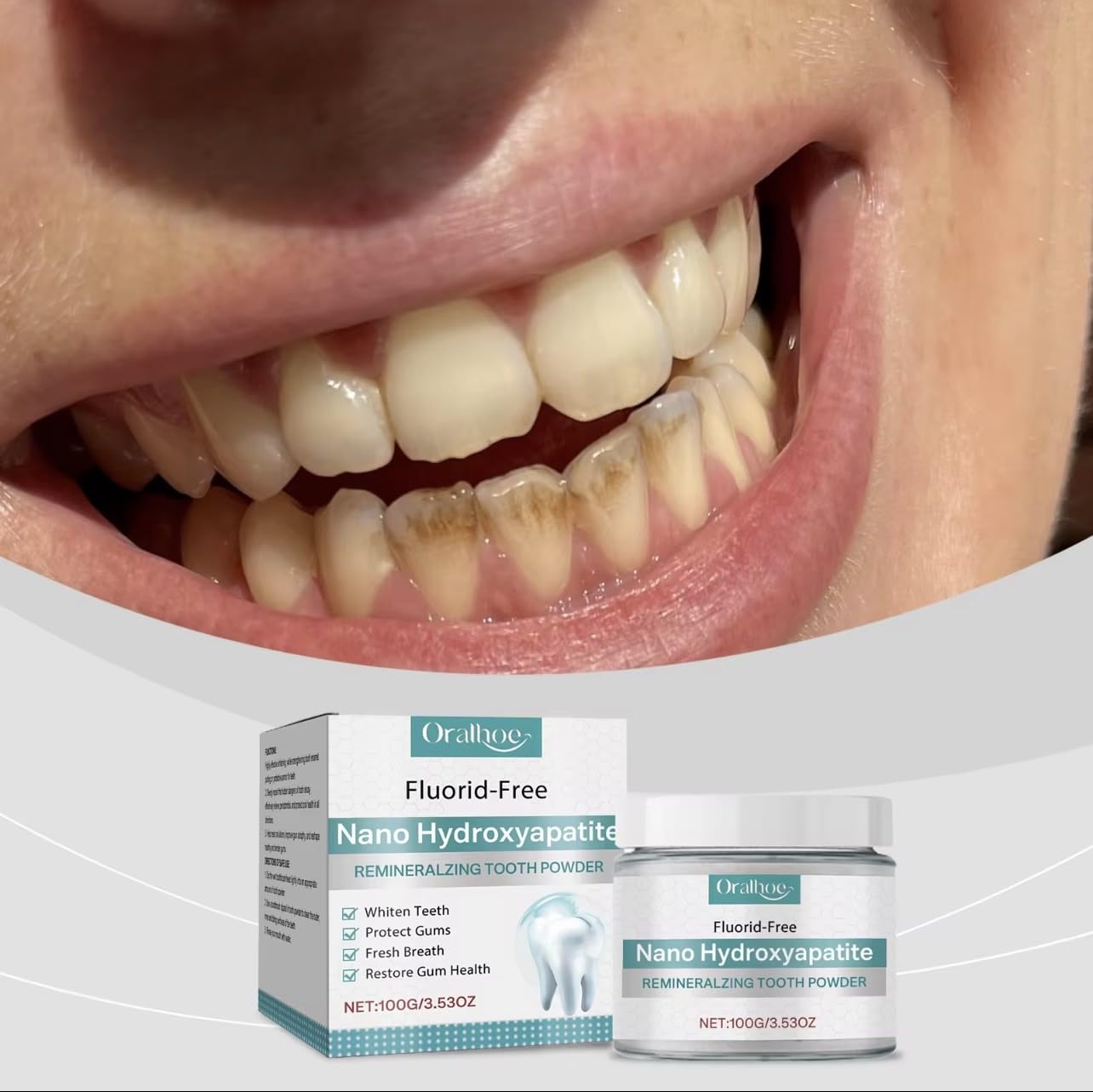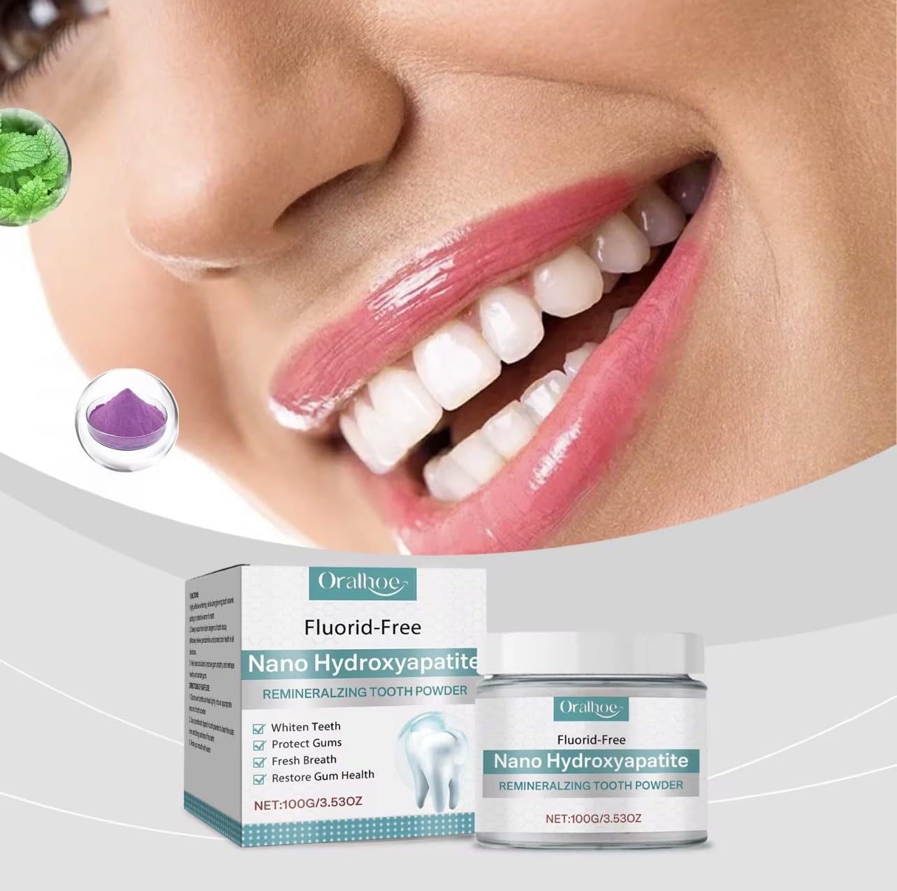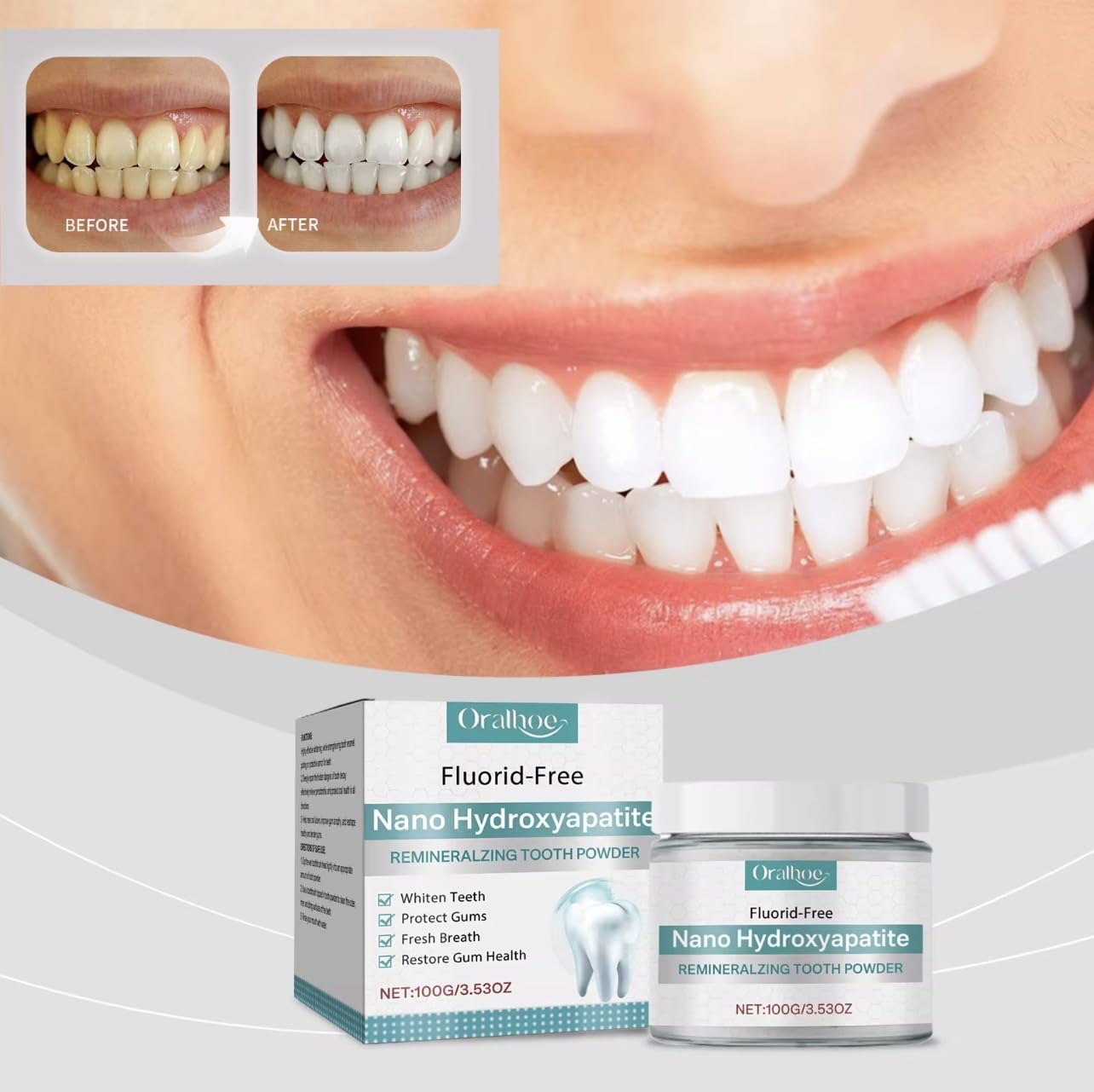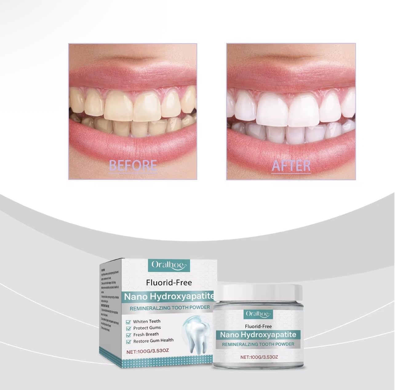 Transform your dental care routine with this innovative Nano Hydroxyapatite Remineralizing Tooth Powder. This fluoride-free formula offers a comprehensive approach to oral health, featuring 100g (3.53oz) of powerful whitening powder that helps restore natural tooth brightness while supporting gum health. The advanced nano-hydroxyapatite technology works to strengthen tooth enamel and promote remineralization, addressing multiple oral care needs simultaneously. Users can expect noticeable improvements in tooth appearance and fresh breath. The powder format provides an alternative to traditional toothpaste, delivering concentrated ingredients for effective cleaning and whitening. Perfect for those seeking a fluoride-free option without compromising on results, this tooth powder helps maintain optimal oral hygiene through its unique remineralizing properties. Regular use helps maintain white teeth and healthy gums while providing a fresh, clean feeling that lasts.