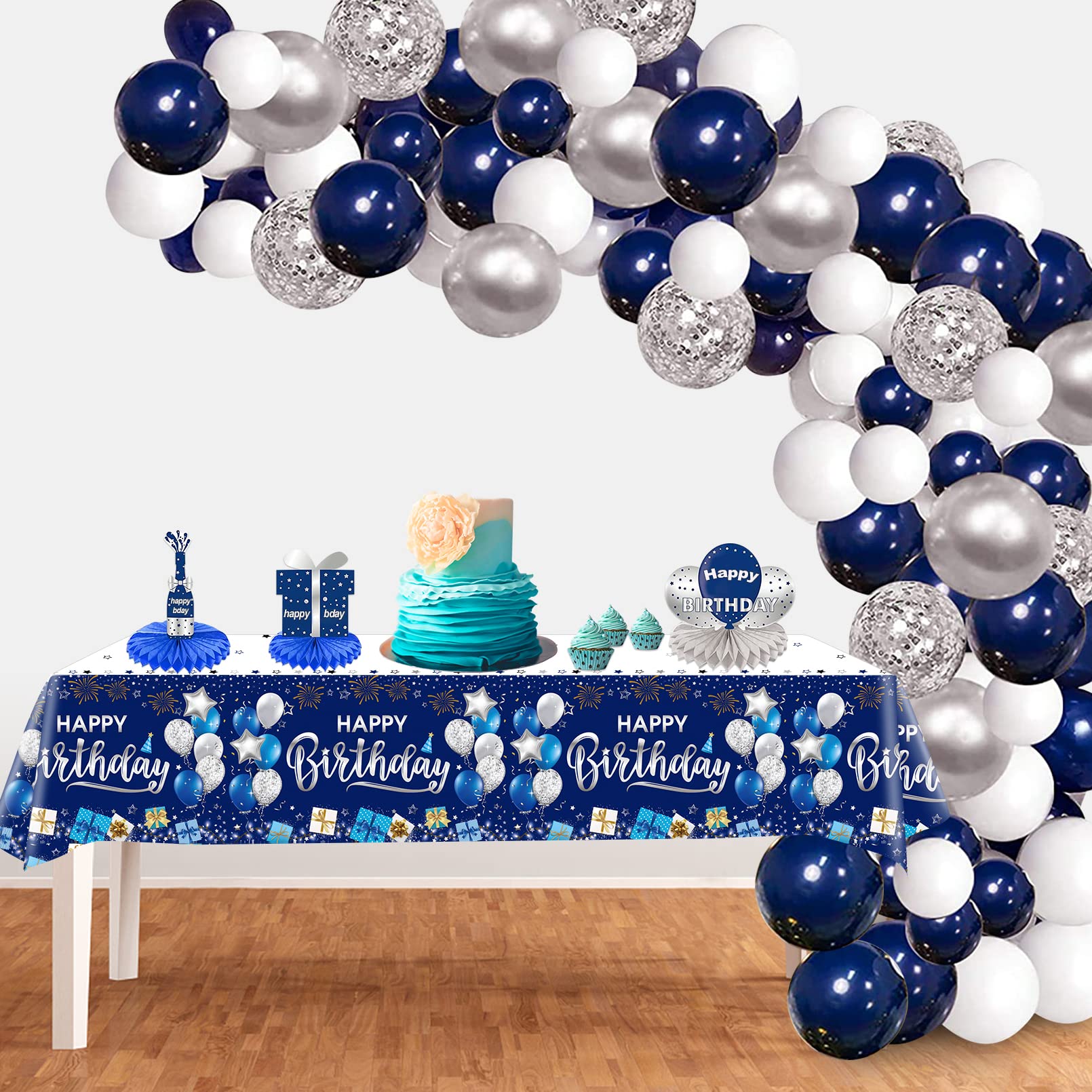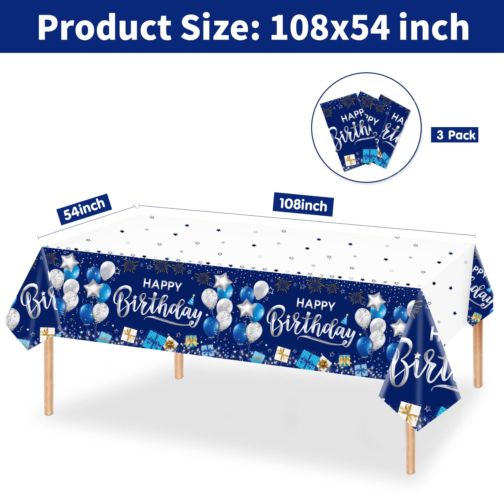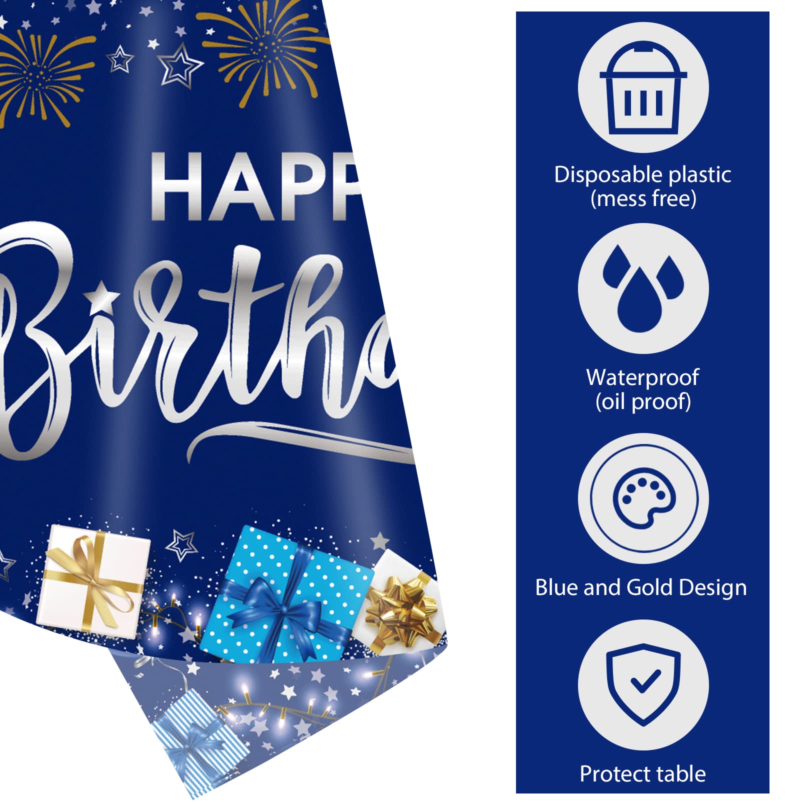 【what’s in the package】: Includes 3 pieces of happy birthday tablecloth, printed with blue and silver sign, firework, balloon, gift box, “Happy Birthday” words etc. All these can add more birthday atmosphere for your party!