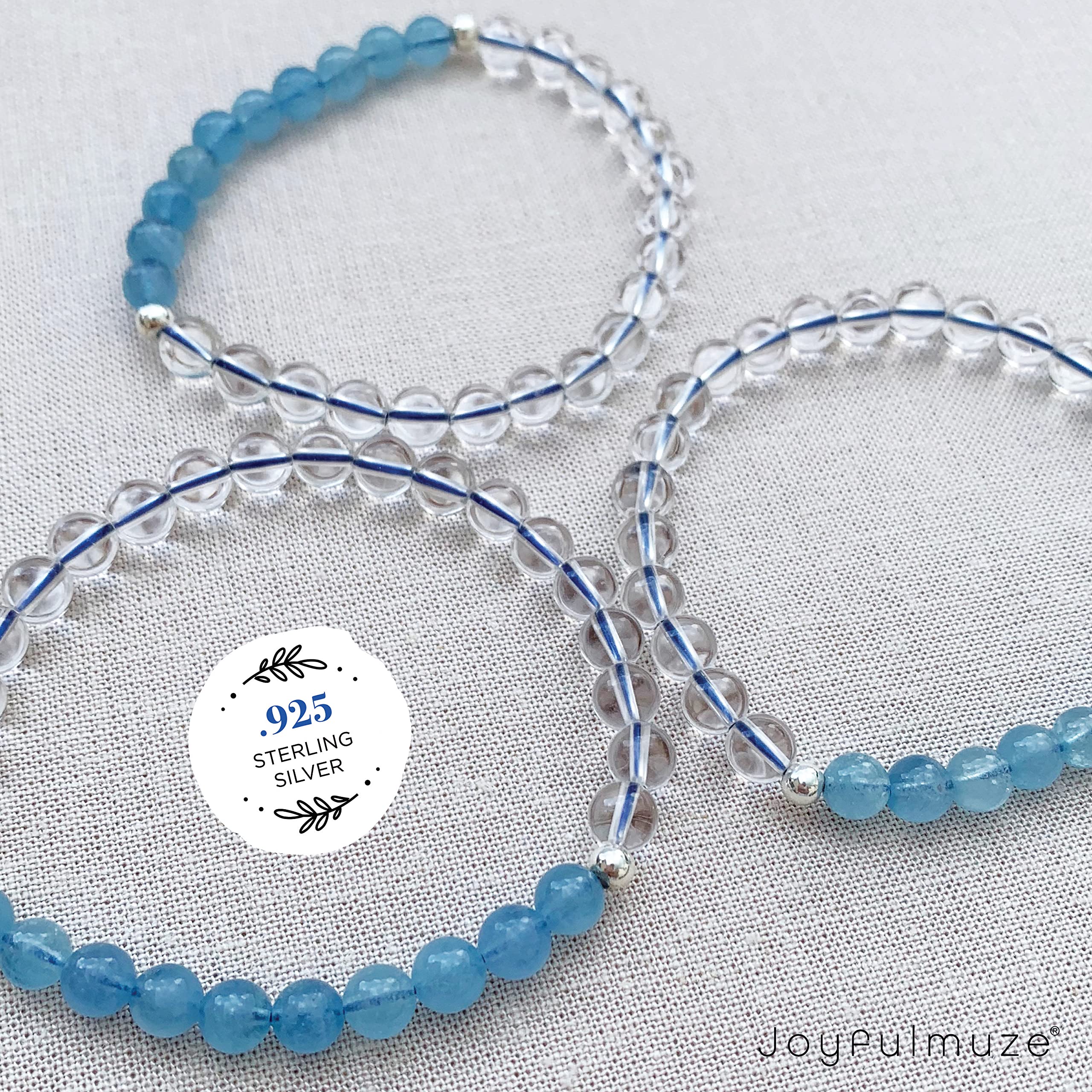 CALMING COLORS: Simple handmade on stretch elastic cord genuine 6mm aquamarine and natural 6mm clear quartz crystal round beads with sterling silver beads on each side, genuine semi-precious gemstones.