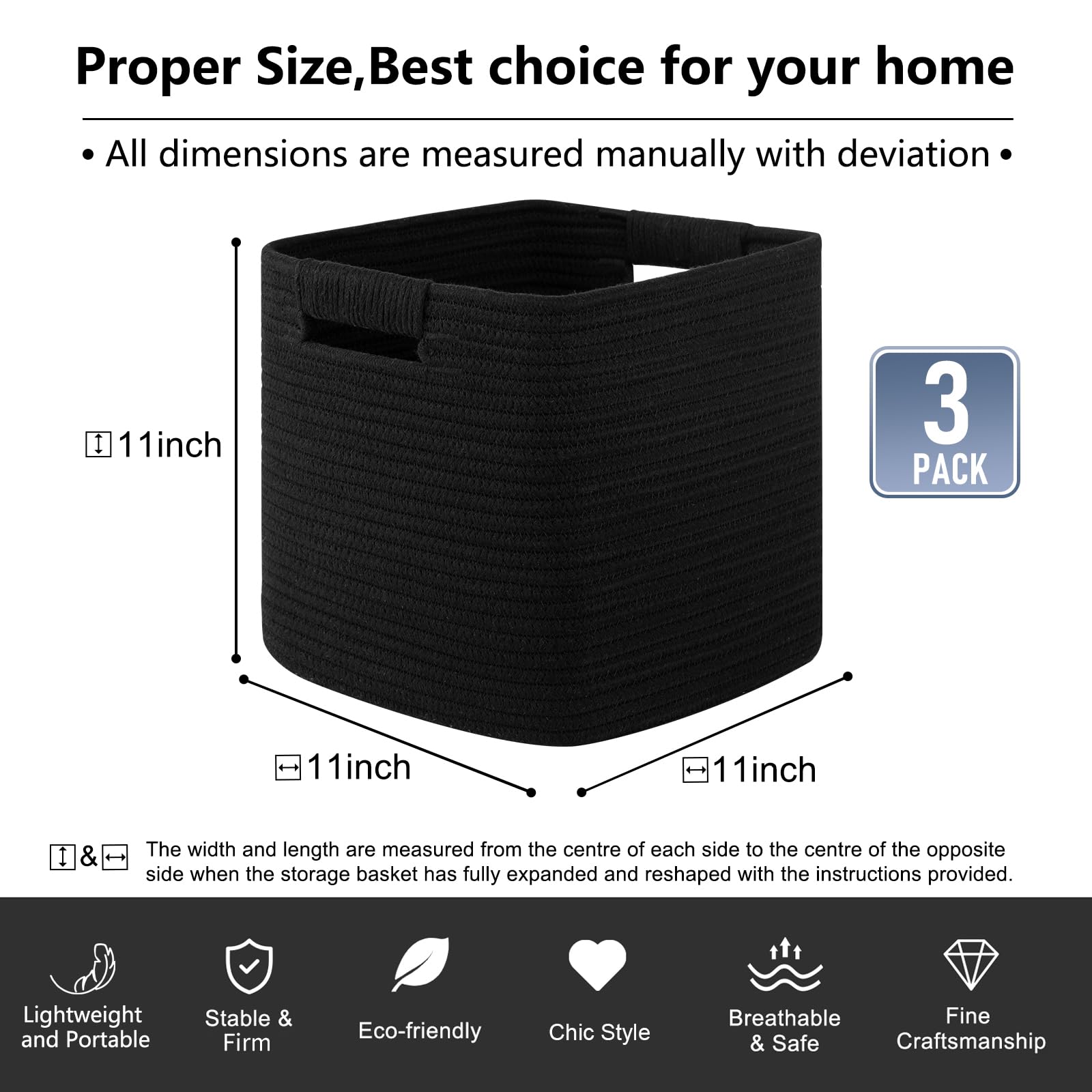 Well-Sized Bins with Reinforced Handles- Set of Three (3) Basket:11"x11"x11"inch, large capacity, convenient to store more daily necessities.Our baskets are handmade with flexible material, which may result in slight size variations. Measurements should be taken from the center of each side to the center of the opposite side after the bins are fully unfolded & expanded