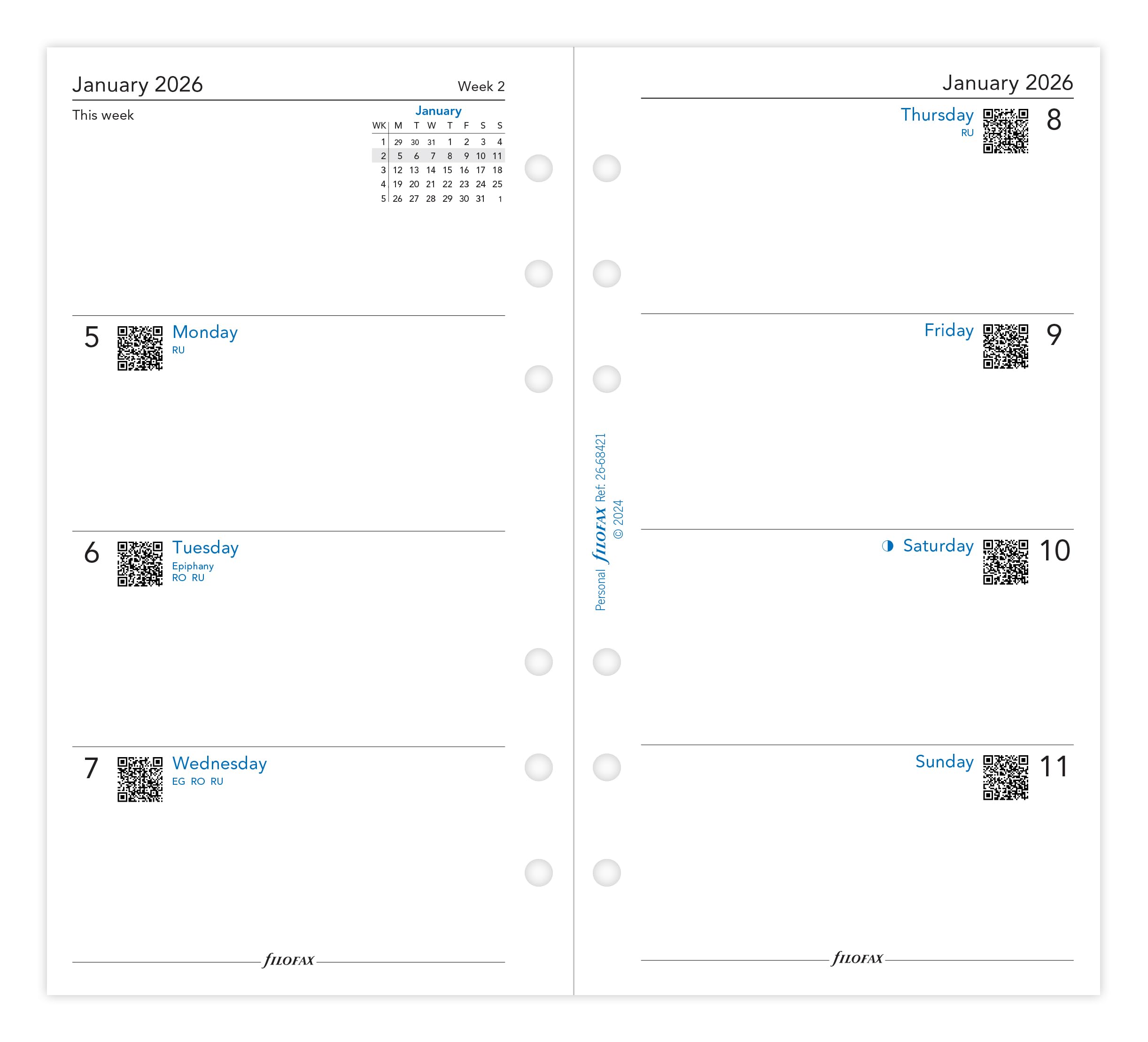 This Filofax Personal 2026 diary refill 26-68421 features a QR code on every day which, when used together with the Filofax Reminder App, allows you to plan on paper and review on your phone. Simply download the free Filofax Reminder app and scan the QR code on the date of your choice. This will allow you to not only copy appointments from your diary onto the App, but also set up reminders. The appointments can also be synced with your phone's calendar. This innovation will allow you to always have the important contents of your diary with you. This Filofax Personal 2026 diary is a week on two pages format in English, with the week to view starting on a Monday. January to December 2026. Paper size 95mm x 171mm, drilled with six round holes. Made in the UK.