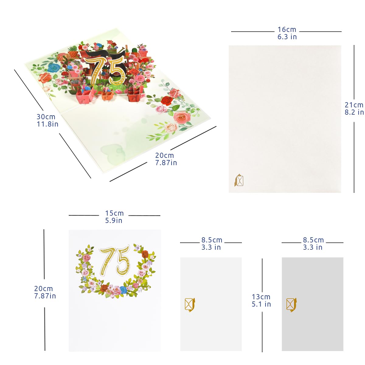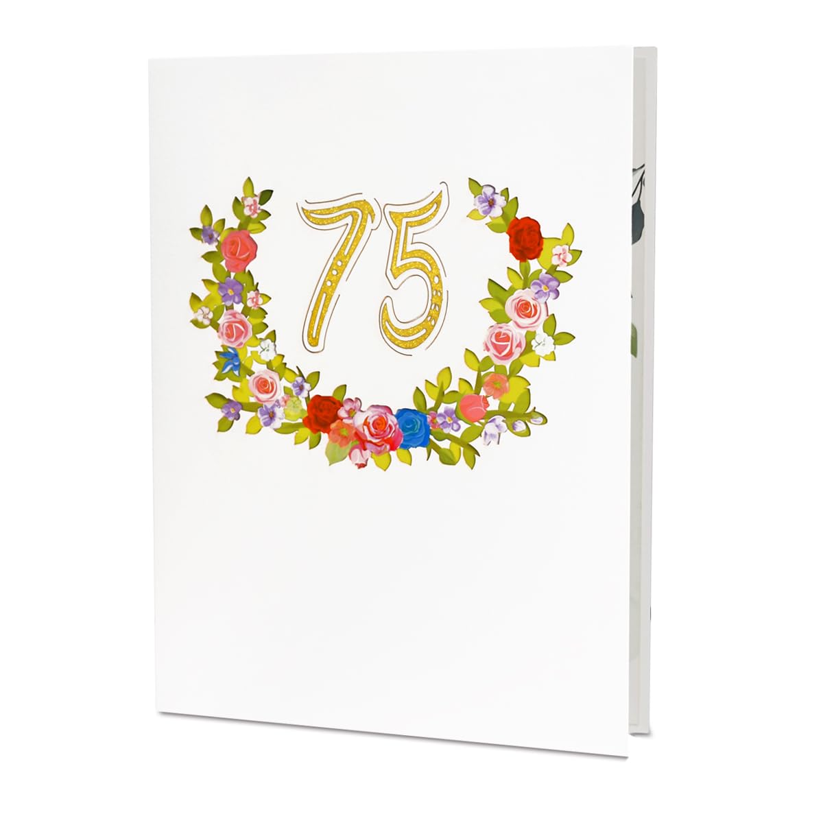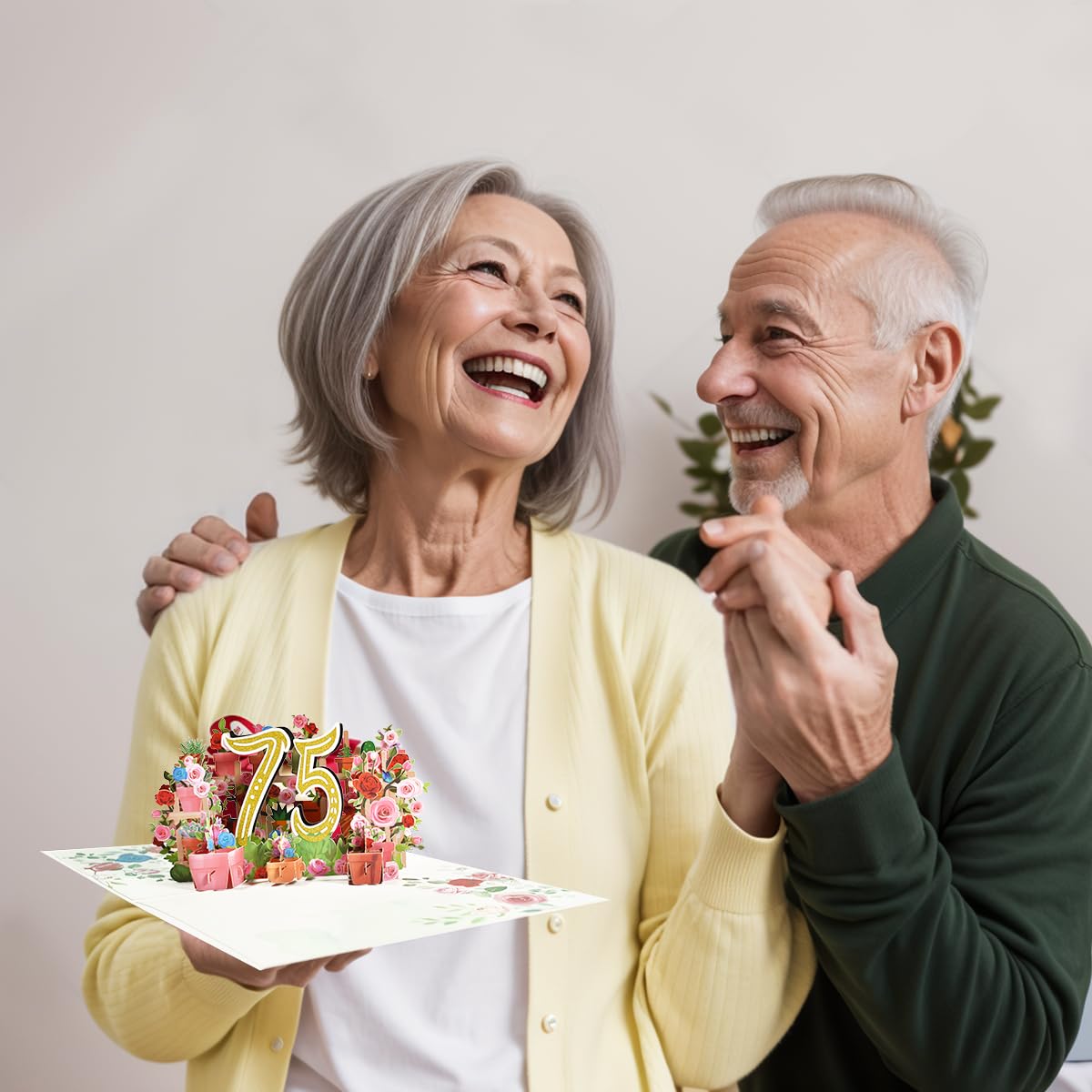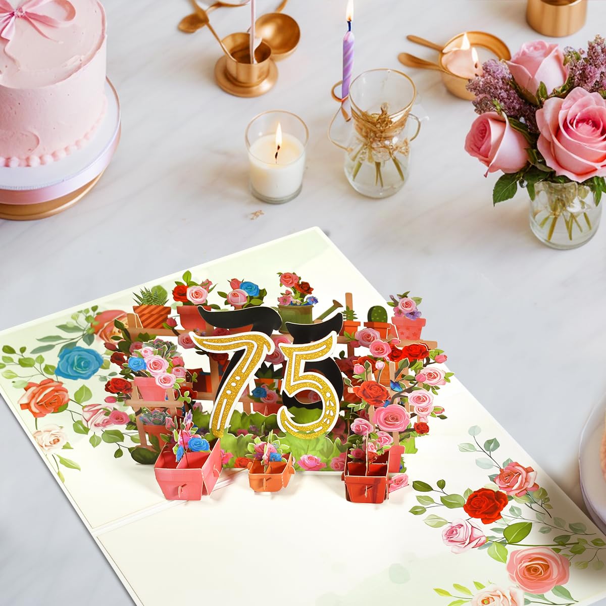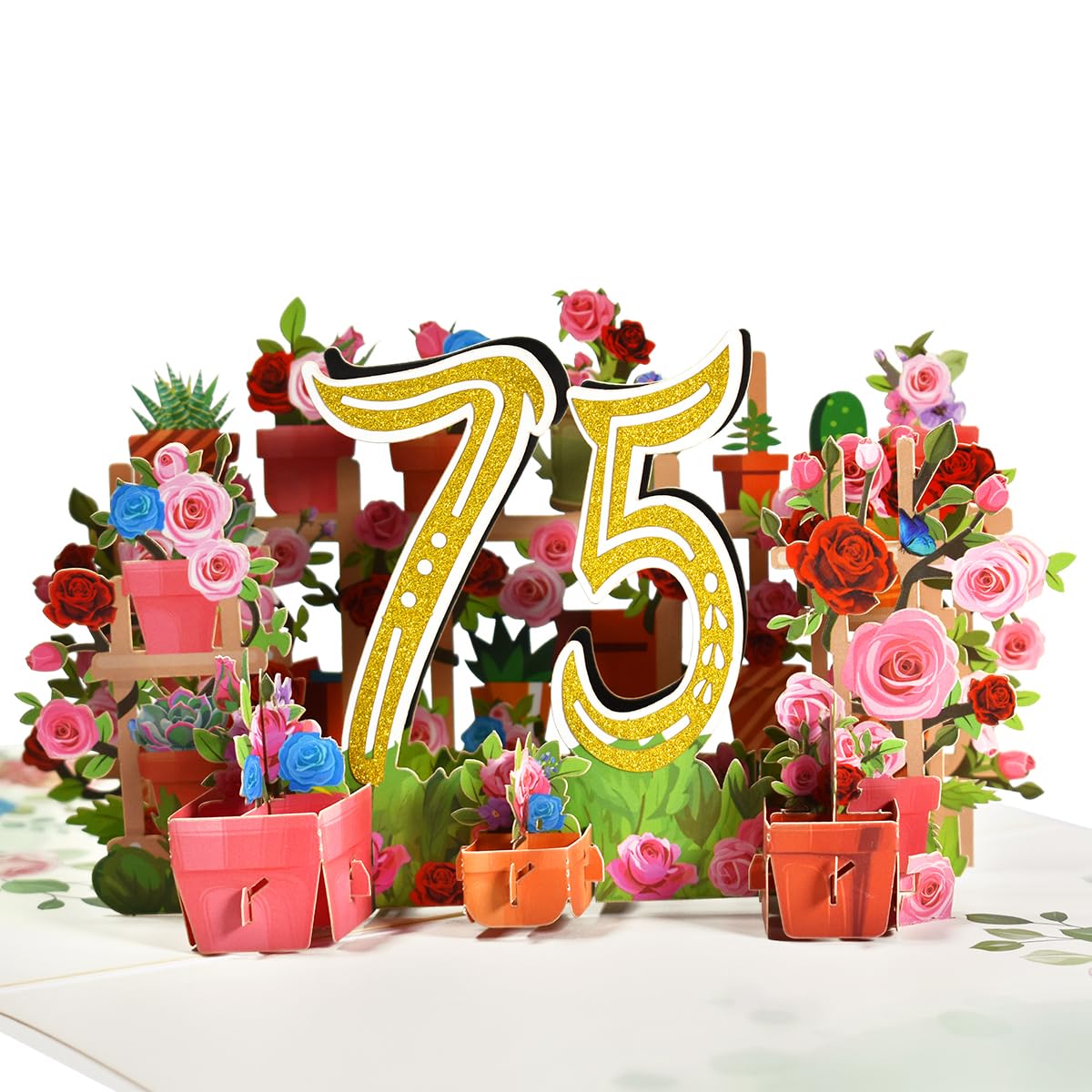 【75th Birthday Cards】The beautiful pop-up flower birthday card features an exciting and unique 3D design. Open the card to a scene of happiness with flowers, presents, and an "75" at the center of the card. Give it to your loved one or your parents, grandparents and it will surely surprise and delight them.