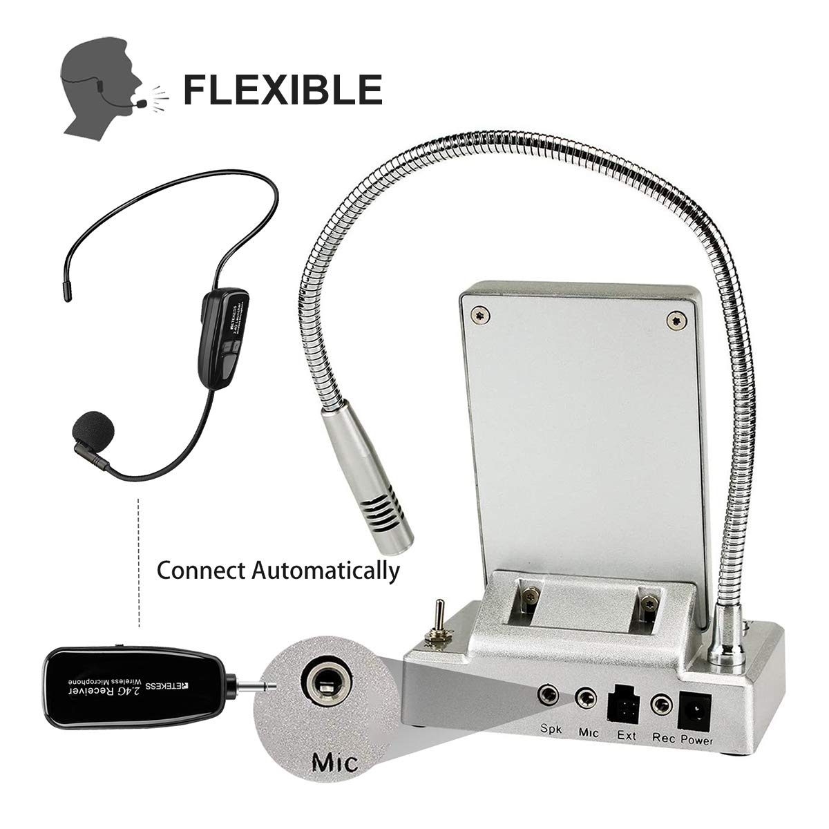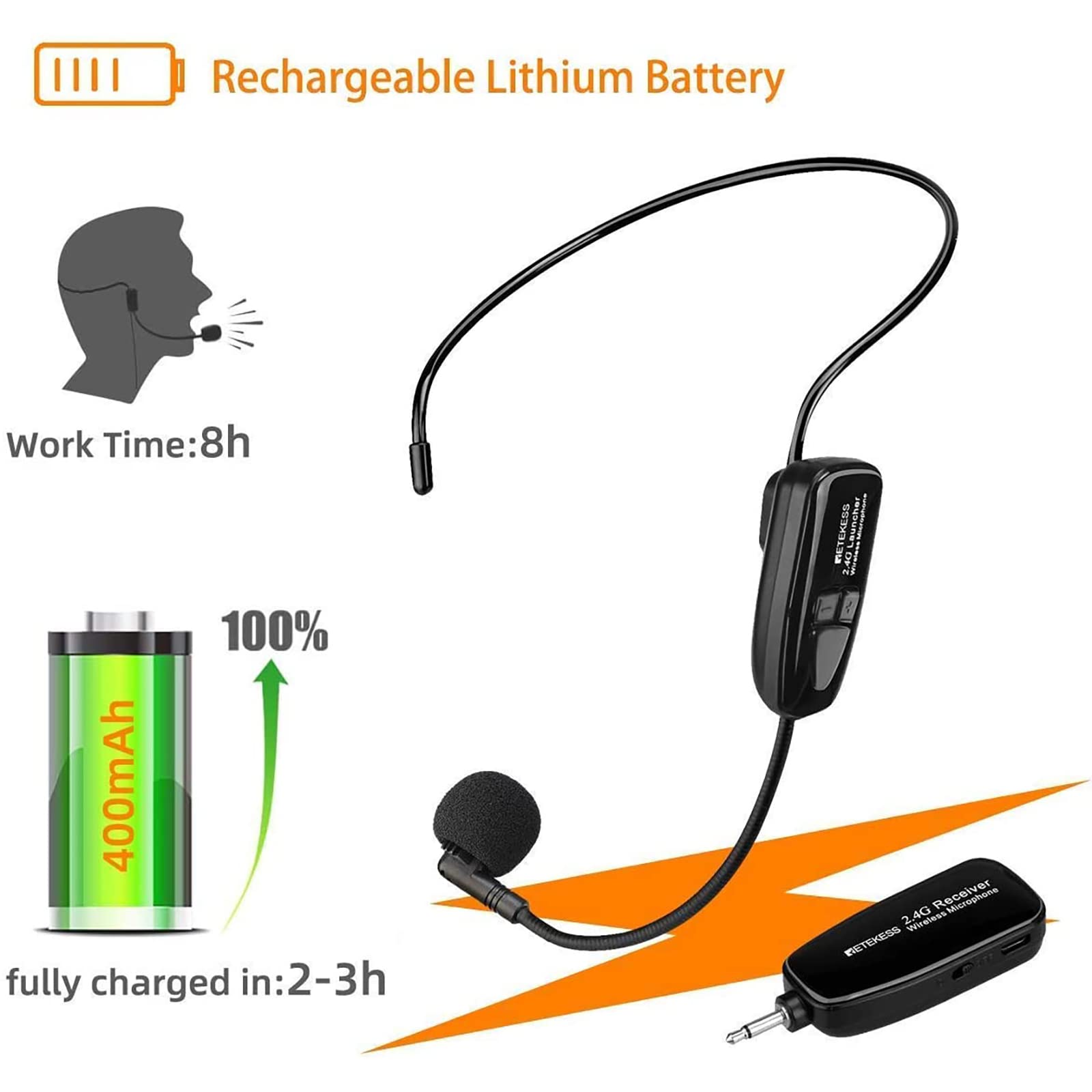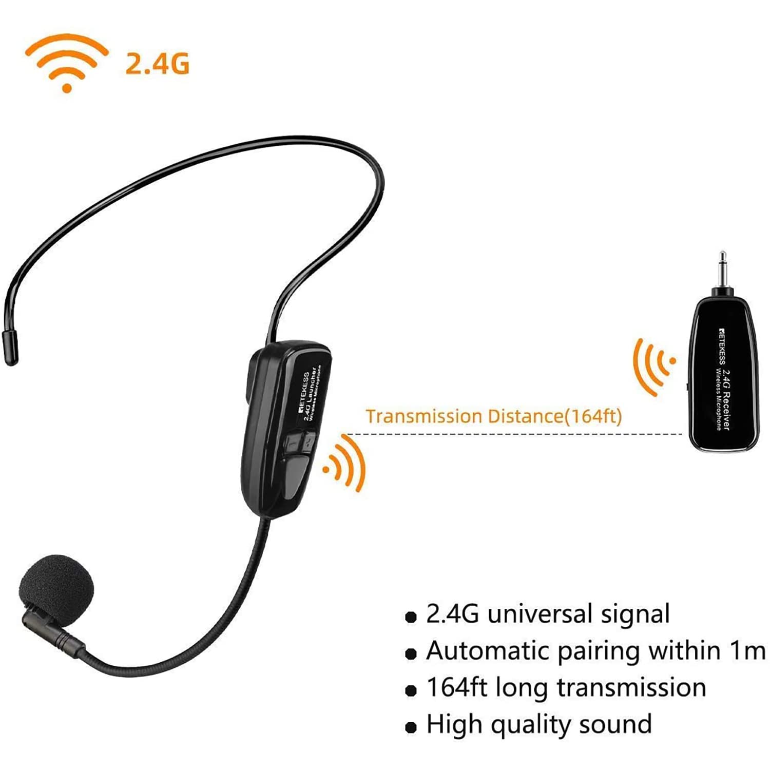 2.4G Wireless Mic; TT123 wireless microphone headset adopts global universal 2.4 GHz transmission; connect automatically within 3.2ft