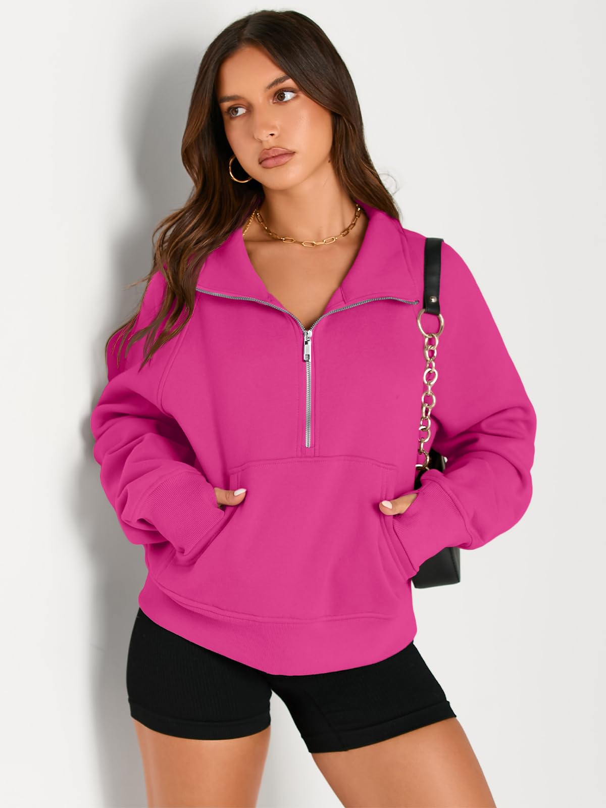 ★Fashion: 1/2 zip up collar sweatshirt, the zipper works smoothly, solid color, stand collar, y2k clothing, fleece lined, soft inside, relaxed fit, crop top