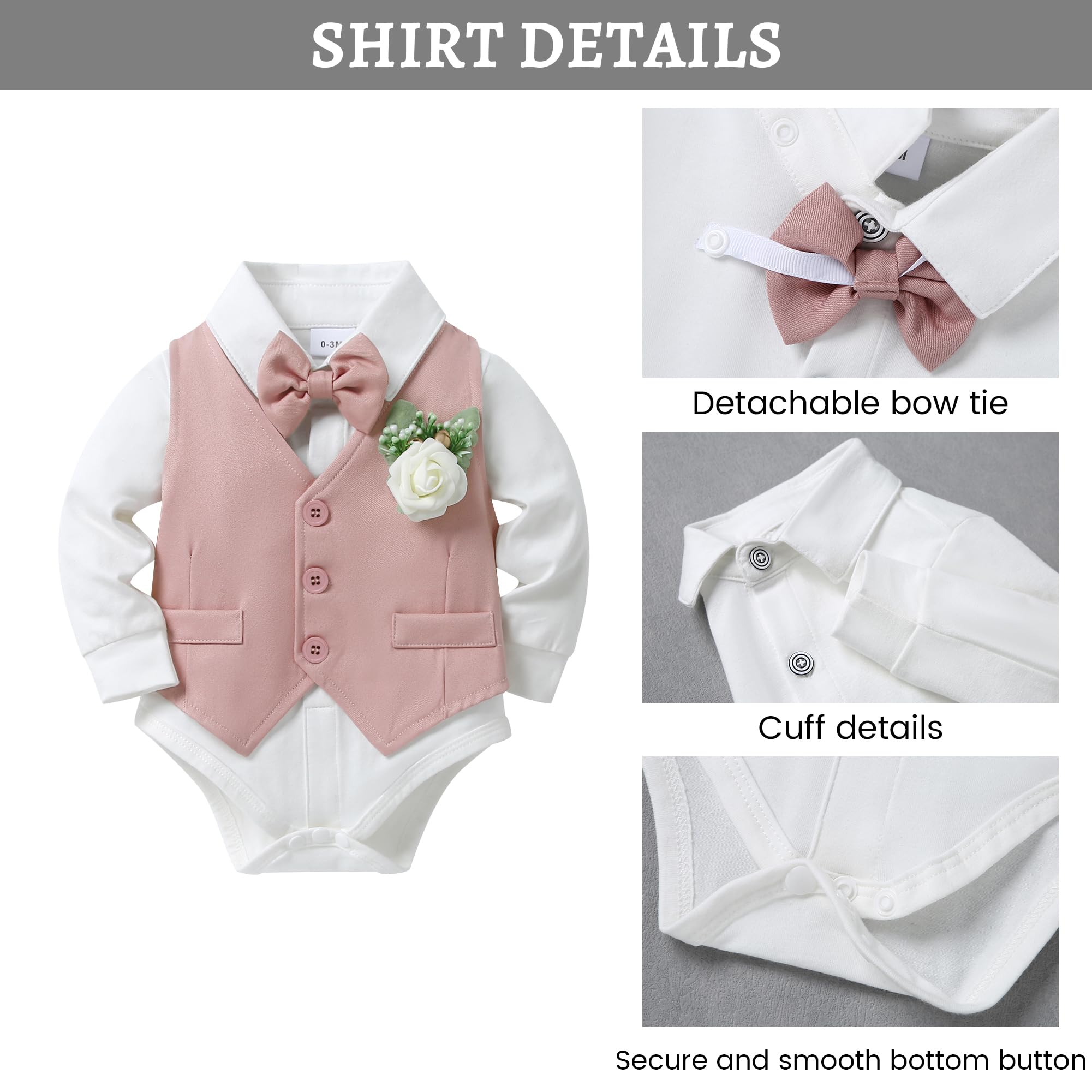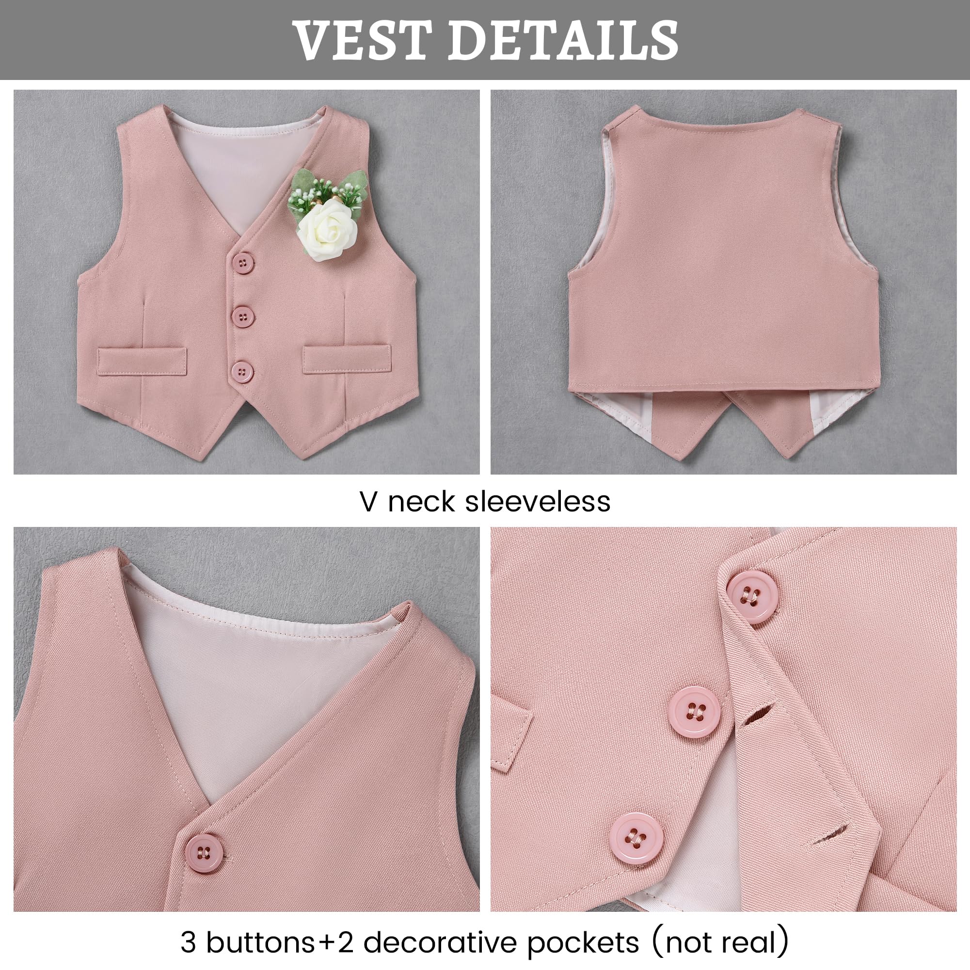 Vest Details:This baby boy suit 5Pcs baby boy formal outfits set includes a Detachable Boutonniere,a vest that features 3 buttons single-breasted closure and double lining in the back, optimal warmth, and ease of layering