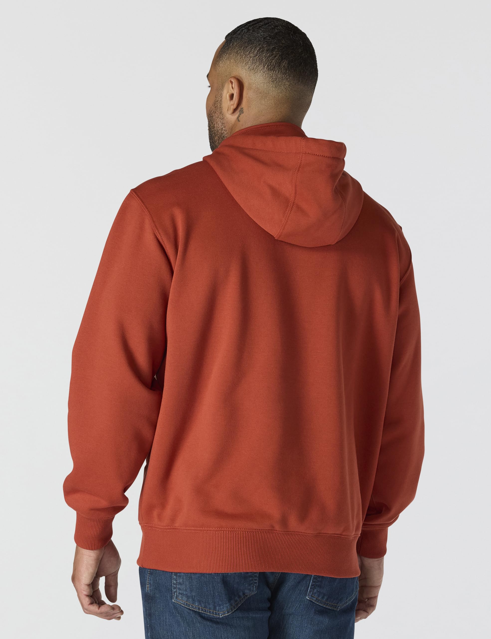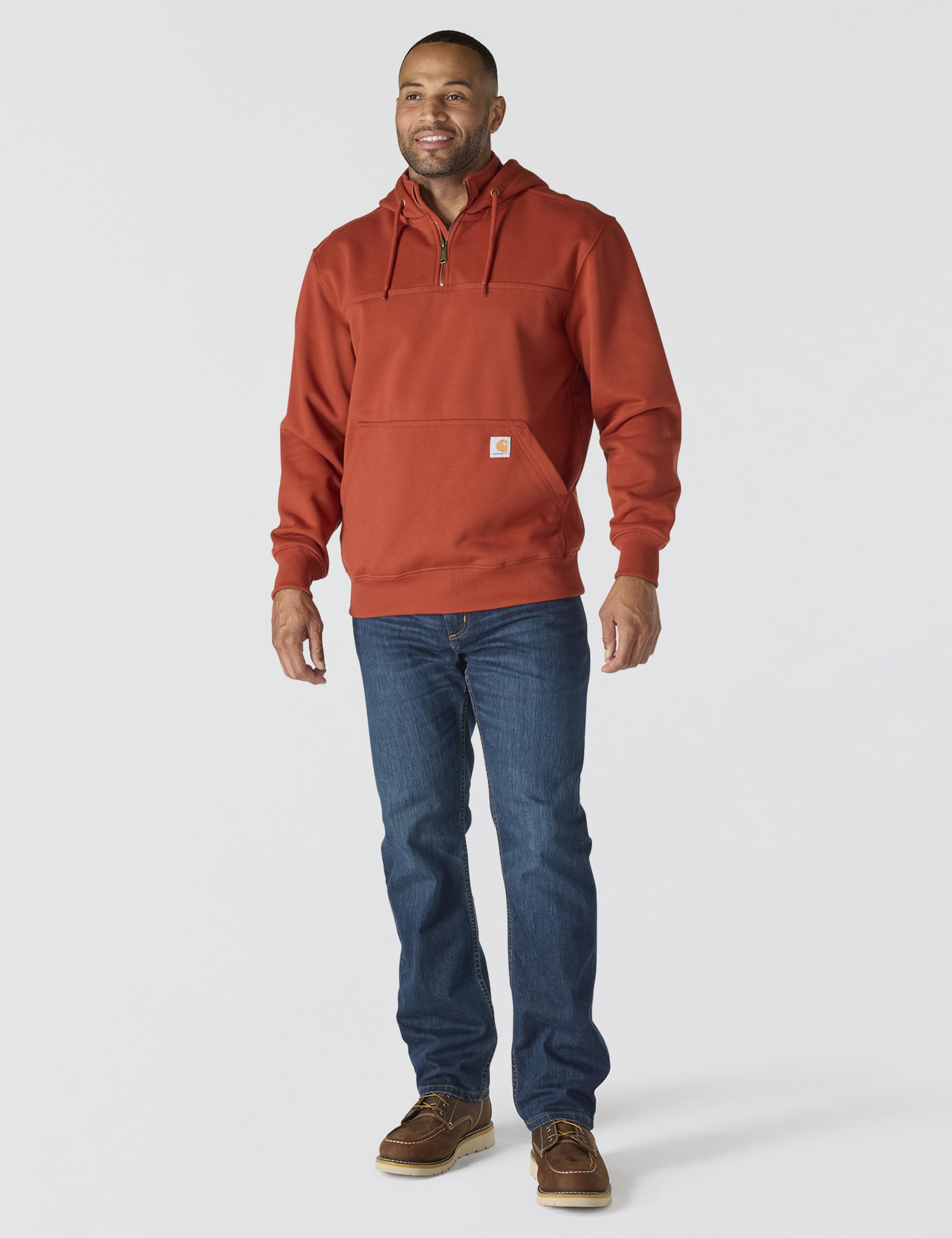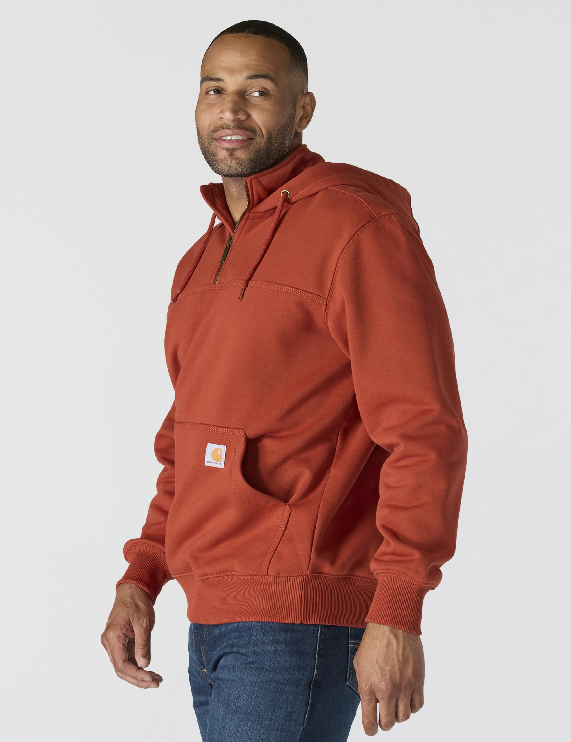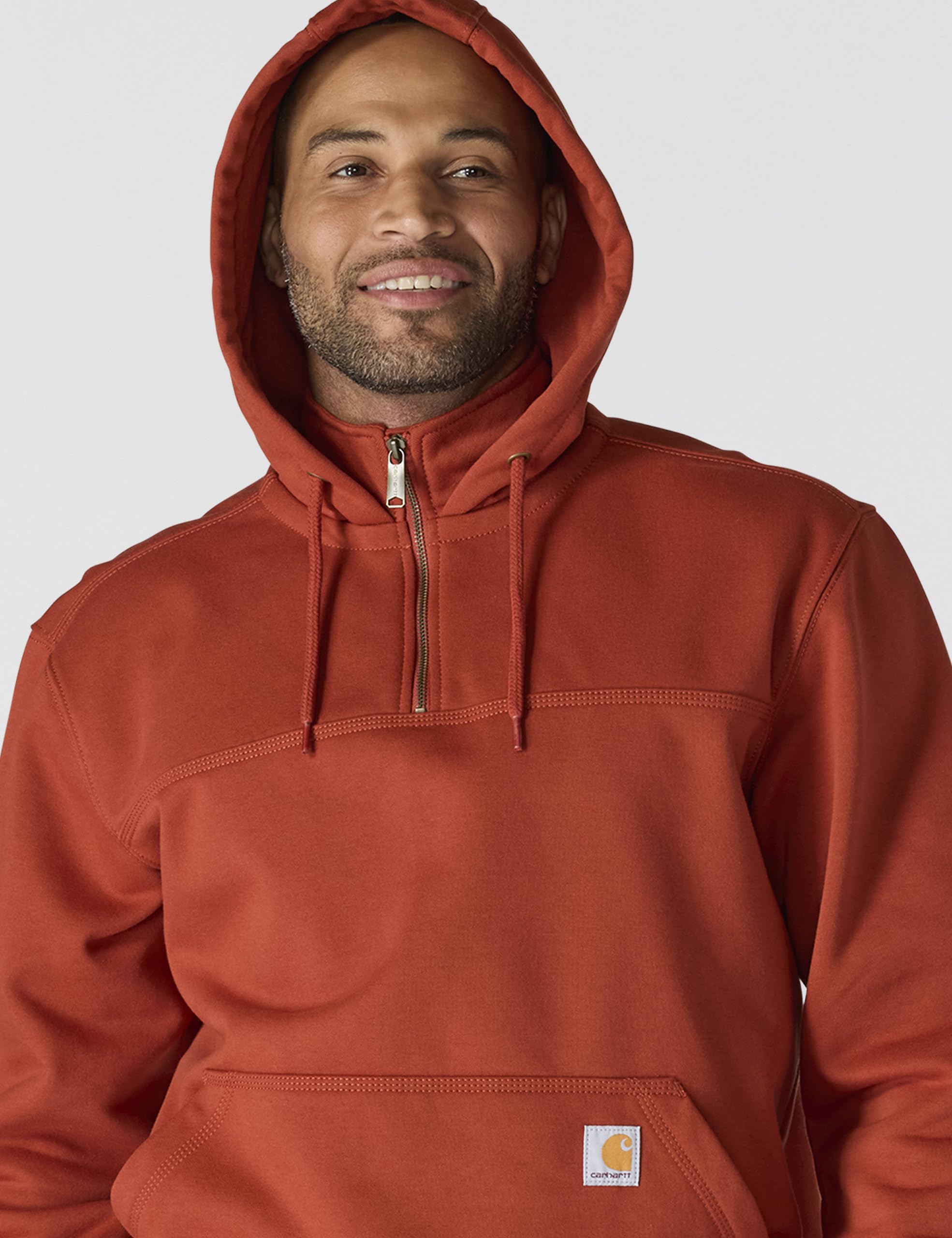 Description The heavyweight champion of sweatshirts is made of 13-ounce, 75% cotton/25% polyester fabric and has a Rain Defender durable water-repellent finish. The zip-mock collar has an 8-inch antique-finish brass zipper. It is designed with spandex-reinforced rib-knit cuffs and waistband to keep the cold out. There's an attached three-piece jersey-lined hood with draw cord and front hand-warmer pocket. The Carhartt logo is embroidered on the front left pocket.