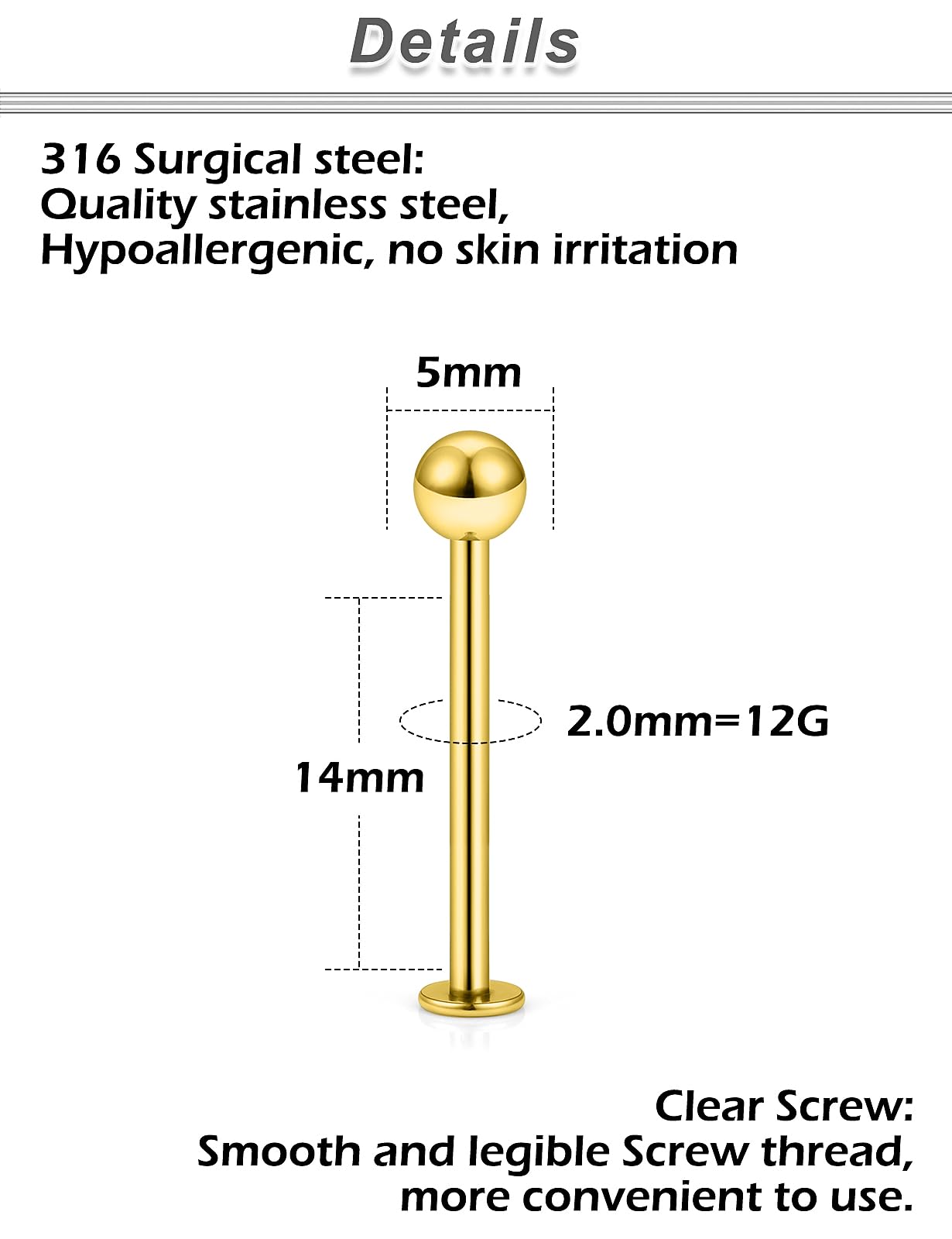 MEASUREMENTS--Lip Rings Studs Gauge Size: 12G (2.0mm); Straight Bar Length: 14mm(9/16 Inch),Top Size:5mm, The Different Sizes Made It Easy to Find the Right One for You. Color: Gold-tone.