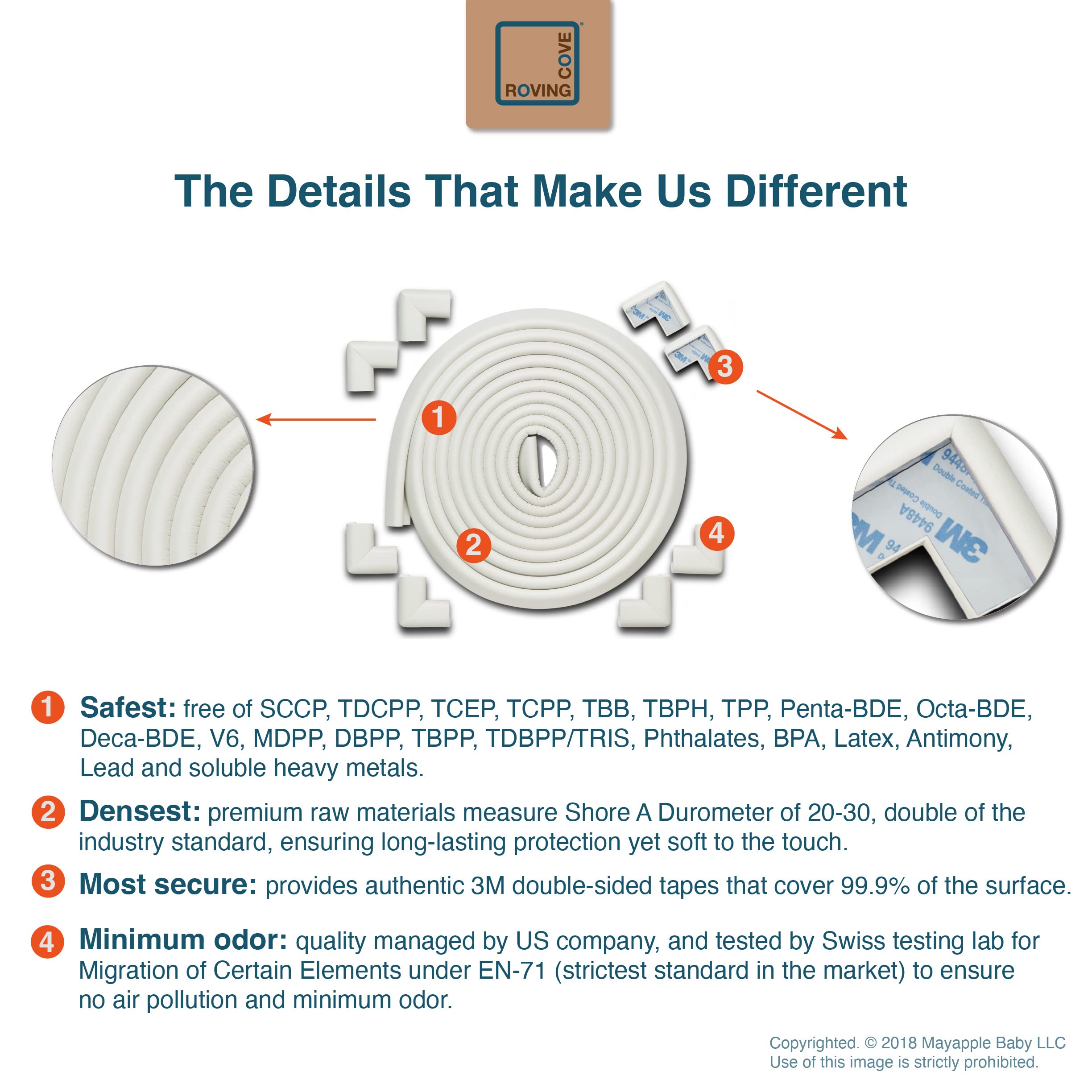 CLEAN SAFETY: Roving Cove uses safe and pure raw material and was the first brand to make foam safety bumpers without the use of toxic flame-retardant chemicals (SCCPs). Our edge corner guards contain no BPA, no phthalates, no heavy metals, no latex, no SCCPs. Inherently flame-resistant; passed flammability tests under US regulations.
